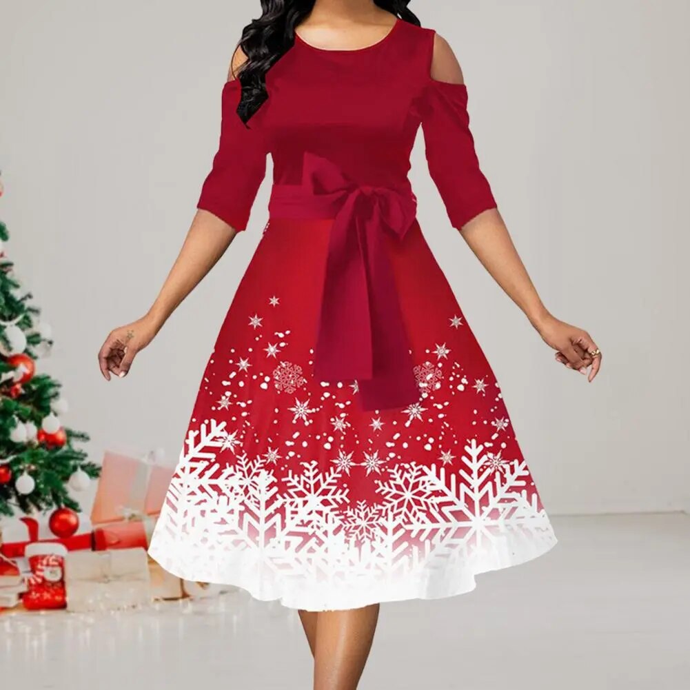 유럽과 미국 크로스 국경 여성 의류 아마존 독립 역 크리스마스 눈송이 승무원 목 오픈 숄더 벨트 큰 스윙 새로운 원피스