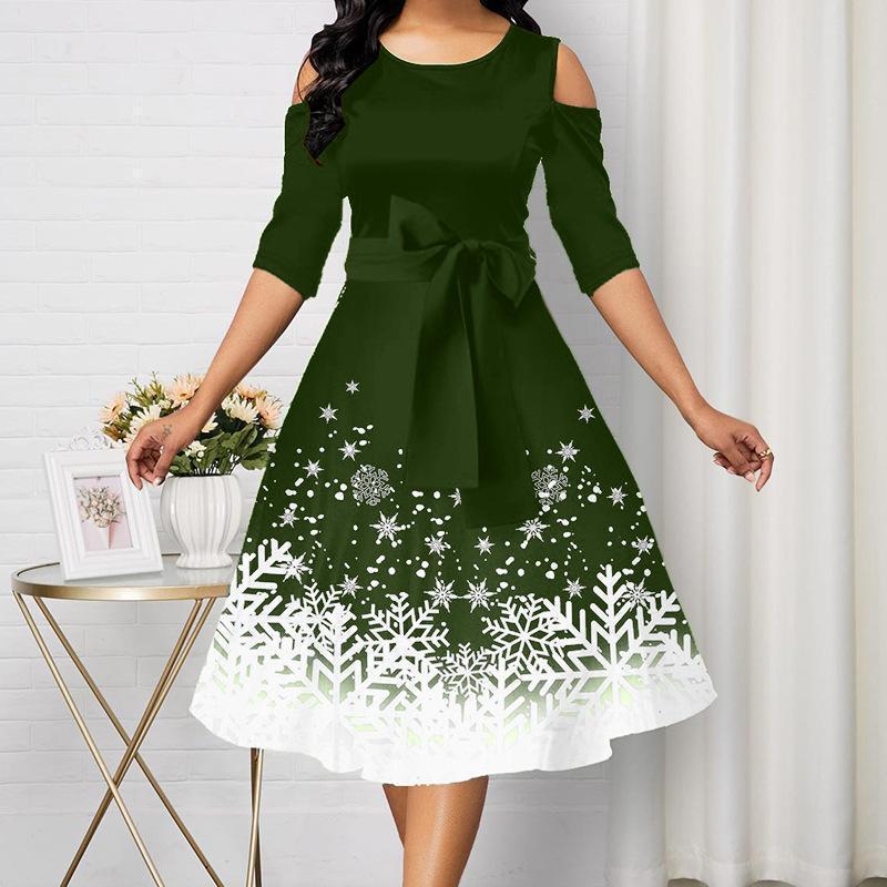 유럽과 미국 크로스 국경 여성 의류 아마존 독립 역 크리스마스 눈송이 승무원 목 오픈 숄더 벨트 큰 스윙 새로운 원피스스토어 가기