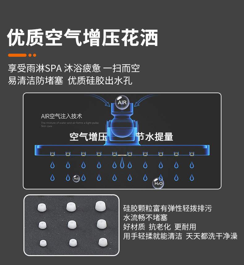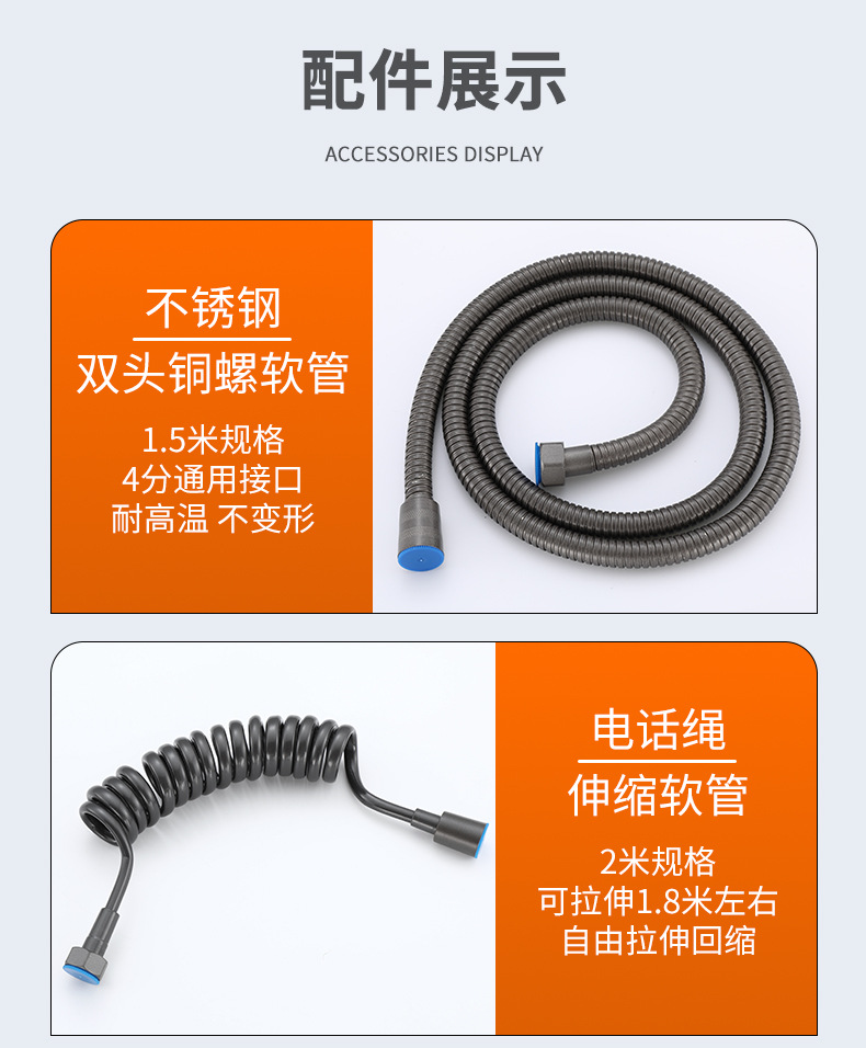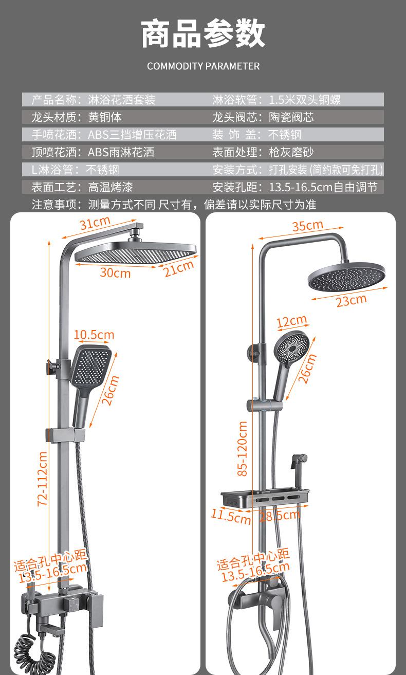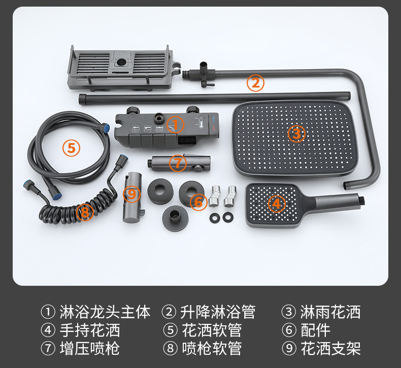 총 회색 욕실 샤워 헤드 세트 뜨겁고 차가운 4 기어 비 가압 샤워 헤드 구리 본체 수도꼭지 국경