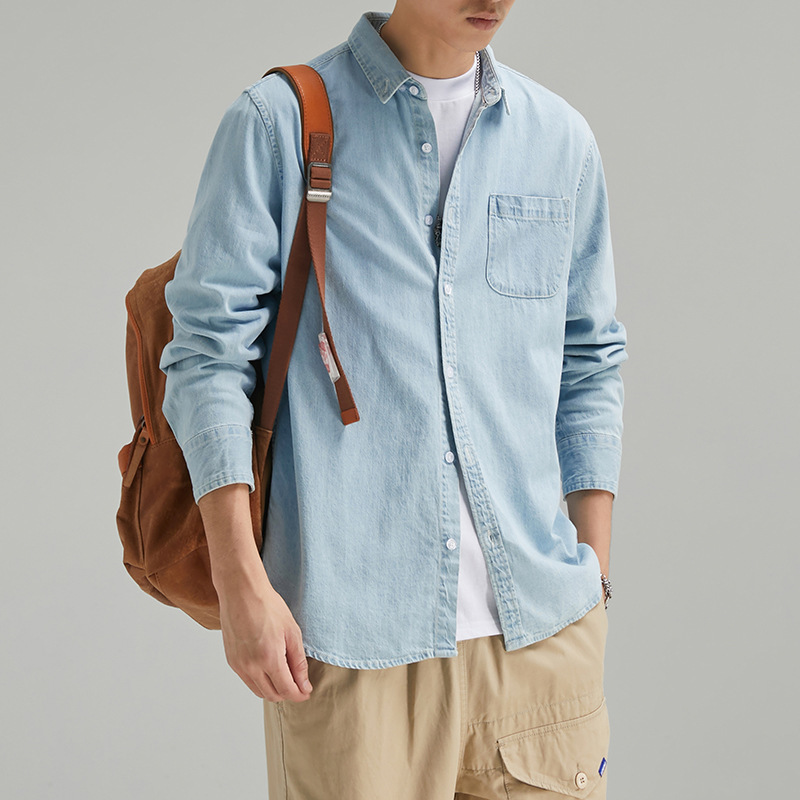 봄 남자의 얇은 옷깃 데님 셔츠 남자의 긴팔 단색 캐주얼 남자의 나가는 셔츠 남자의 빈티지 빨 수있는 안감스토어 가기