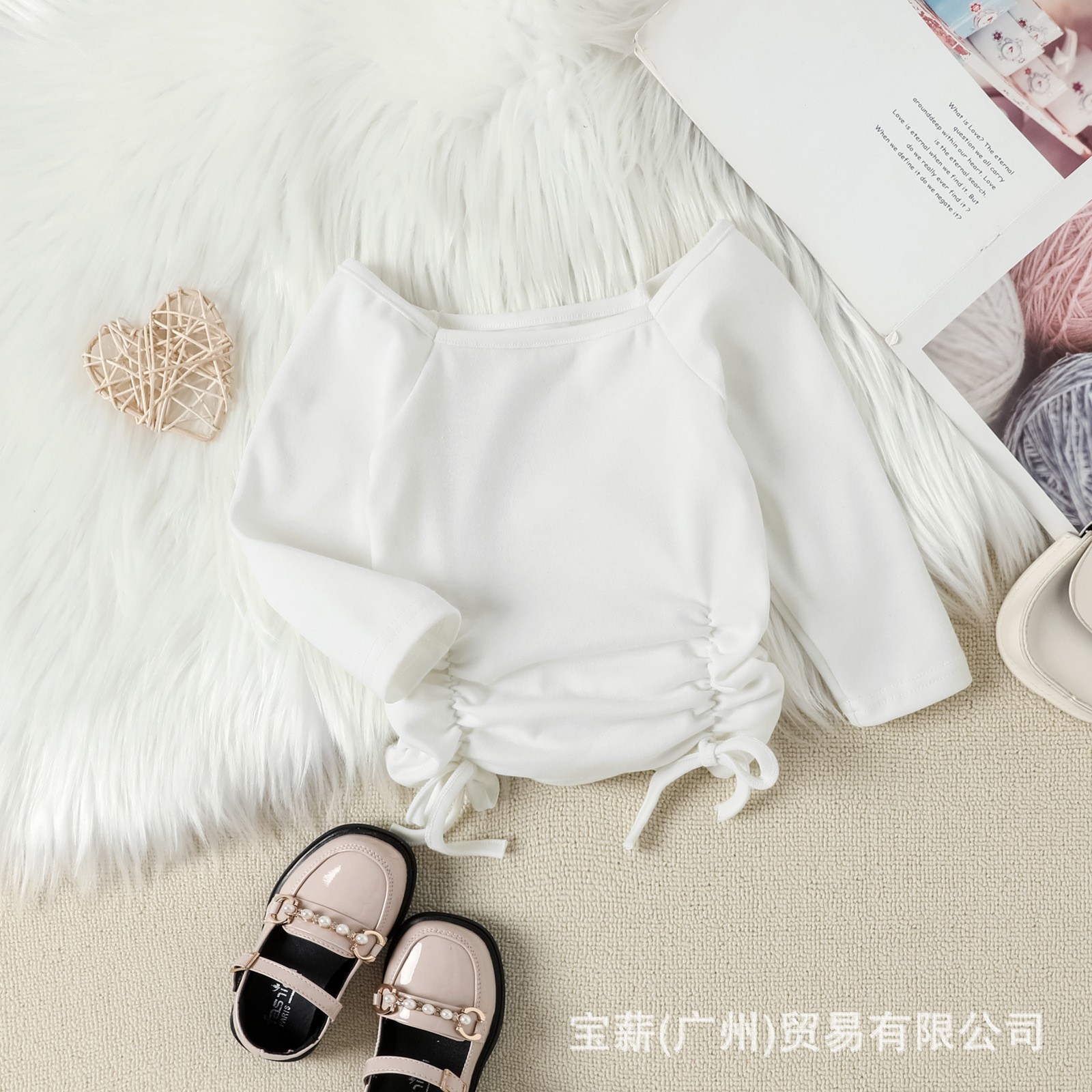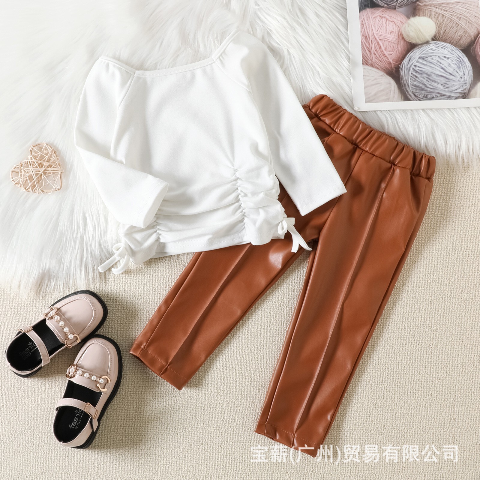 Baopin 아동복 크로스 보더 가을과 겨울 새로운 유럽과 미국 소녀 세트 단색 긴 소매 졸라매는 끈 PU 가죽 바지 투피스 세트스토어 가기