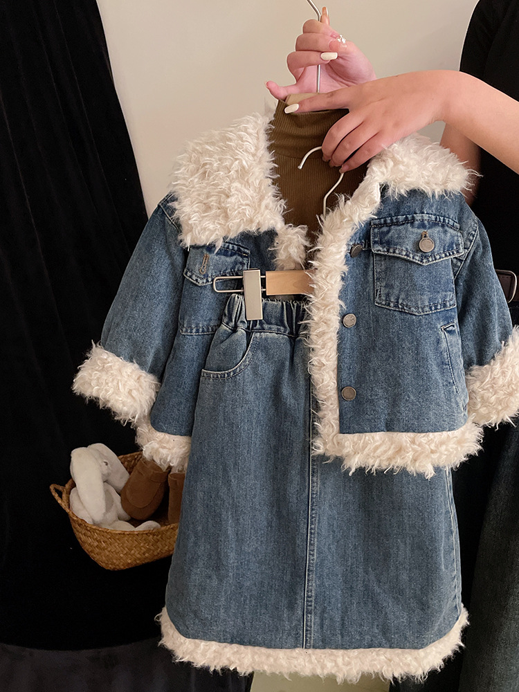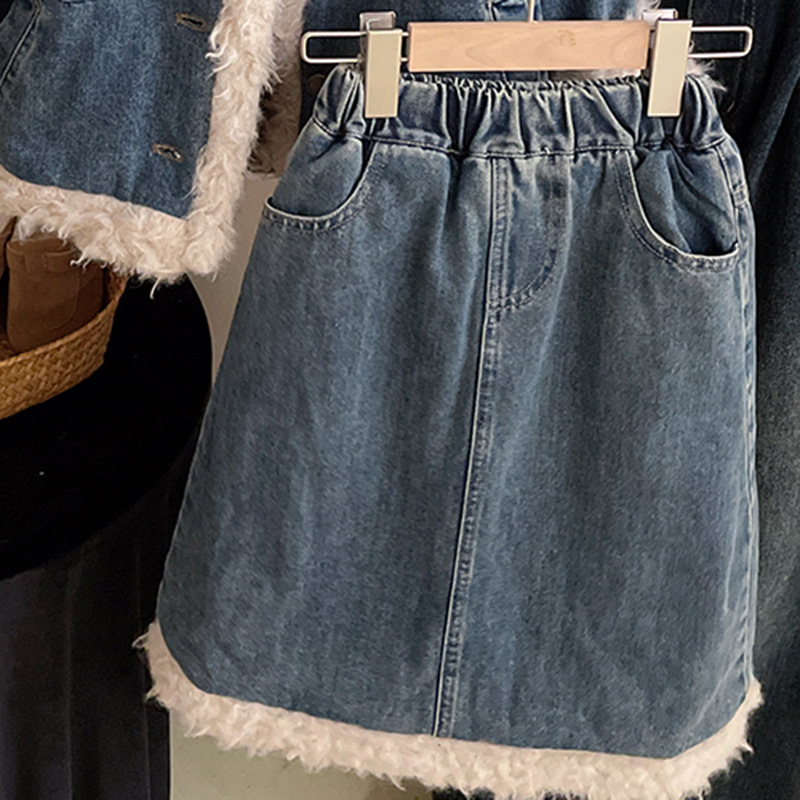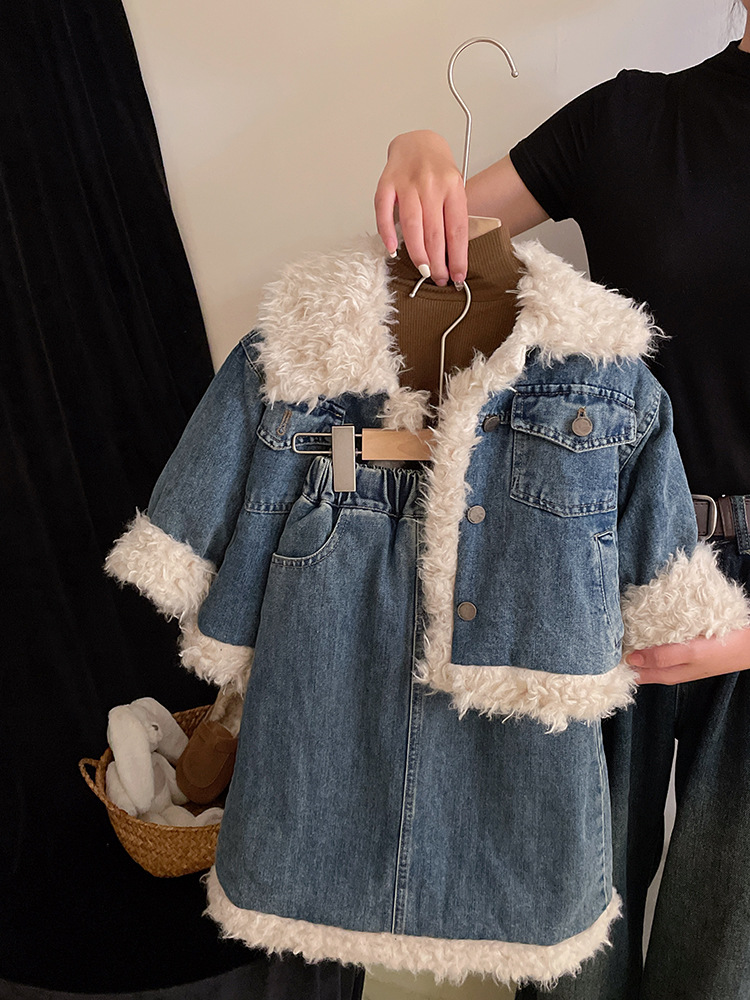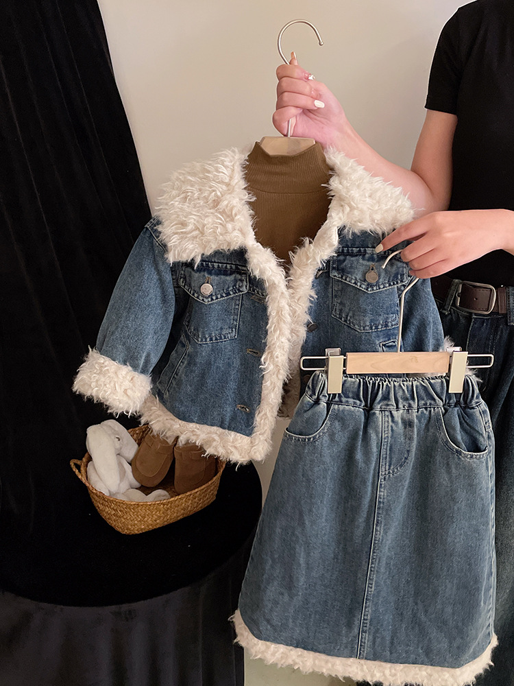 2023 가을과 겨울 새로운 빈티지 양고기 울 데님 면 패딩 재킷 소녀 느슨한 캐주얼 두꺼운 데님 스커트 세트스토어 가기