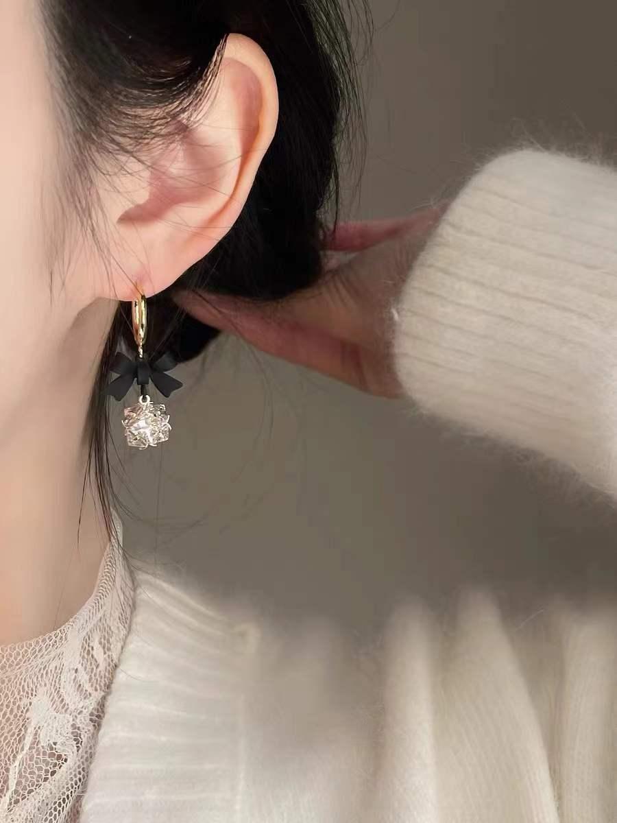 925 실버 바늘 ~ 블랙 보우 귀걸이 틈새 레트로 고급 모기 향 플레이트 이어 클립 귀 구멍이없는 여성의 귀