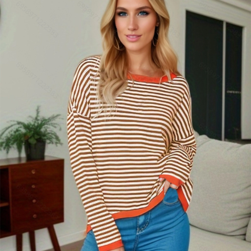 크로스 보더 여성용 가을과 겨울 라운드 넥 대비 트리밍 스트라이프 숄더 스웨터 유럽과 미국의 루즈한 모든 매치 긴팔 탑스토어 가기