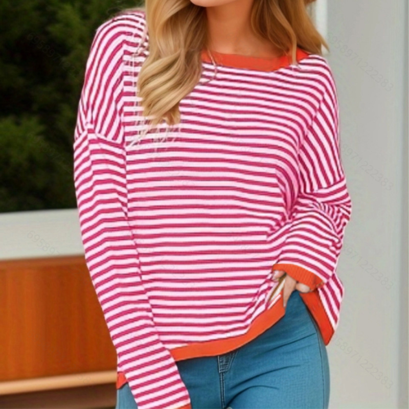크로스 보더 여성용 가을과 겨울 라운드 넥 대비 트리밍 스트라이프 숄더 스웨터 유럽과 미국의 루즈한 모든 매치 긴팔 탑