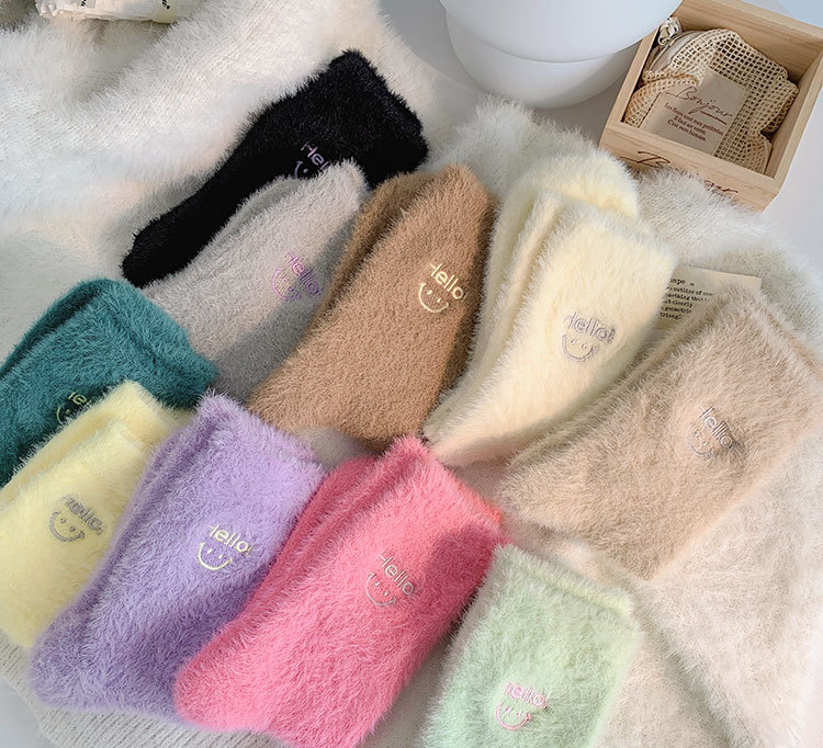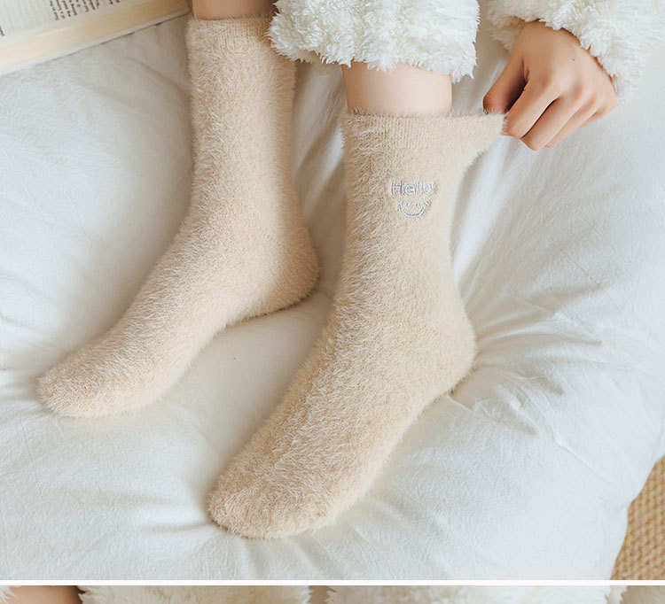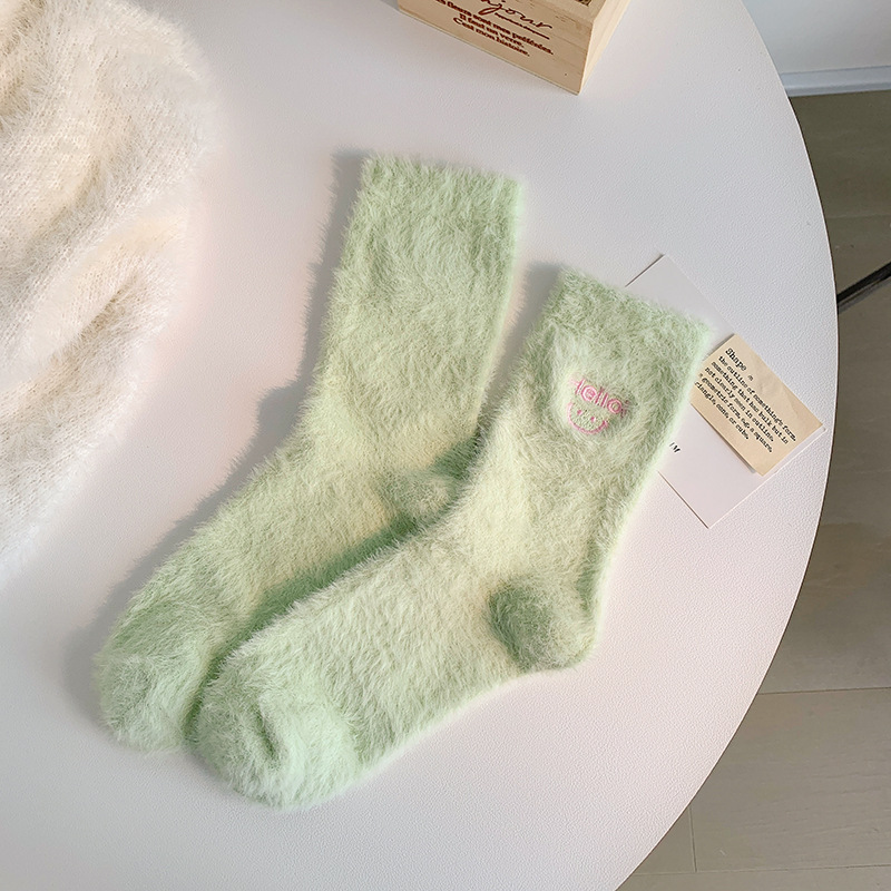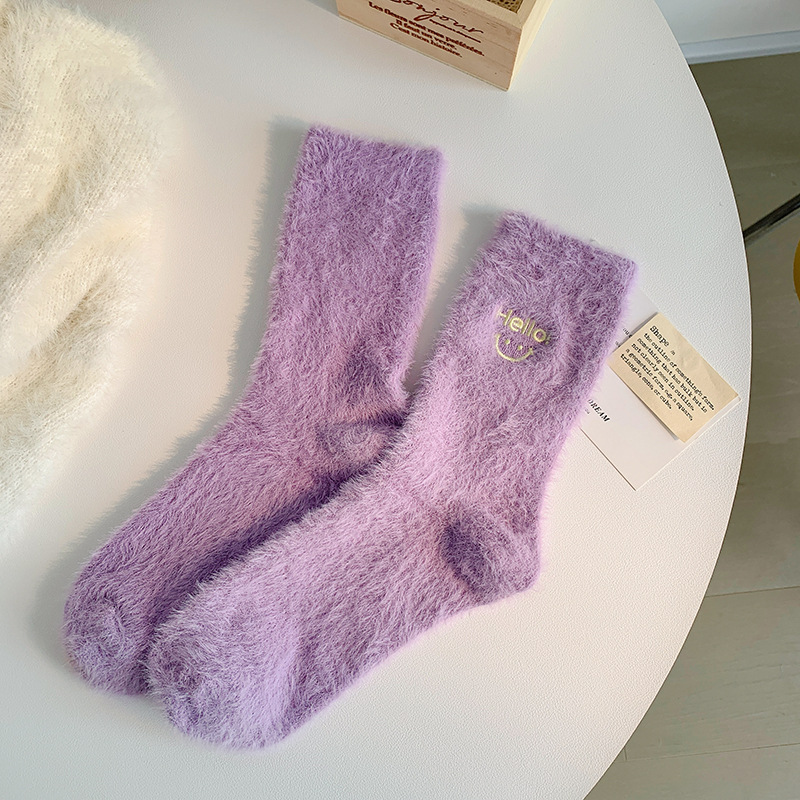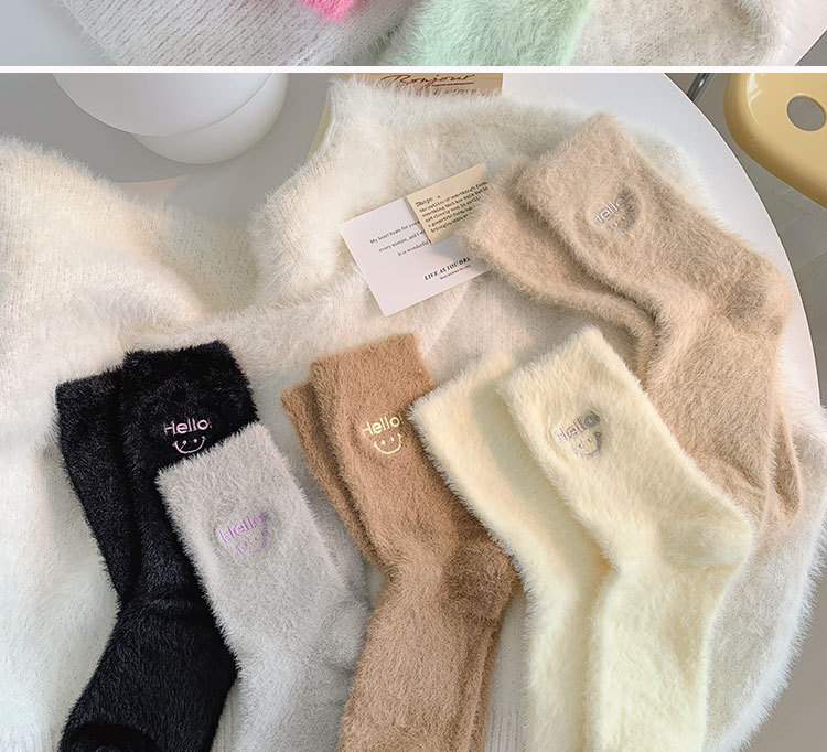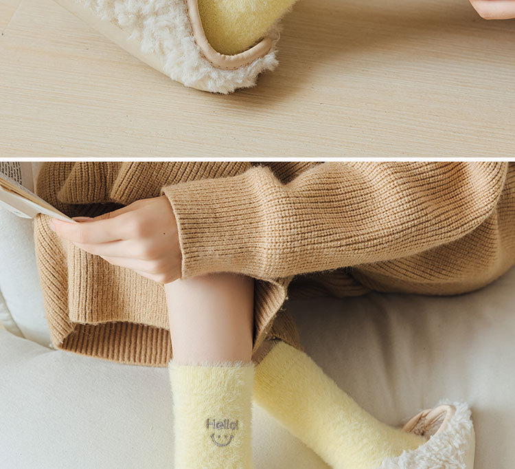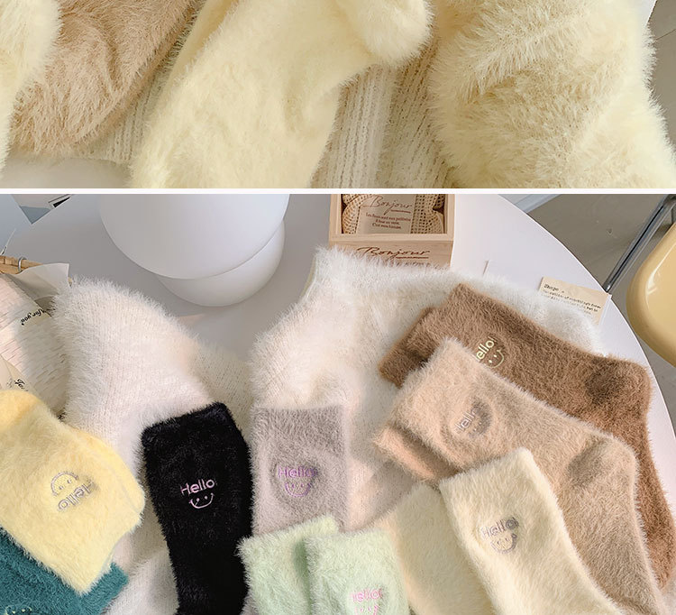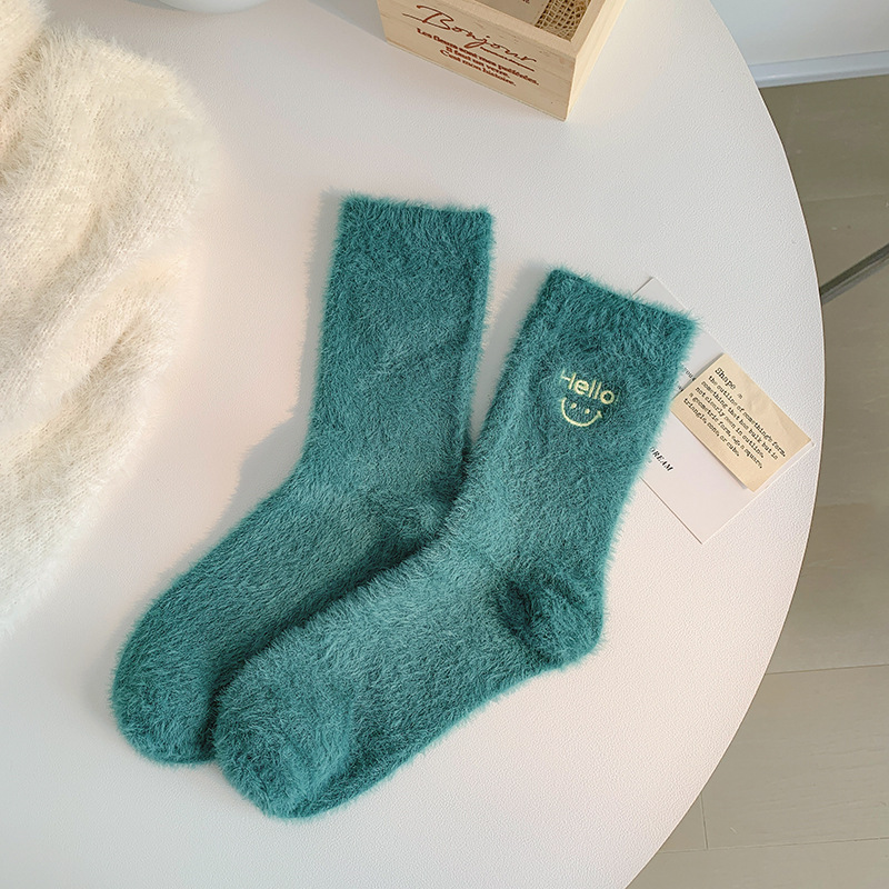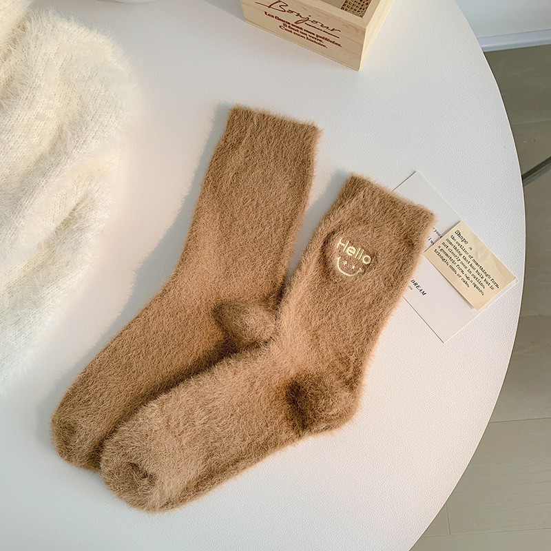 가을과 겨울 새로운 밍크 벨벳 양말 여성 양말 스마일 얼굴 자수 기모 두꺼운 따뜻한 방한 아기 양말 스타킹