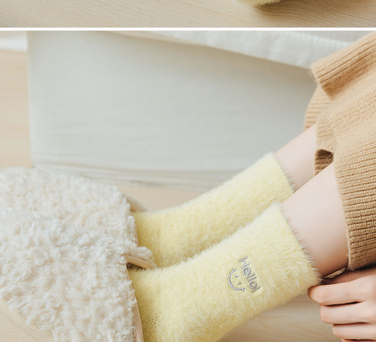 가을과 겨울 새로운 밍크 벨벳 양말 여성 양말 스마일 얼굴 자수 기모 두꺼운 따뜻한 방한 아기 양말 스타킹스토어 가기