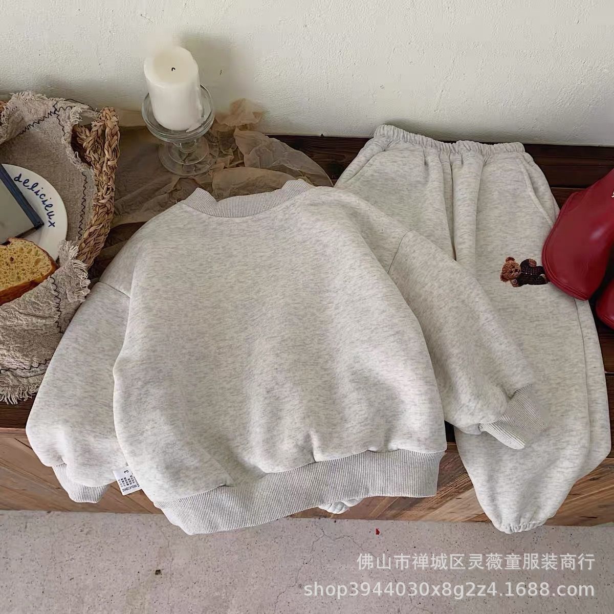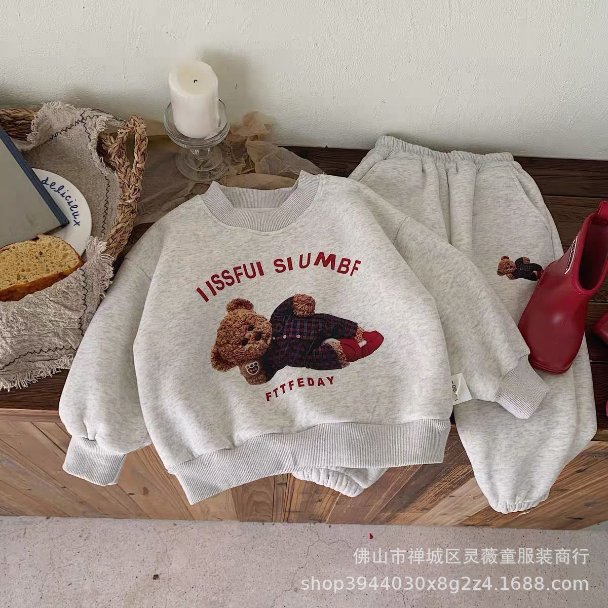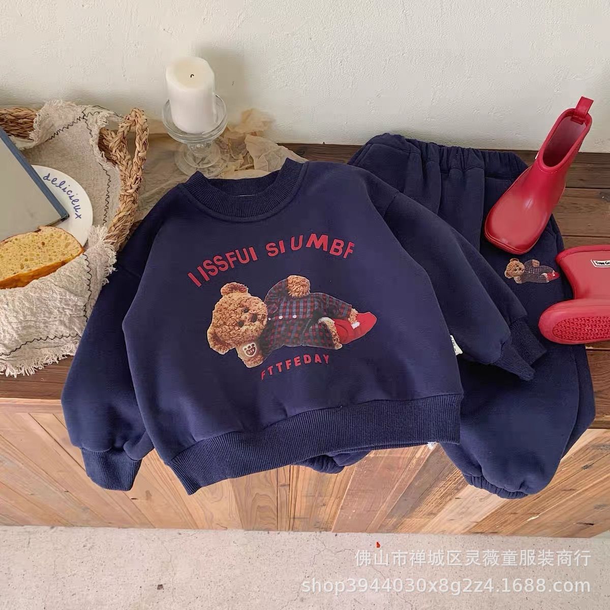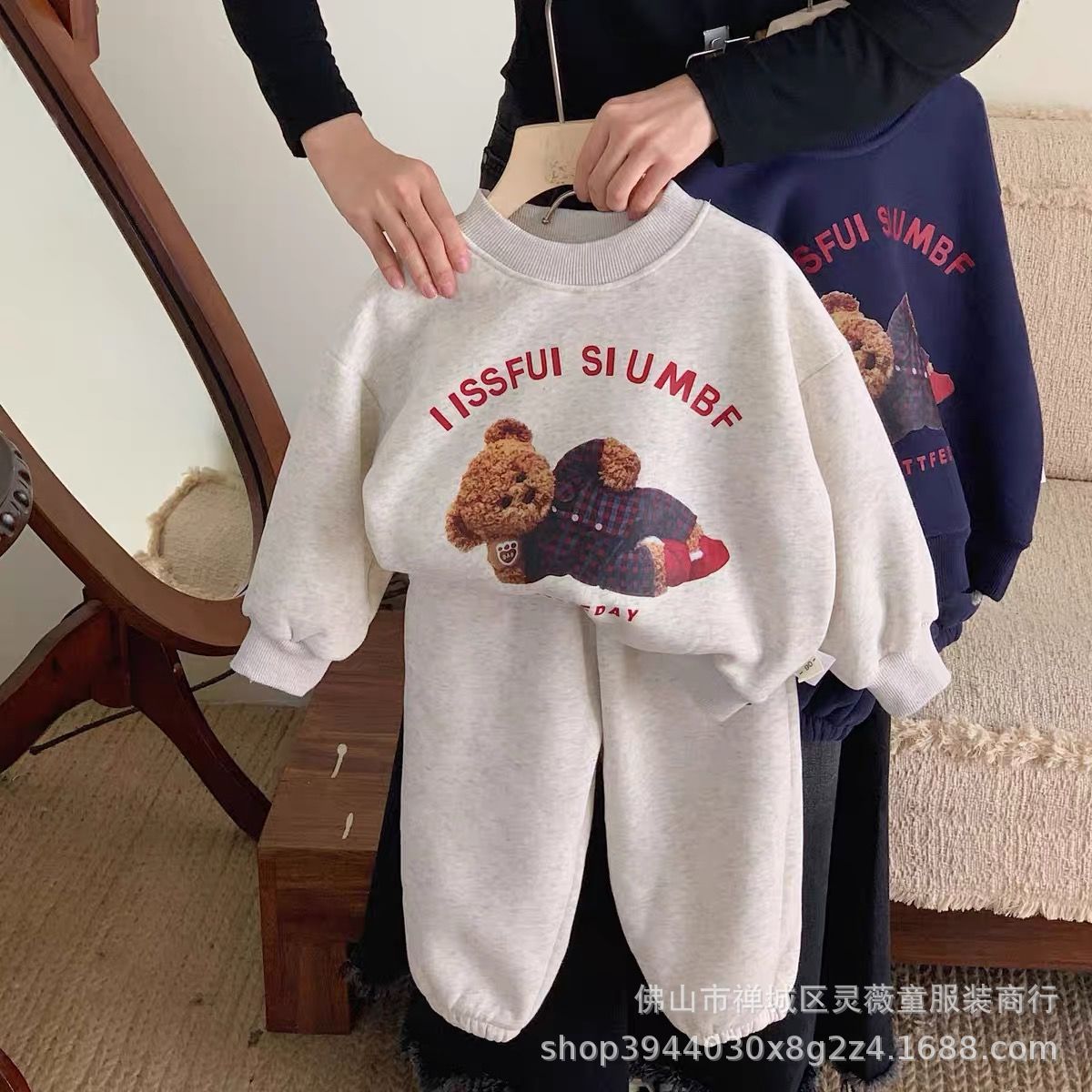 남아 여아용 후리스 스웨트셔츠, 가을 겨울 아동복 세트, 2026년 한국판 신상 만화 곰돌이 아기 두꺼운 후리스 후드티