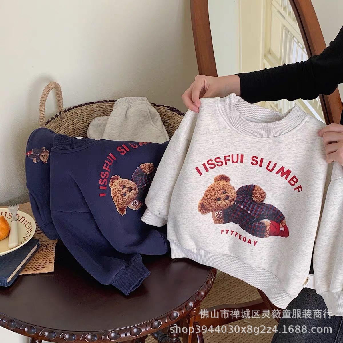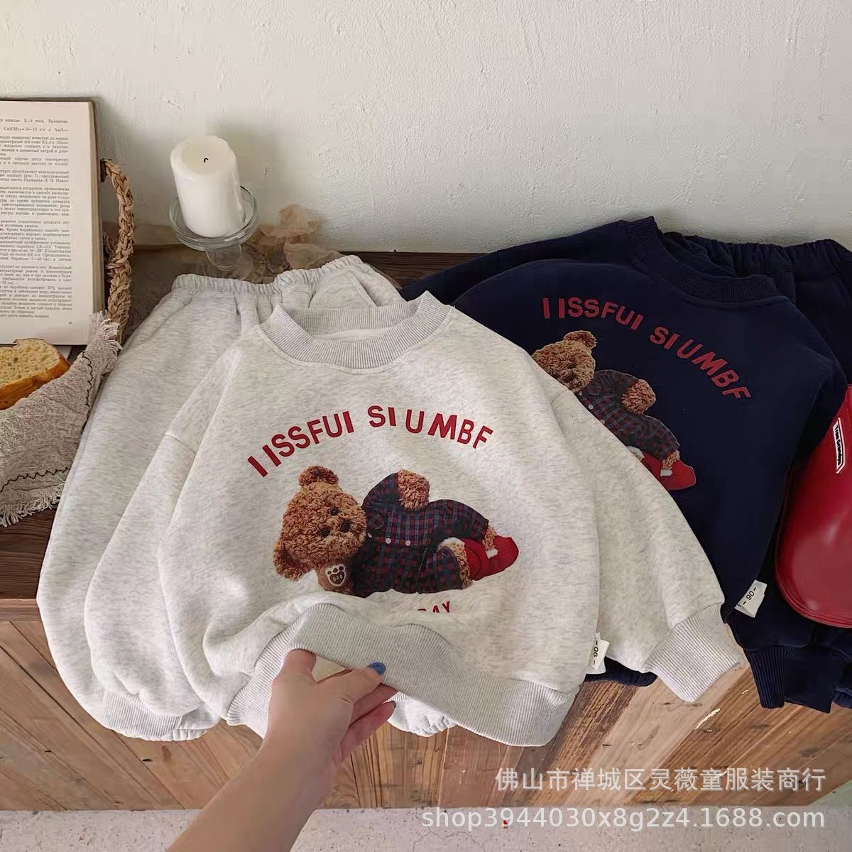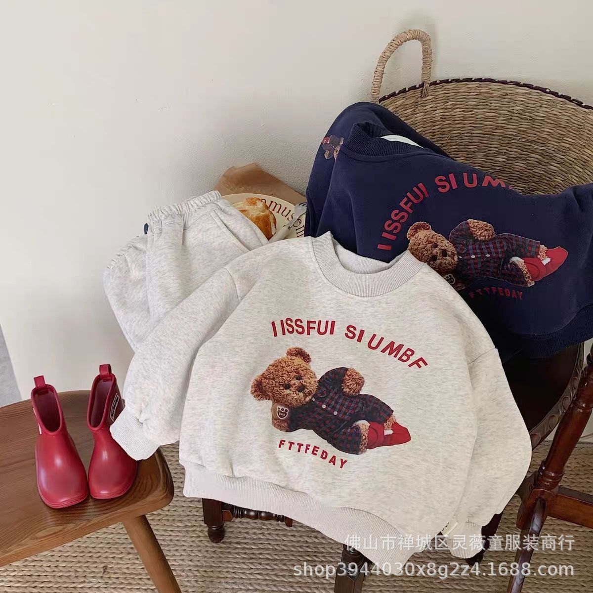 남아 여아용 후리스 스웨트셔츠, 가을 겨울 아동복 세트, 2026년 한국판 신상 만화 곰돌이 아기 두꺼운 후리스 후드티스토어 가기