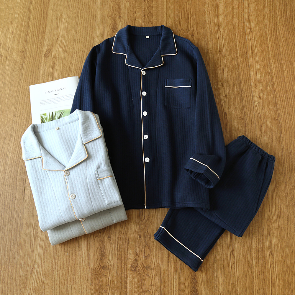 잠옷 남자의 가을과 겨울 두꺼운 순면 긴 소매 가정 옷 얇은 면 샌드위치 공기 면 세트 단색 단순
