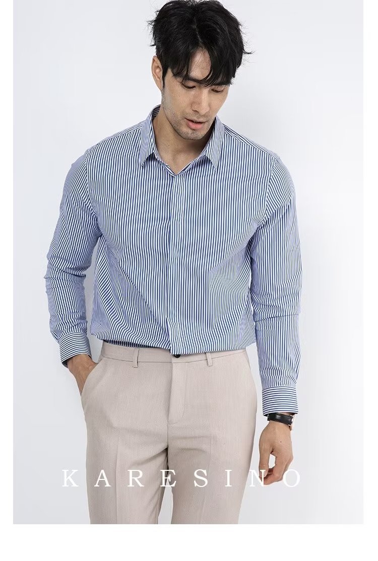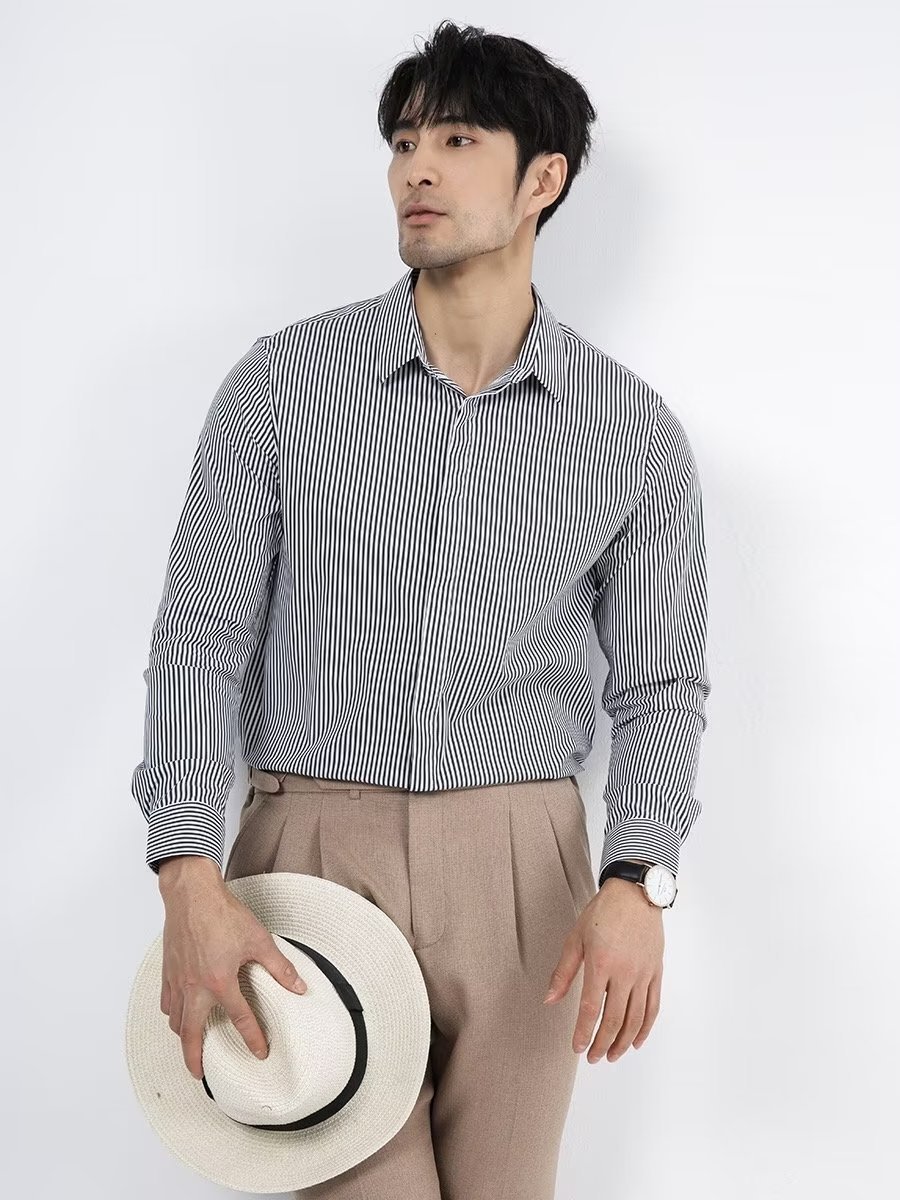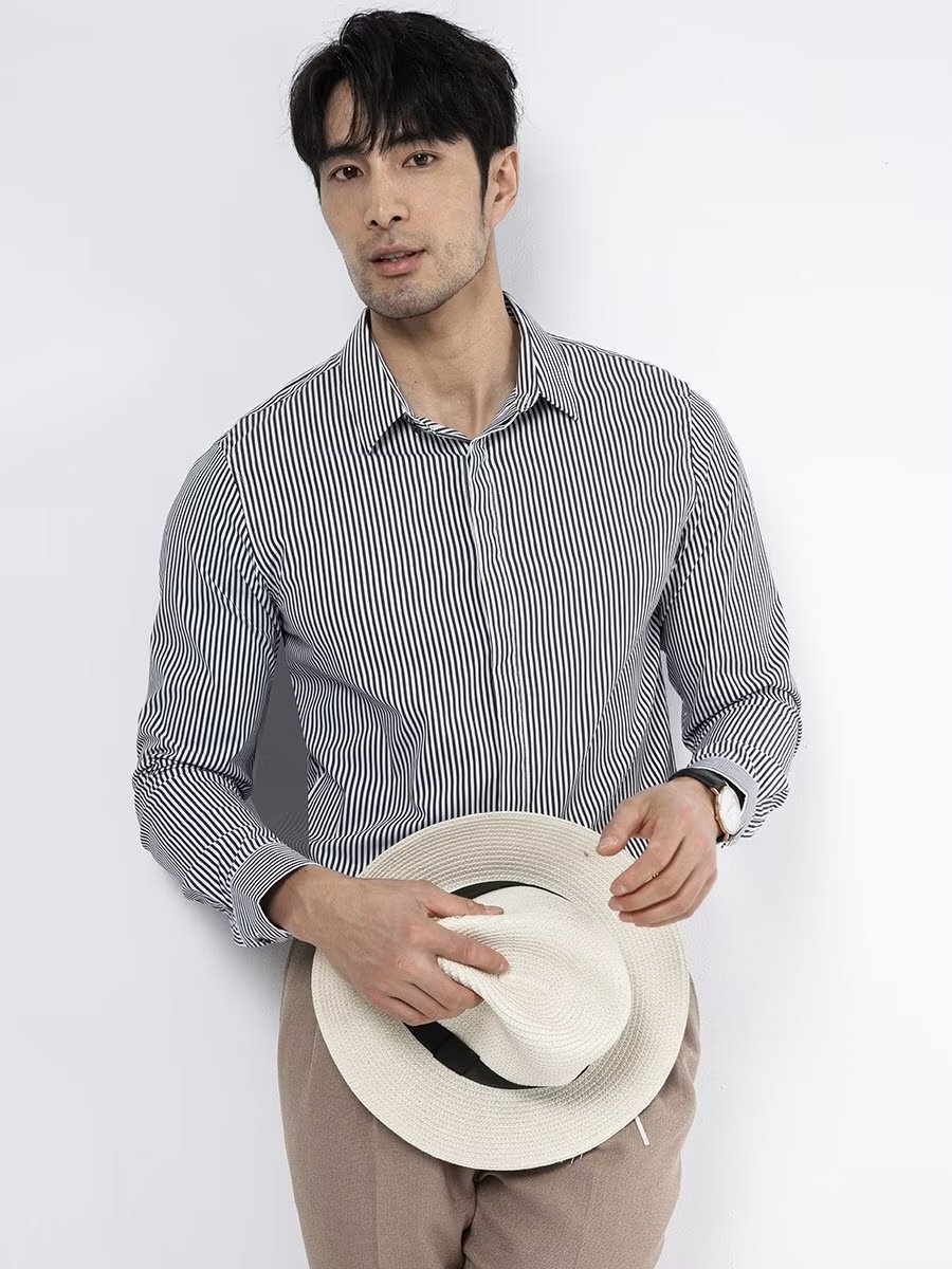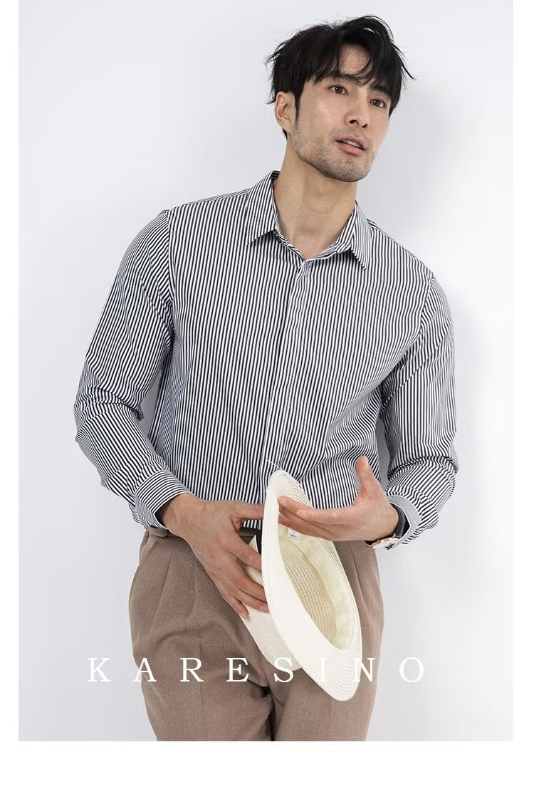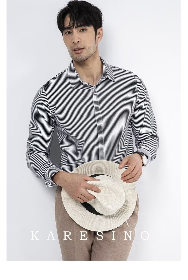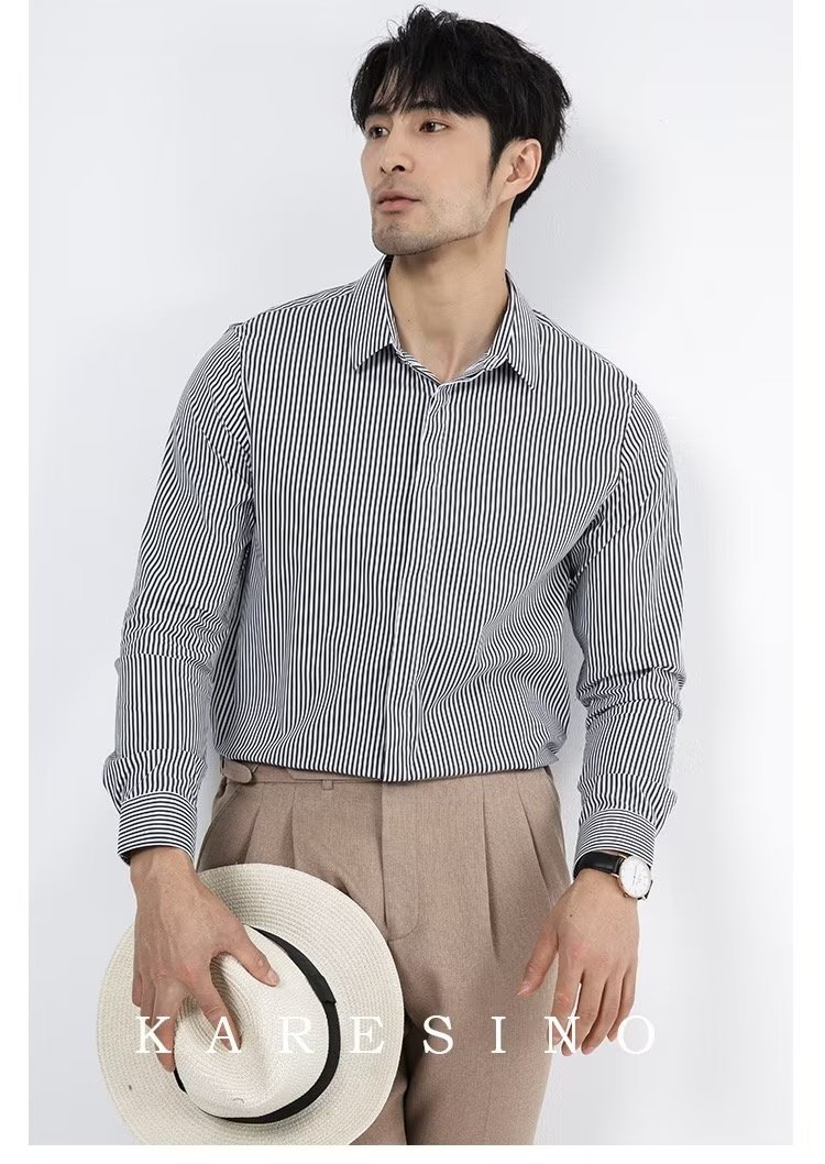 봄과 가을 비즈니스 정장 착용 가벼운 럭셔리 스트라이프 스트레치 셔츠 남성용 긴 소매 트렌디 한 숨겨진 버클 하이 엔드 슬림 핏 하이 엔드 캐주얼스토어 가기