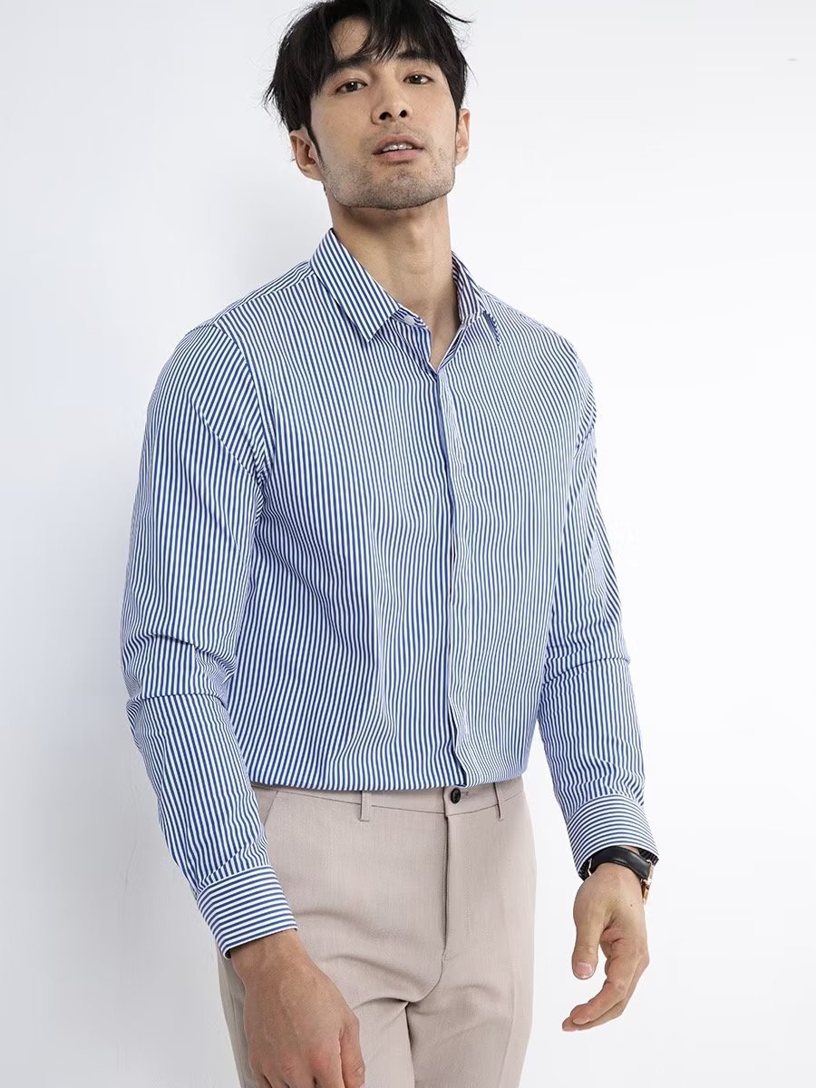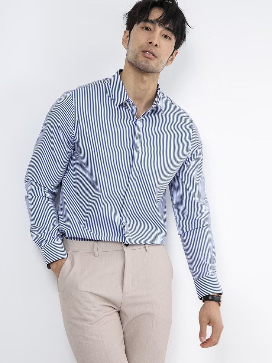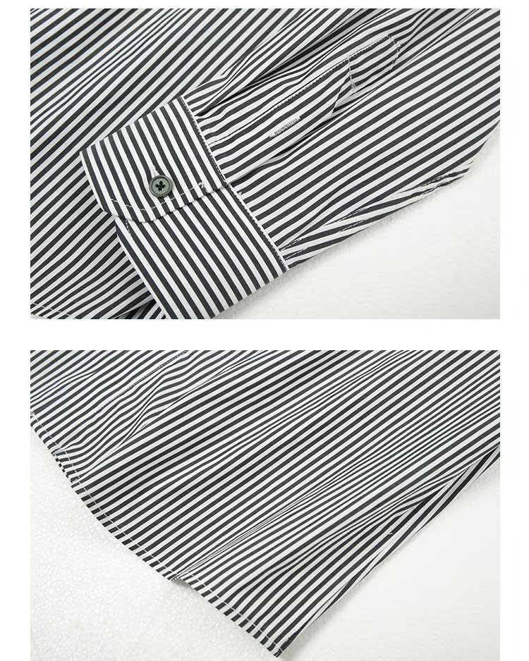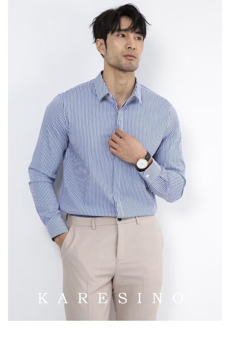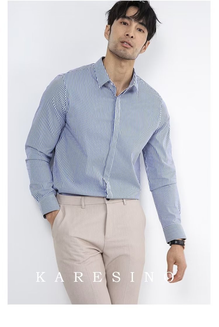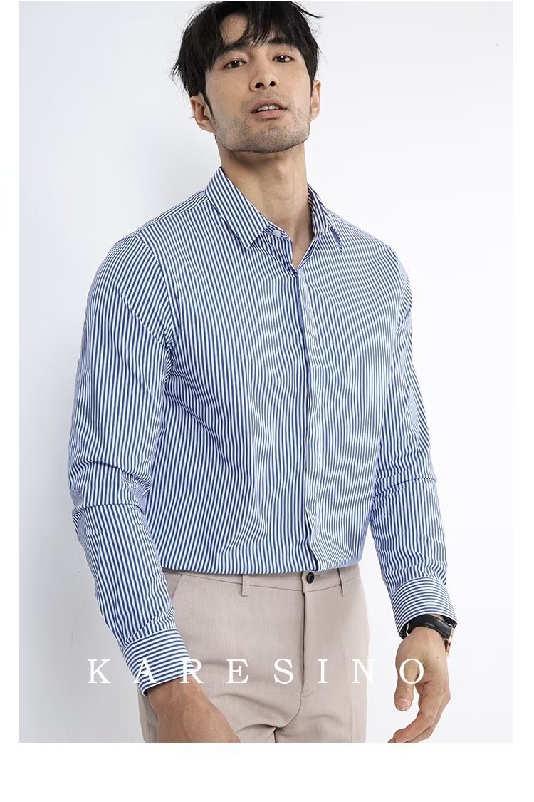 봄과 가을 비즈니스 정장 착용 가벼운 럭셔리 스트라이프 스트레치 셔츠 남성용 긴 소매 트렌디 한 숨겨진 버클 하이 엔드 슬림 핏 하이 엔드 캐주얼스토어 가기