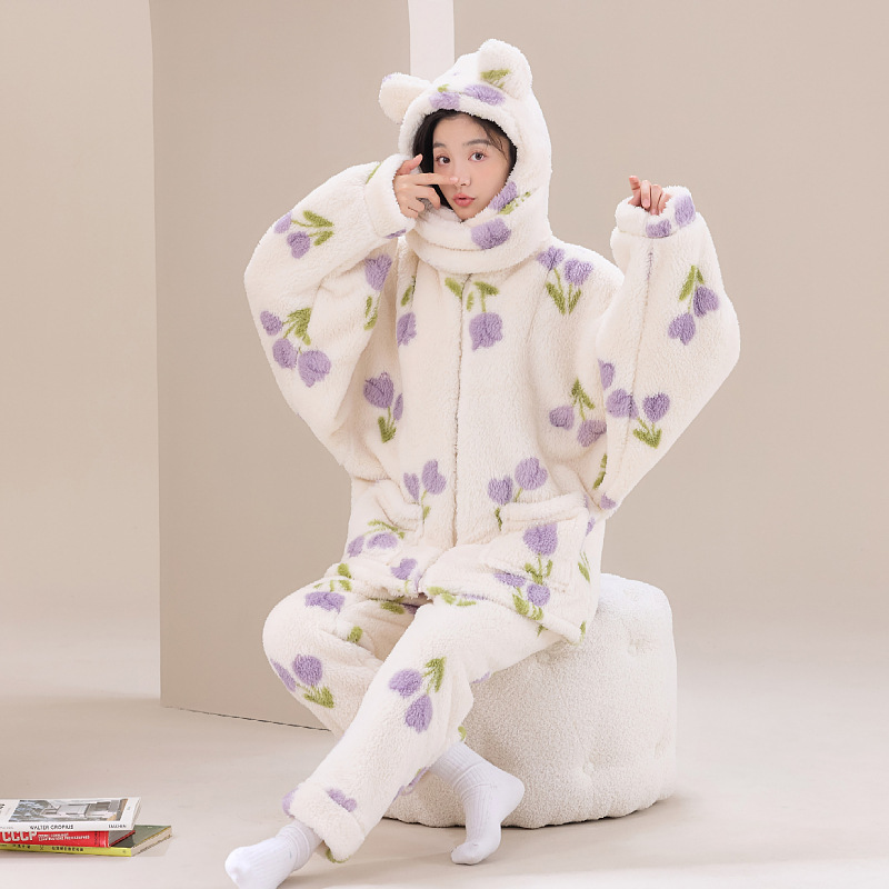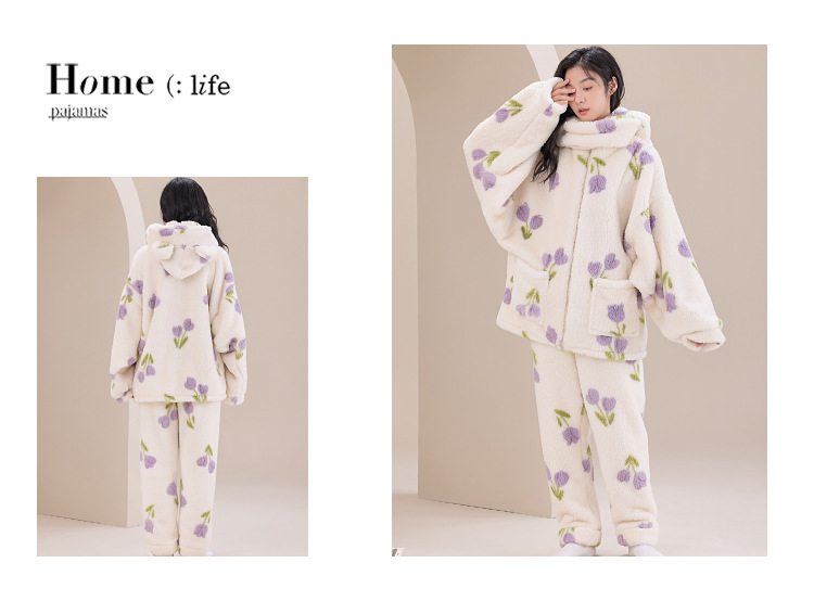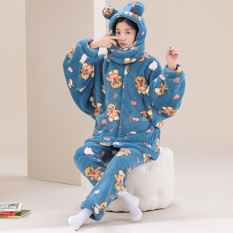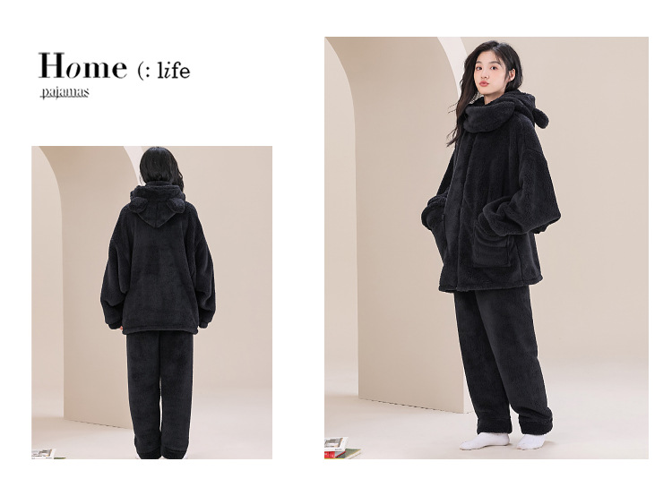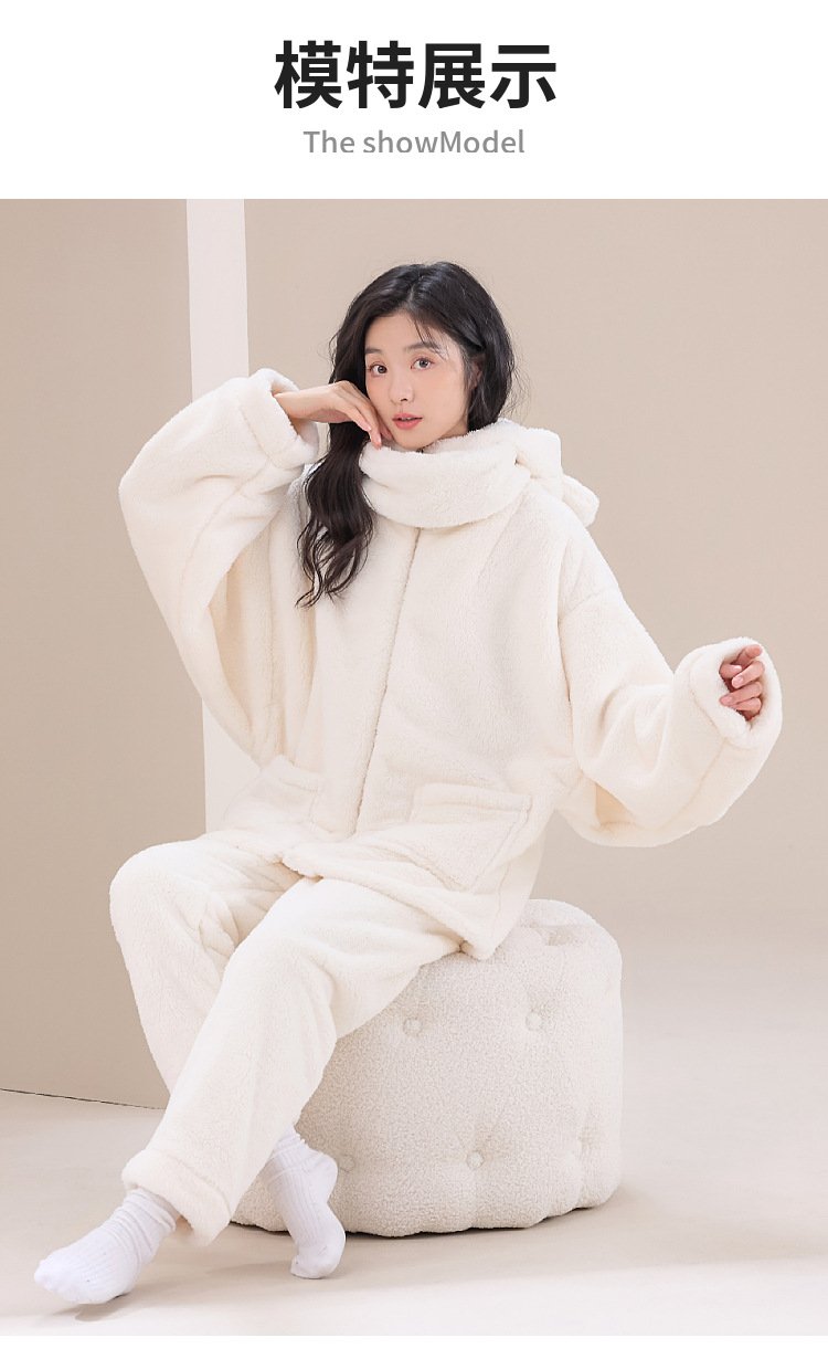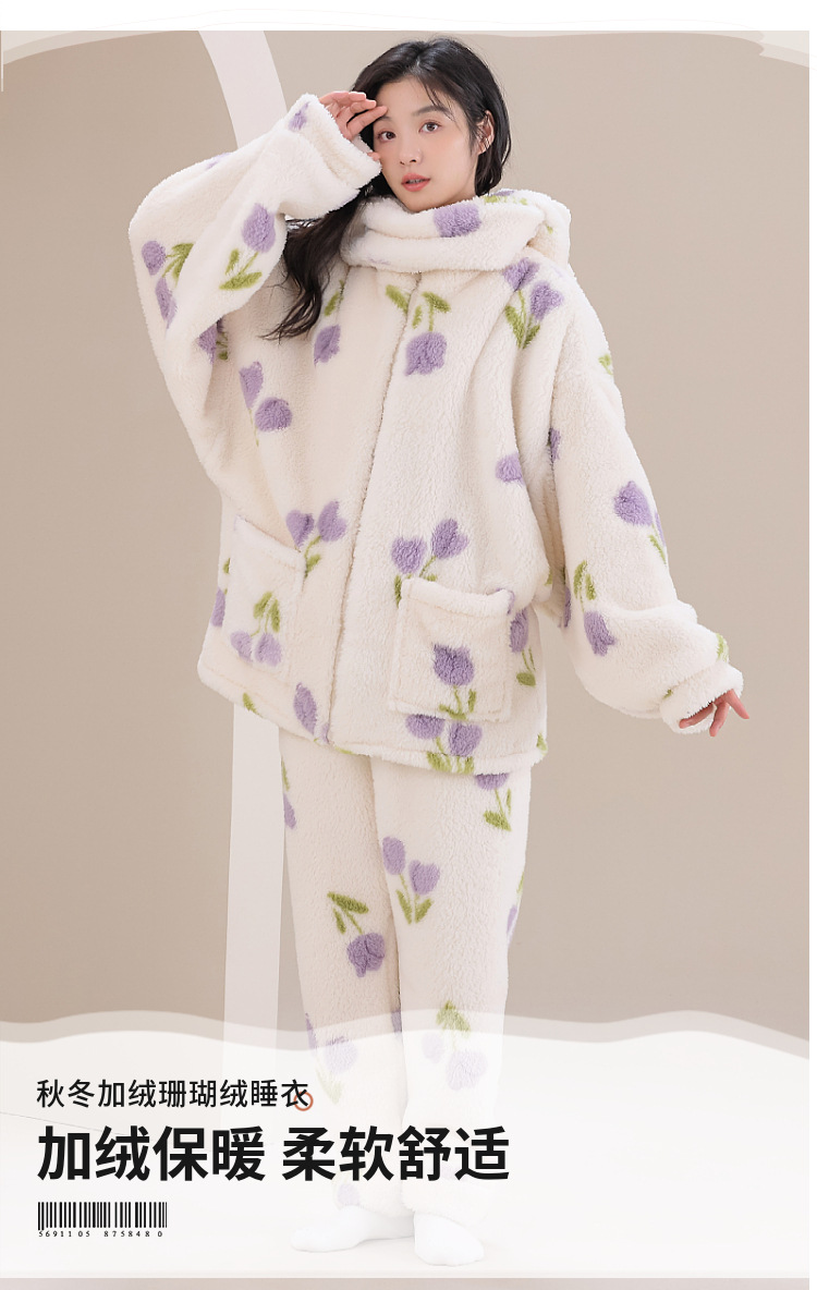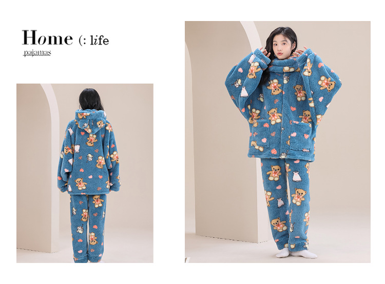 23 가을과 겨울 새로운 기모 두꺼운 가정 옷 잠옷은 학생과 여성 후드 산호 양털 따뜻한 세트 밖에서 착용 할 수 있습니다스토어 가기