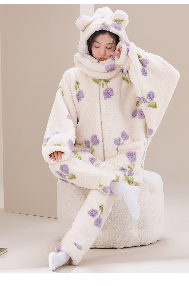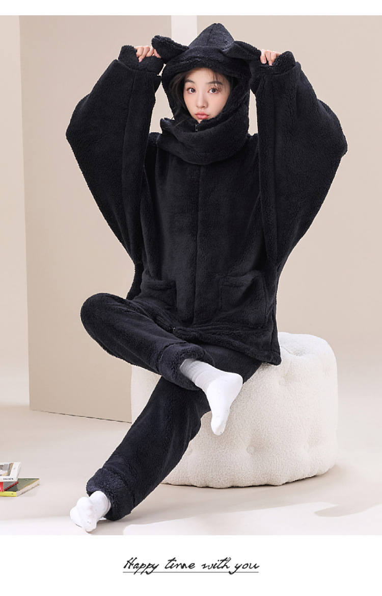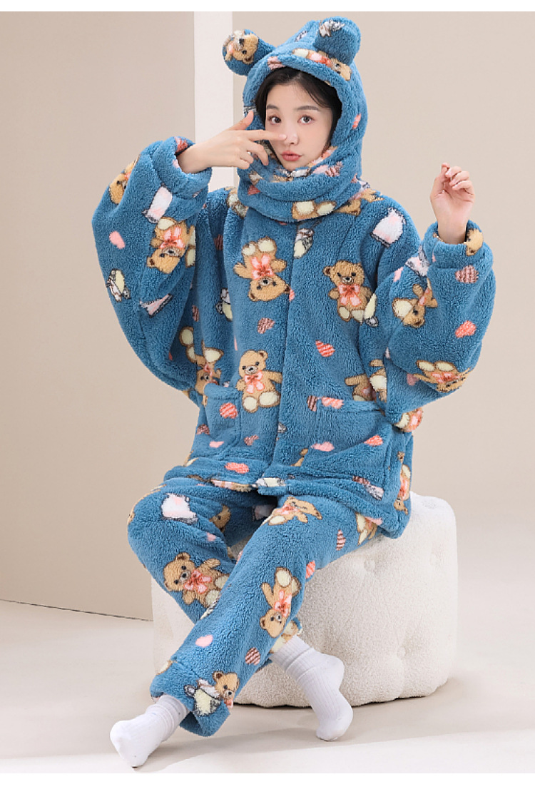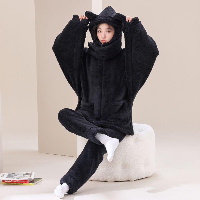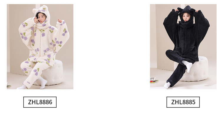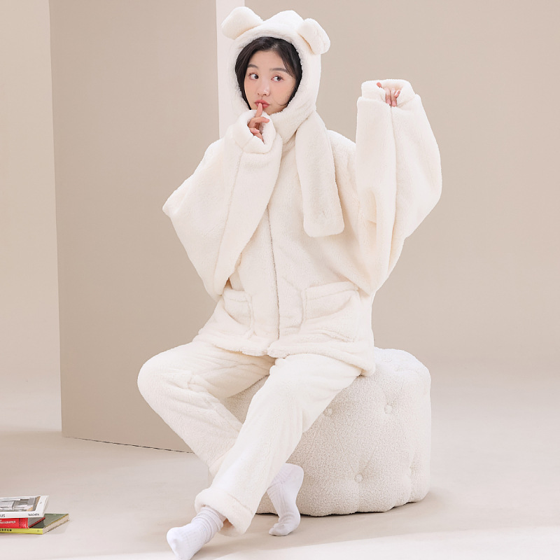 23 가을과 겨울 새로운 기모 두꺼운 가정 옷 잠옷은 학생과 여성 후드 산호 양털 따뜻한 세트 밖에서 착용 할 수 있습니다