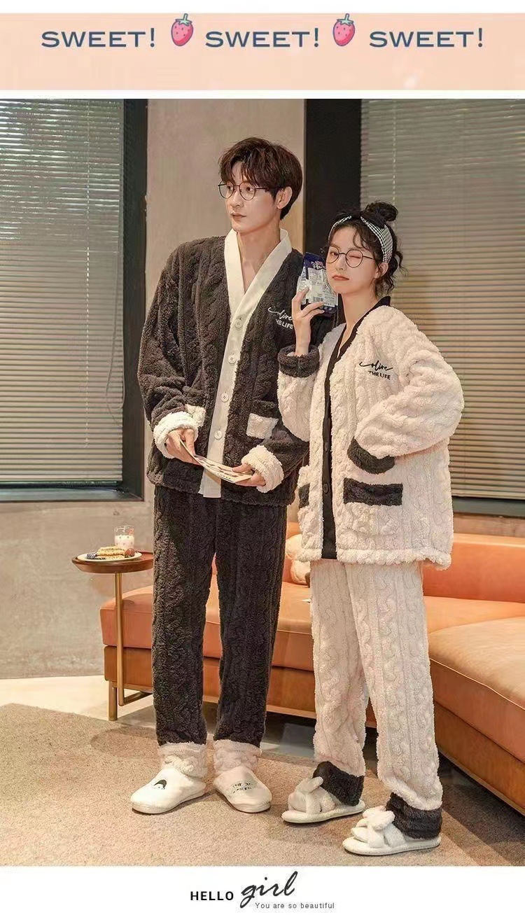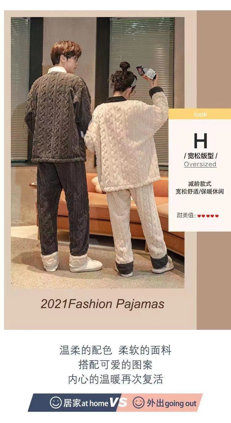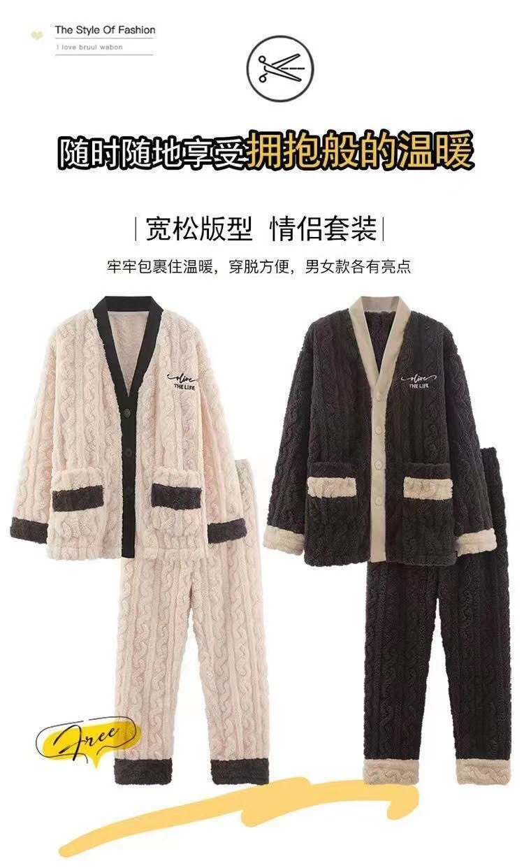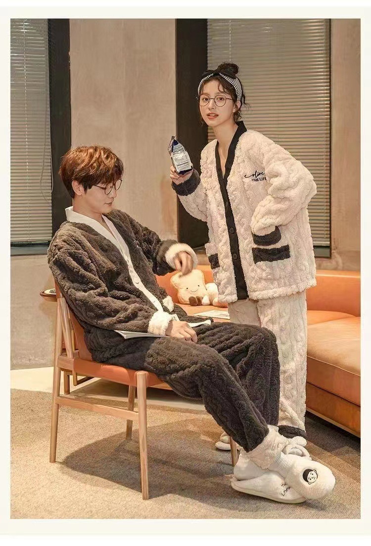 가을과 겨울 새로운 커플 잠옷 두꺼운 기모 따뜻한 카디건 세트 남성과 여성의 플란넬 가정 의류스토어 가기
