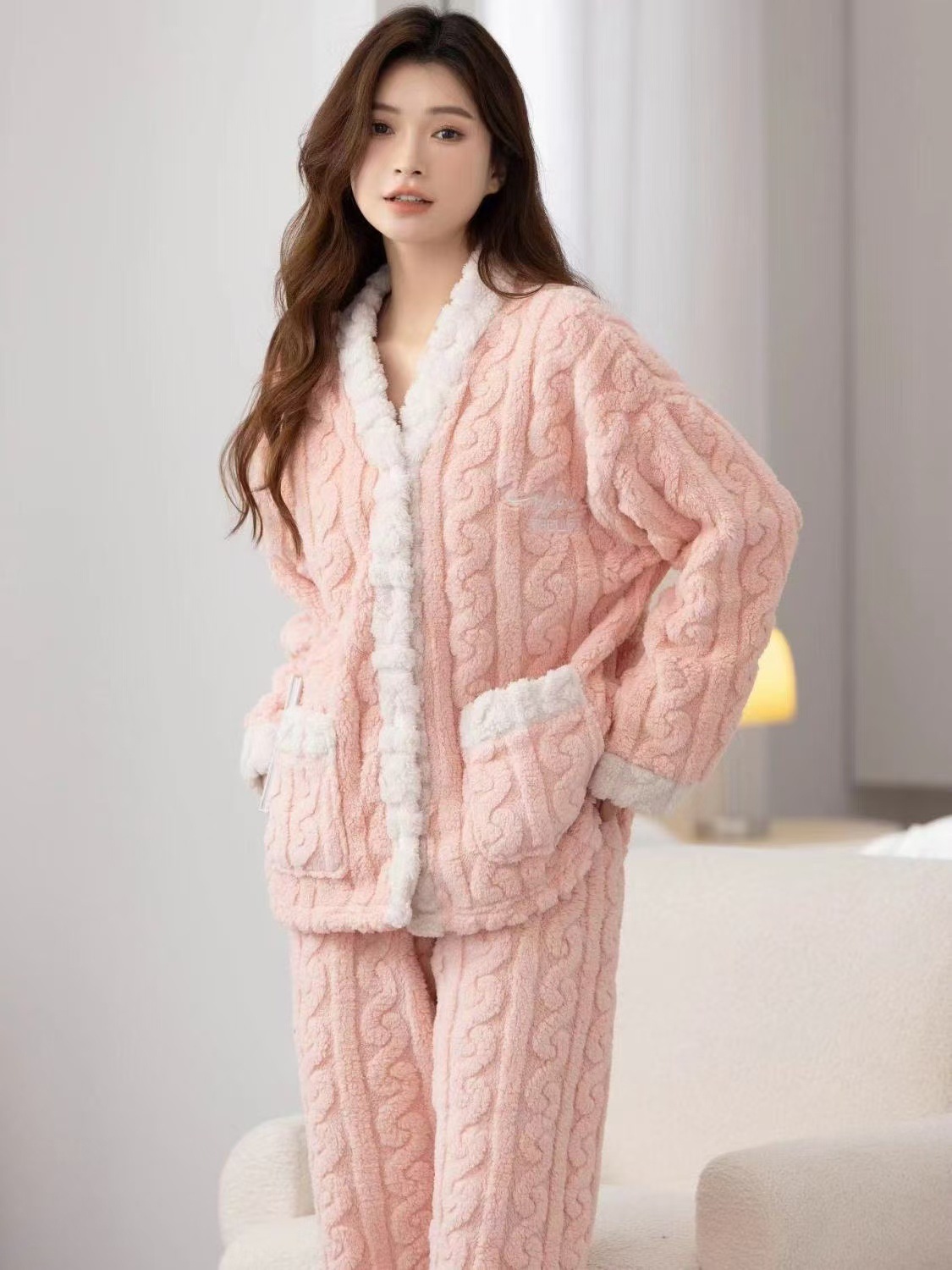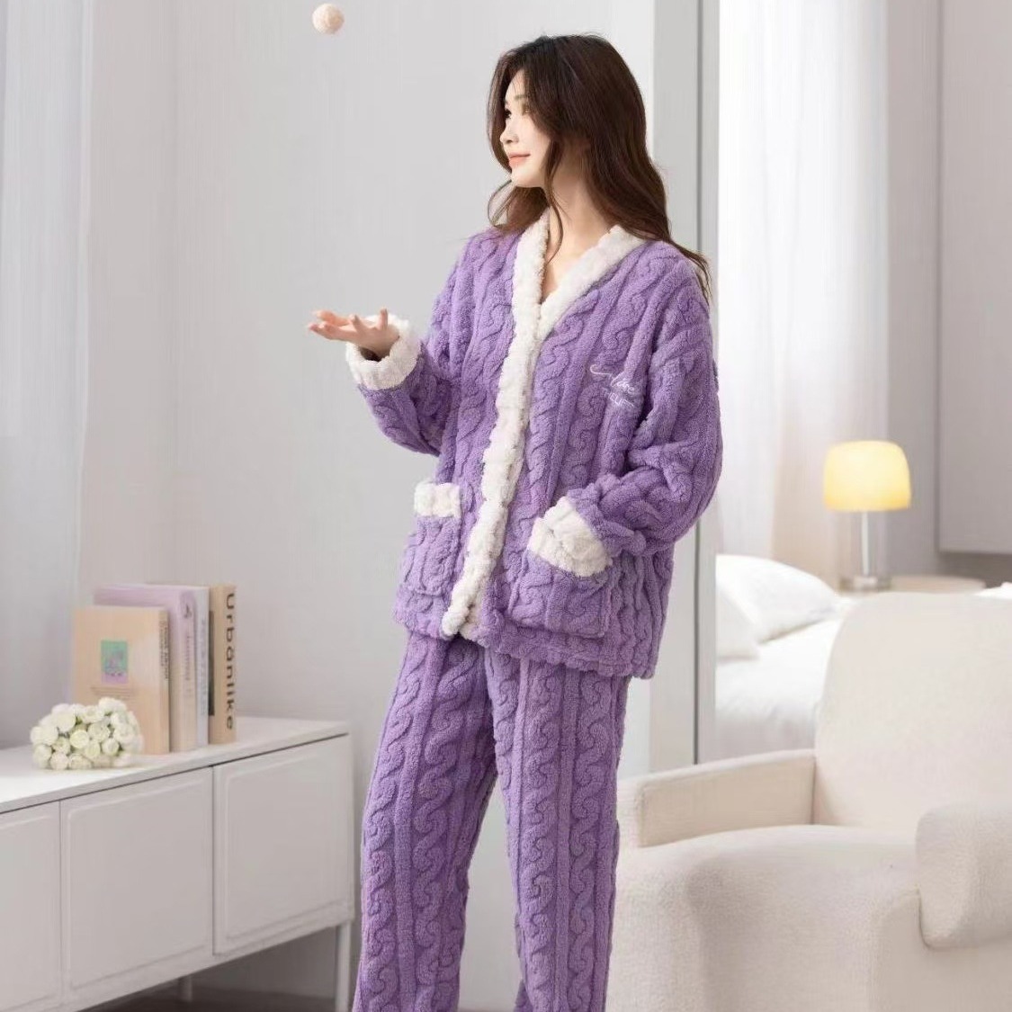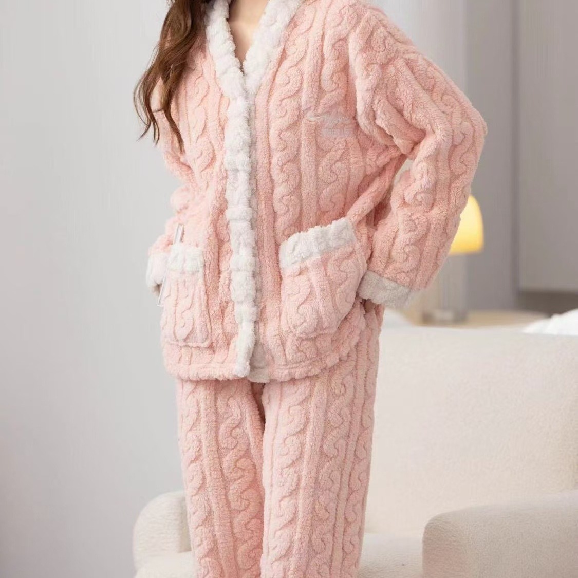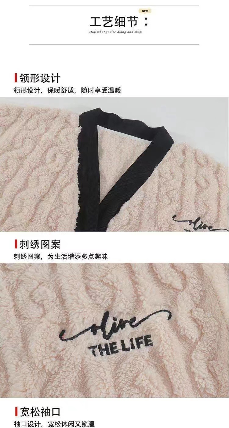 가을과 겨울 새로운 커플 잠옷 두꺼운 기모 따뜻한 카디건 세트 남성과 여성의 플란넬 가정 의류스토어 가기