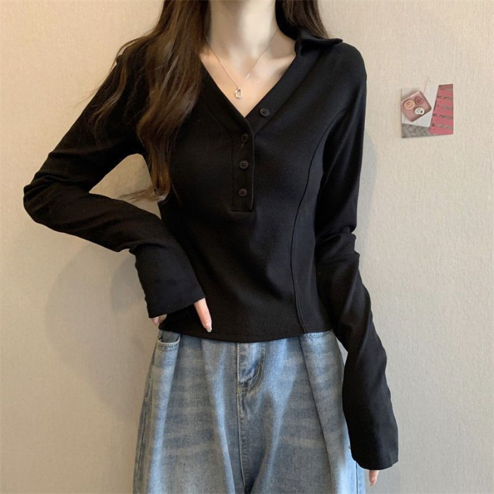 공장 Daifa 2023 가을과 겨울 새로운 POLO 칼라 V-넥 긴 소매 티셔츠 여성의 탑 플러스 사이즈 여성의 긴 소매 기본 셔츠