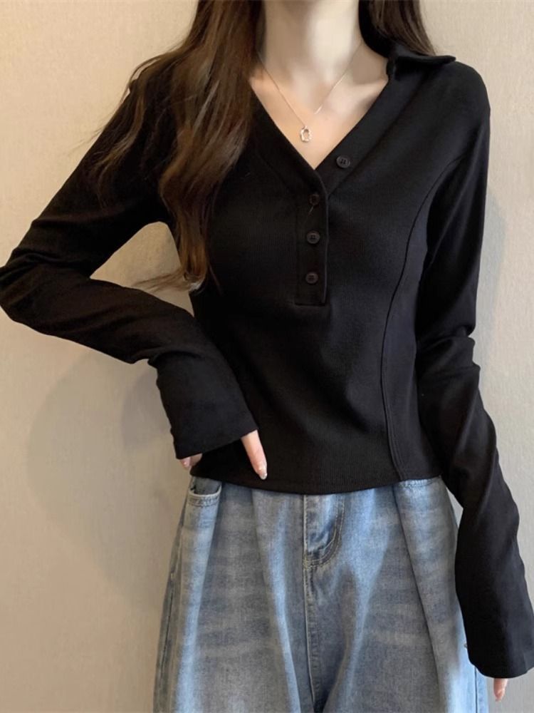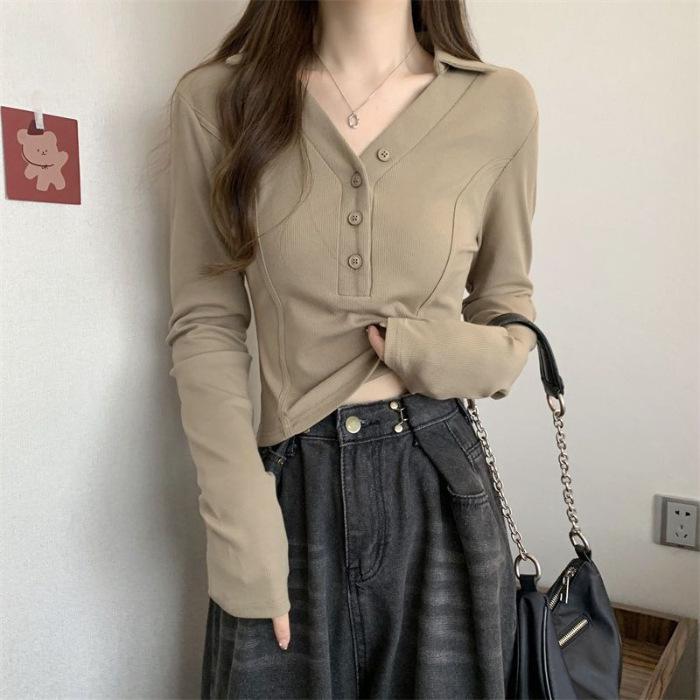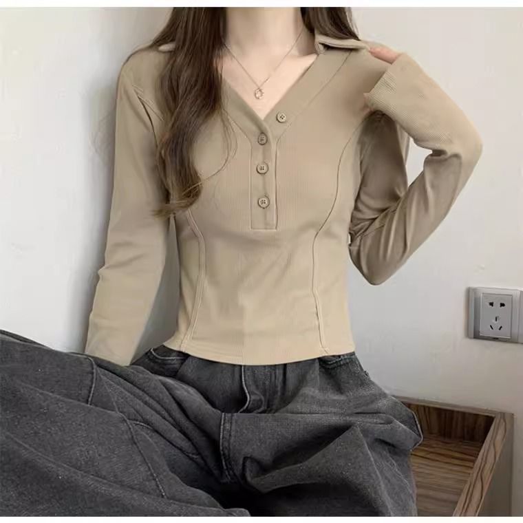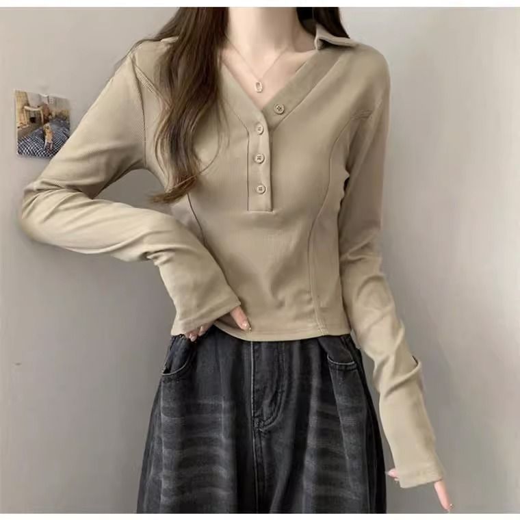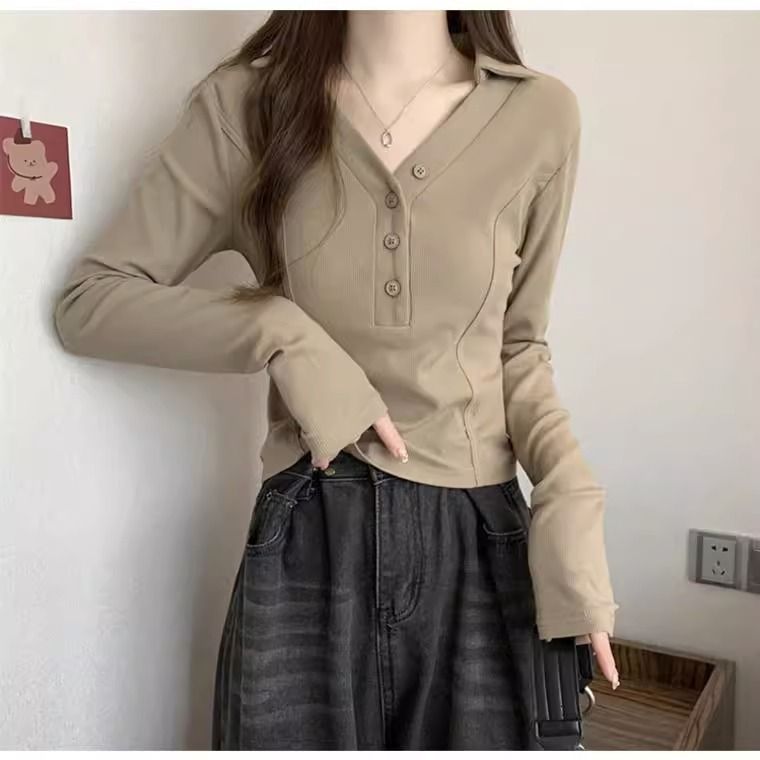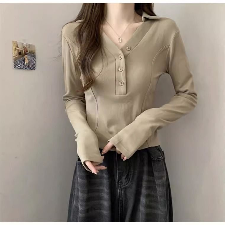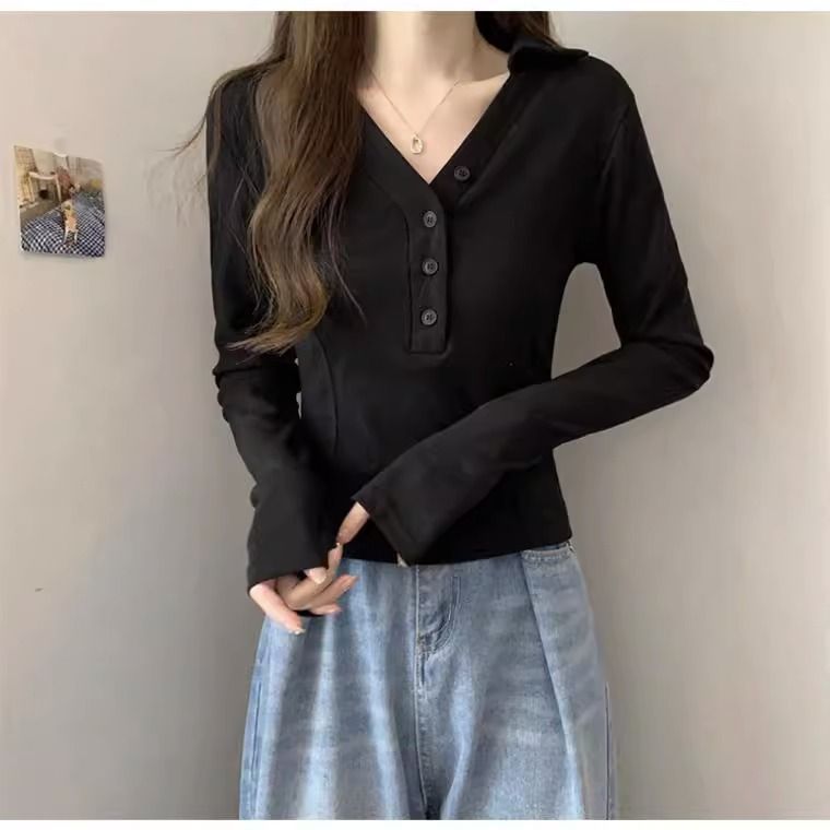 공장 Daifa 2023 가을과 겨울 새로운 POLO 칼라 V-넥 긴 소매 티셔츠 여성의 탑 플러스 사이즈 여성의 긴 소매 기본 셔츠스토어 가기