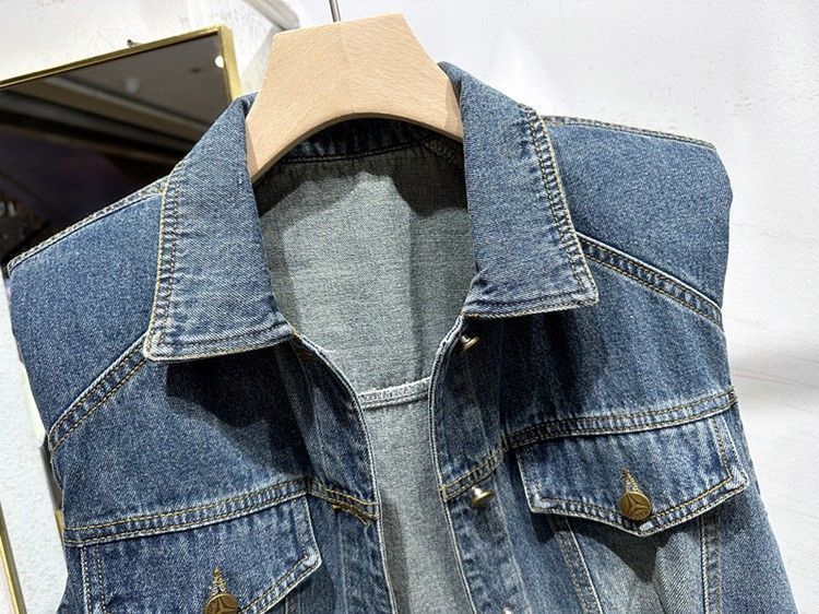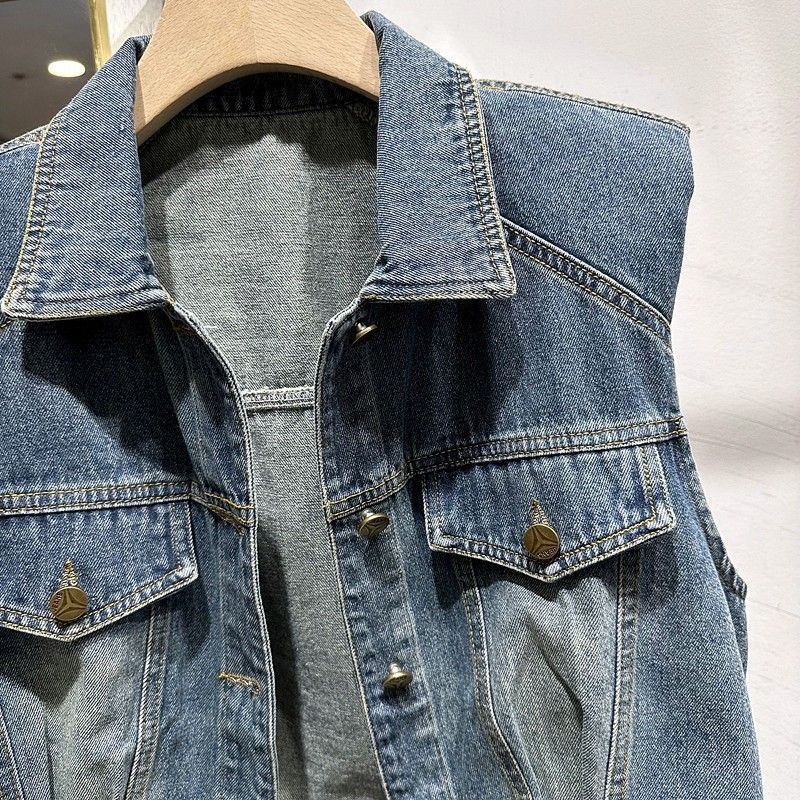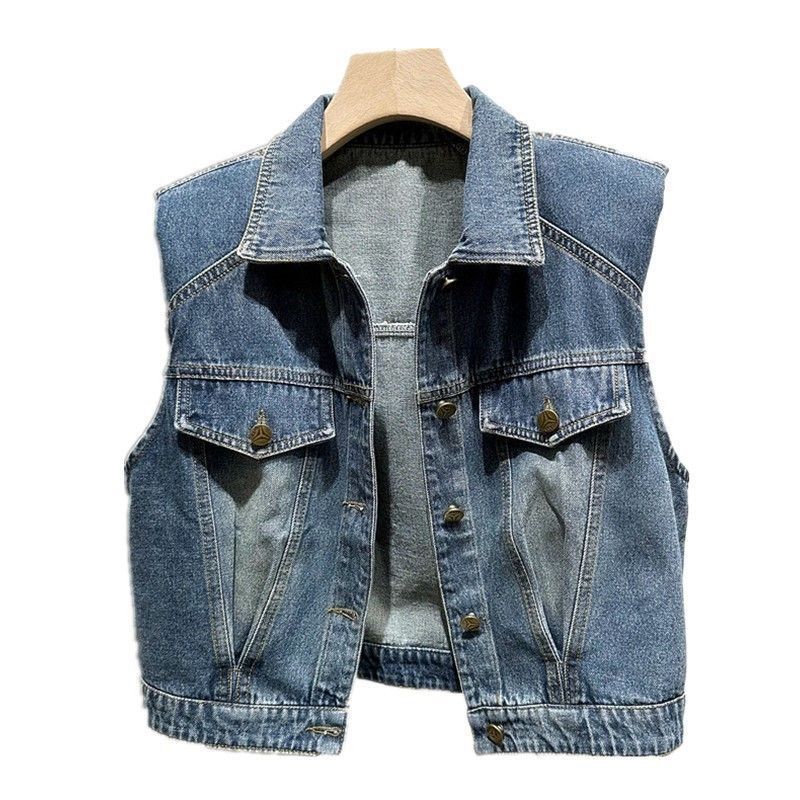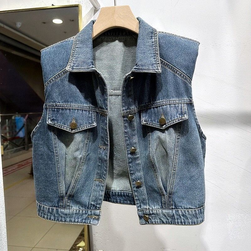 2023 이른 가을 여자의 짧은 조끼 한국어 느슨한 슬리밍 조끼 옷깃 디자인 감각 데님 민소매 조끼