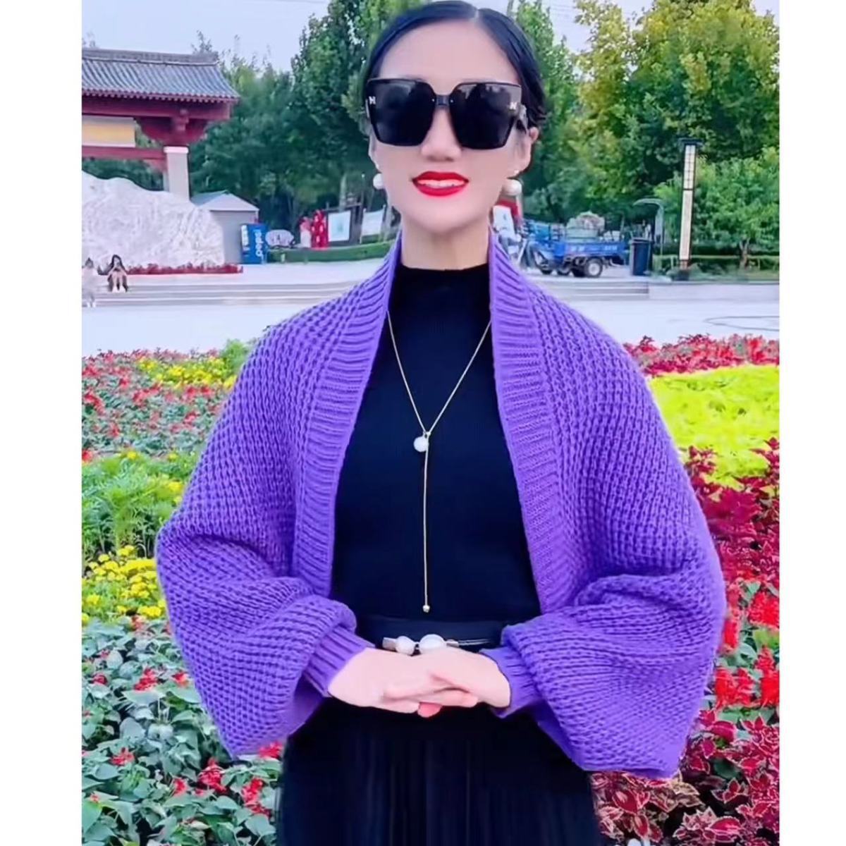 • 퍼플-와플 단색 긴 소매 숄