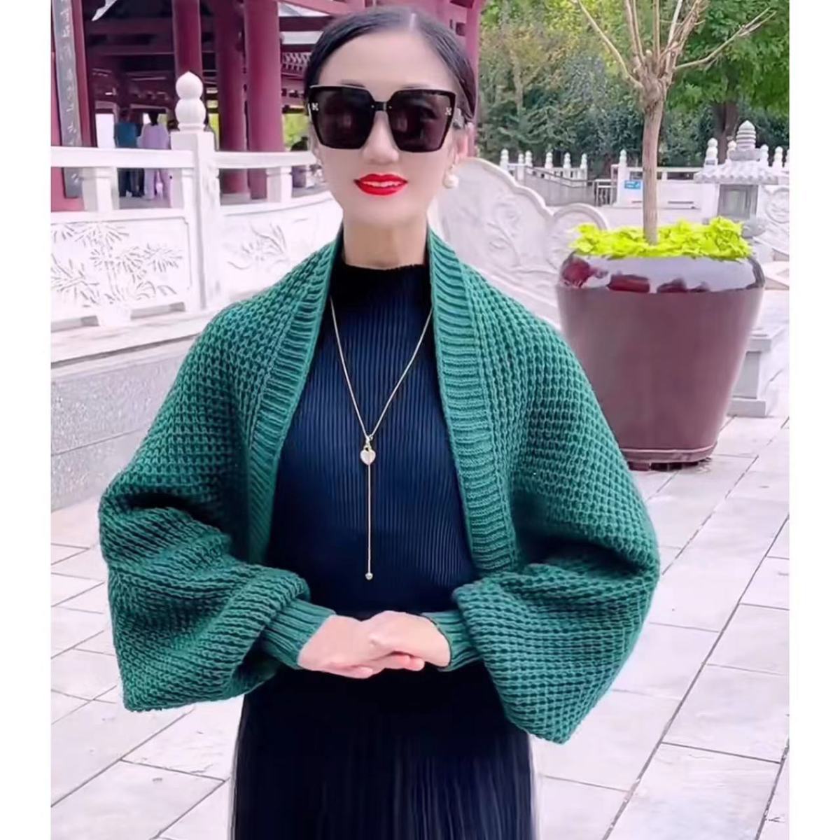 • 녹색-와플 단색 긴 소매 숄