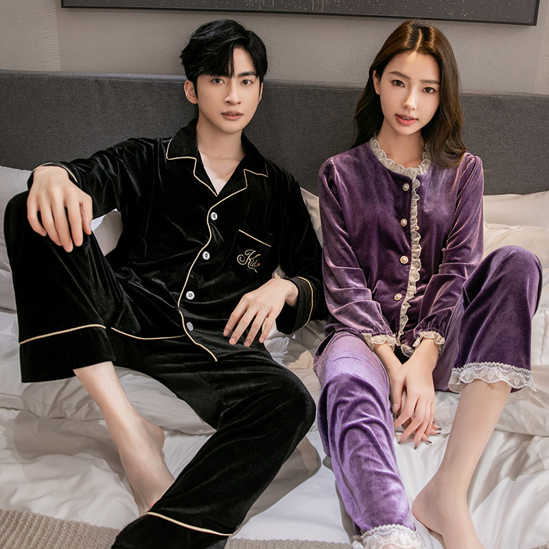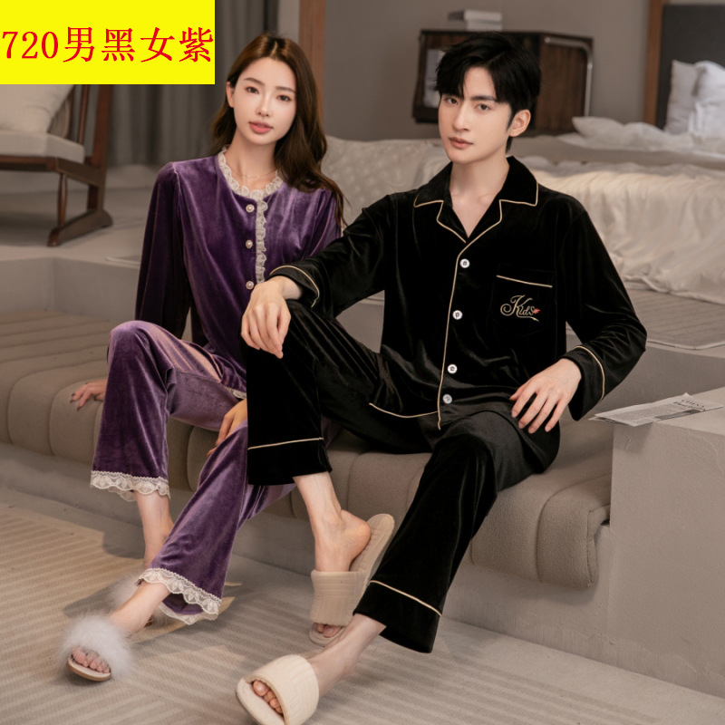 2023 가을과 겨울 새로운 골드 벨벳 커플 잠옷 여성용 투피스 세트 남성용 고급 센스 홈 옷은 외부에서 착용 가능스토어 가기