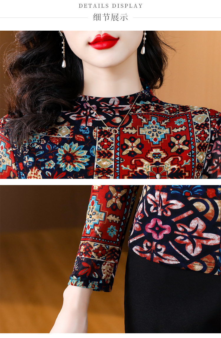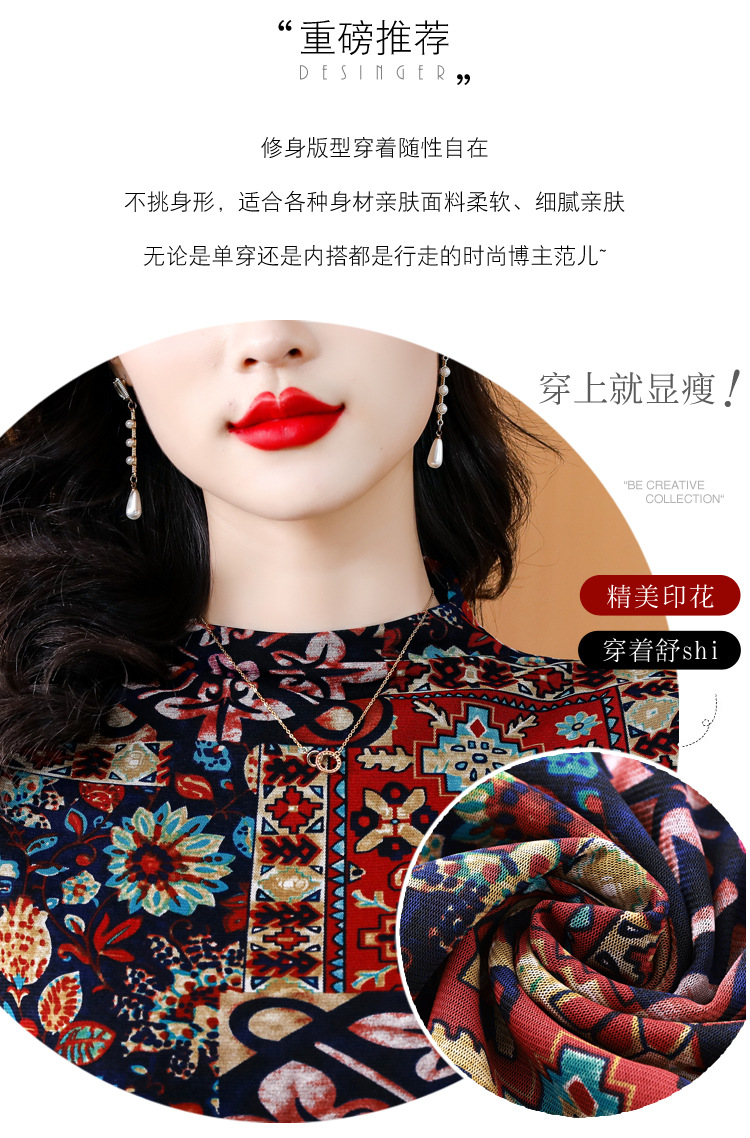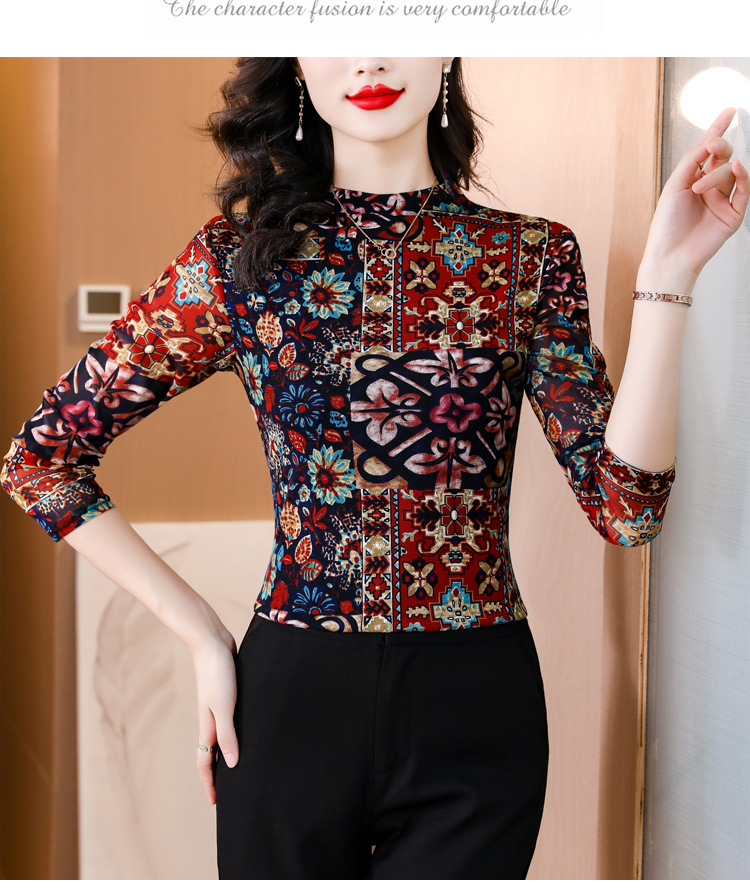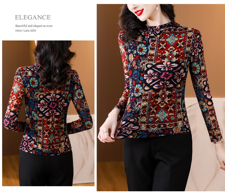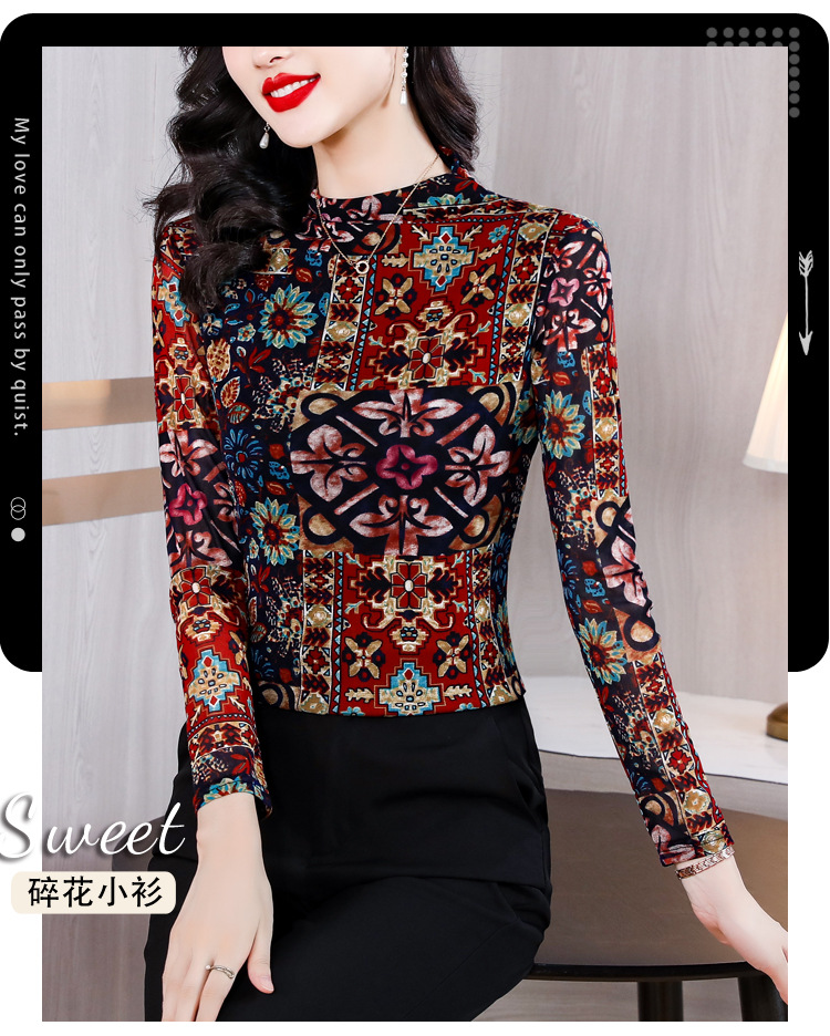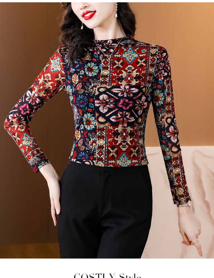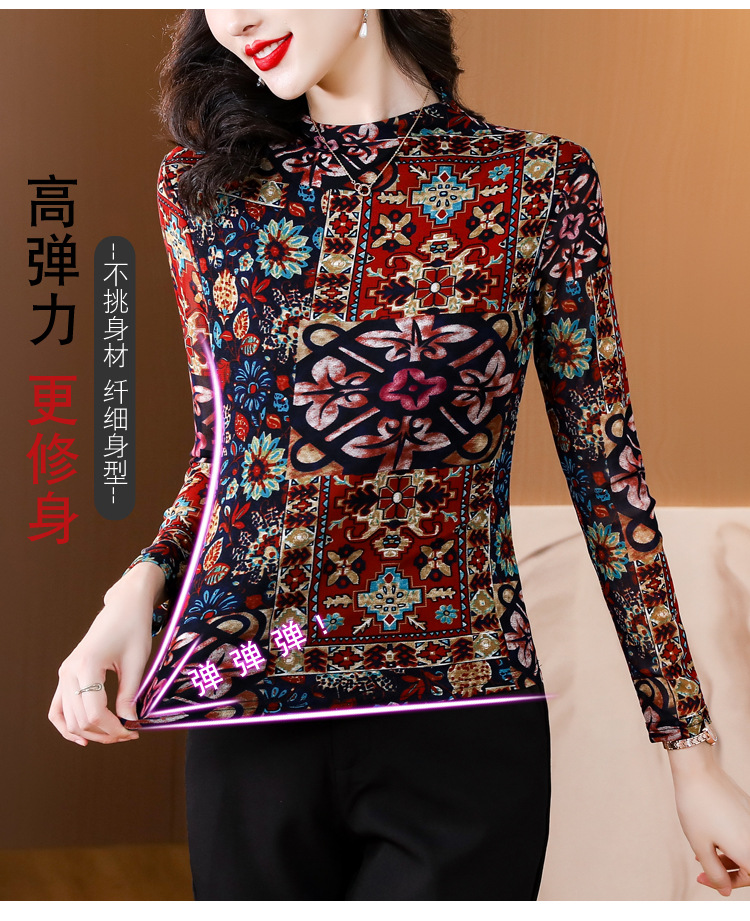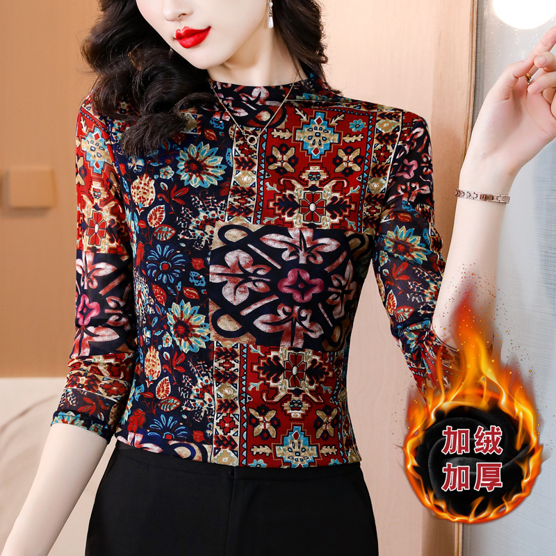 기모 두꺼운 모의 칼라 메쉬 긴팔 티셔츠 여성용 2023 가을과 겨울 스트레치 슬림핏 슬리밍 중국 스타일 베이스 셔츠스토어 가기