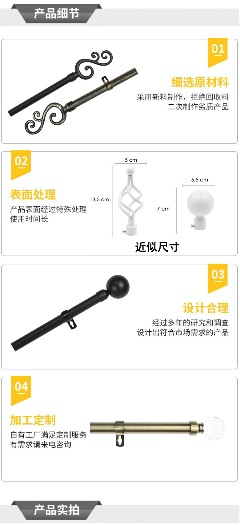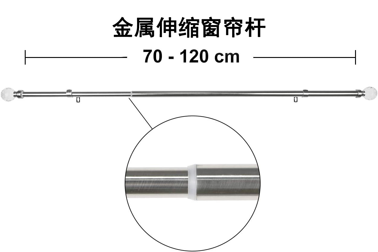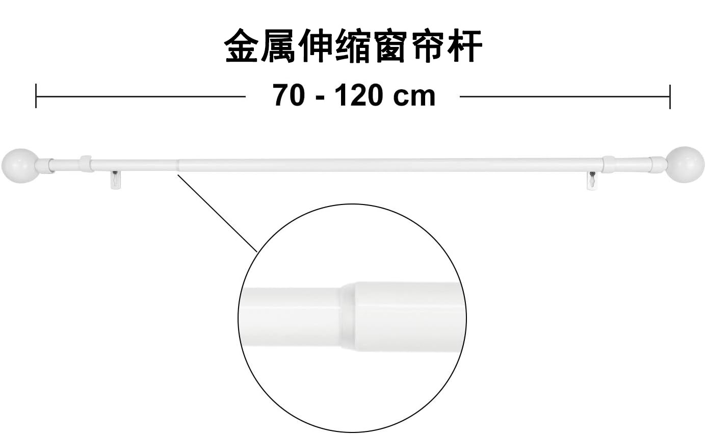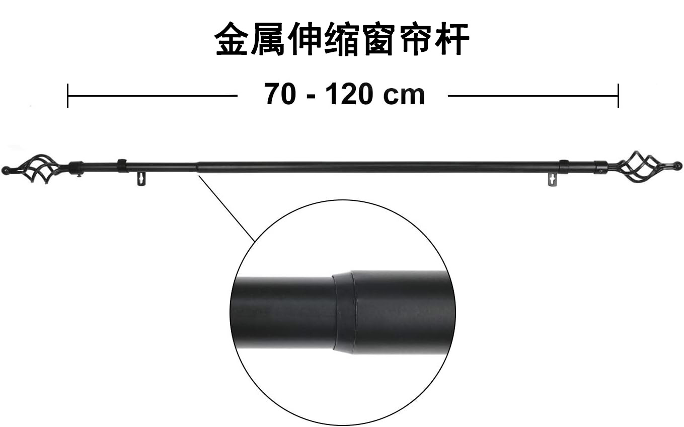 伸缩尺寸0.7-1.2m(不含头子尺寸)1根16mm*0.68m,1根19mm*0.66m.2个普通支架,2个装饰头,8个塑料环,4个安装螺丝,4个膨胀管。