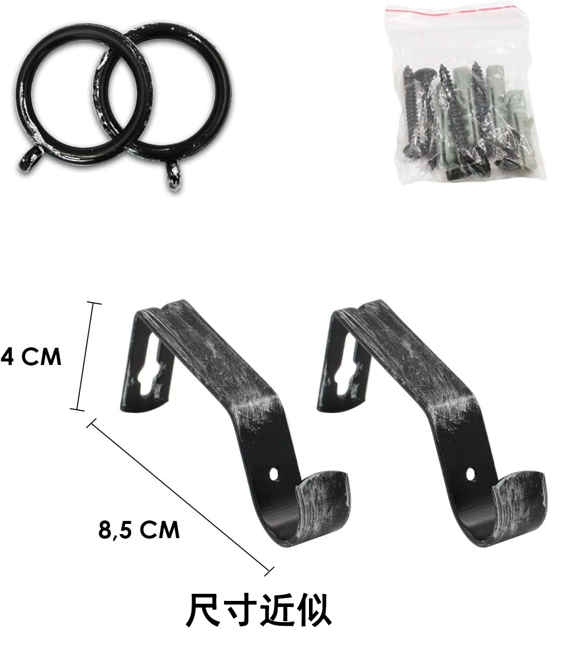 伸缩尺寸1.6-3.1m(不含头子尺寸)1根16mm*1.58m,1根19mm*1.56m.3个普通支架,2个装饰头,20个塑料环,6个安装螺丝,6个膨胀管。