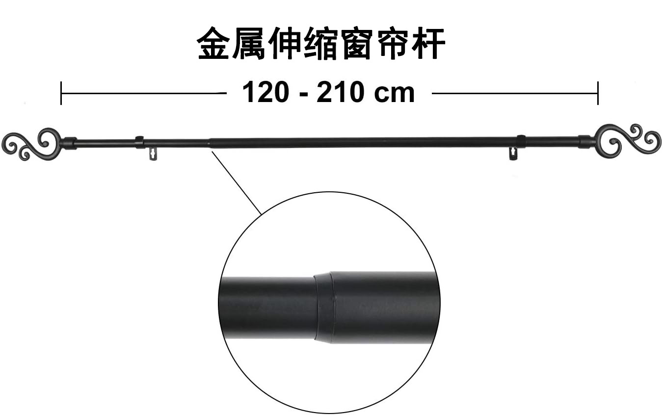 伸缩尺寸1.2-2.1m(不含头子尺寸)1根16mm*1.1m,1根19mm*1.08m.2个普通支架,2个装饰头,14个塑料环,4个安装螺丝,4个膨胀管。
