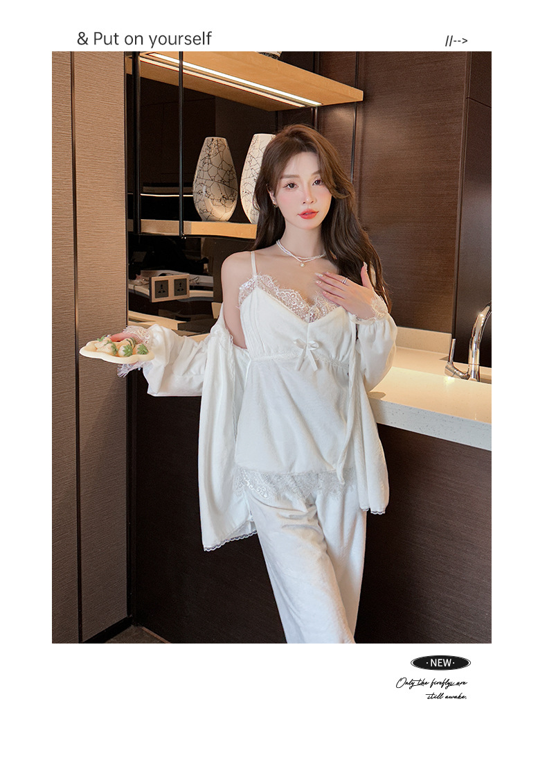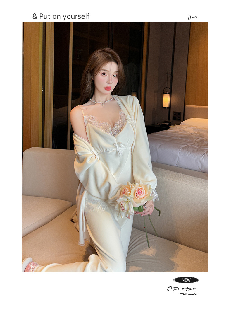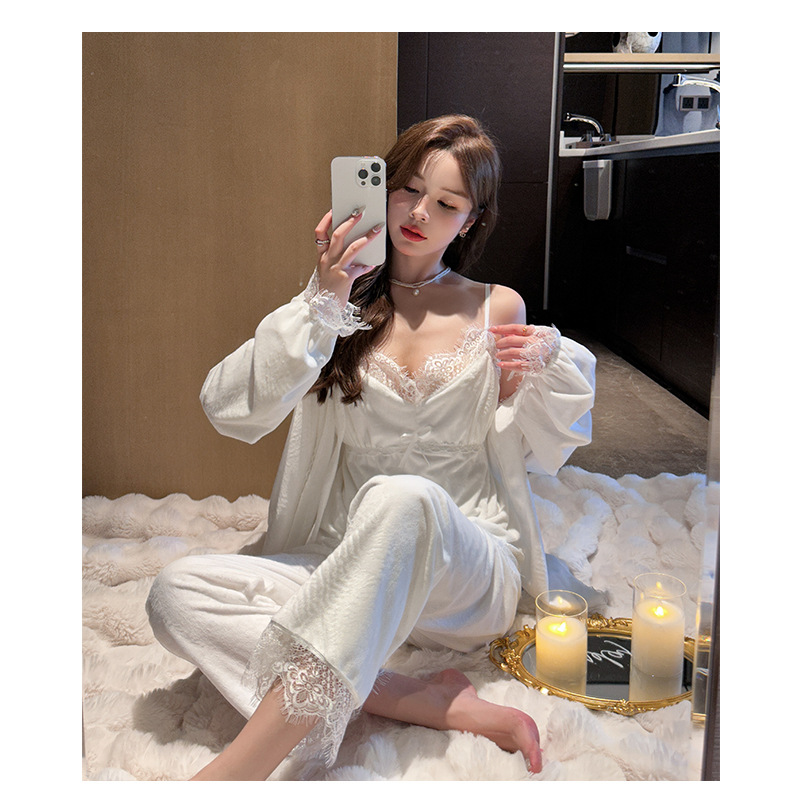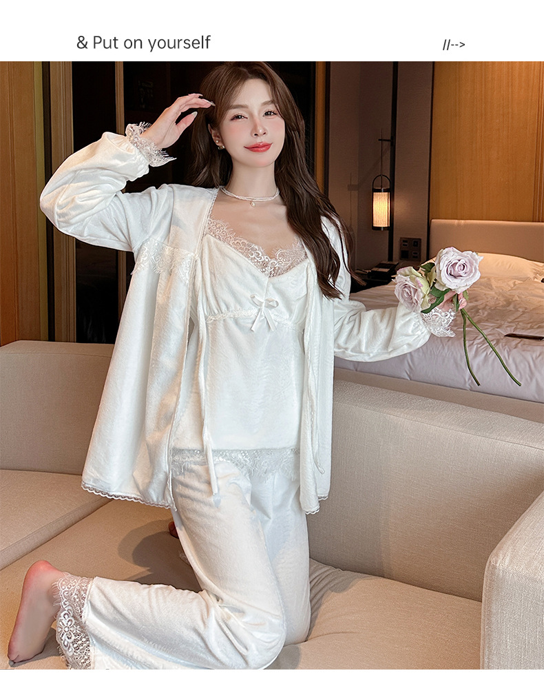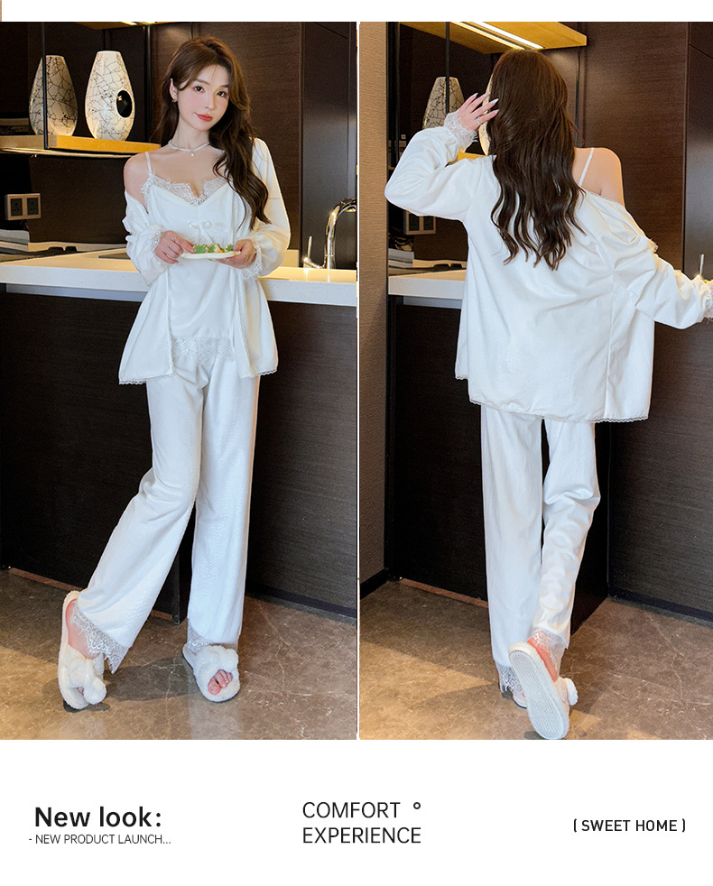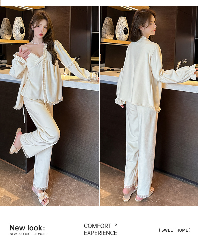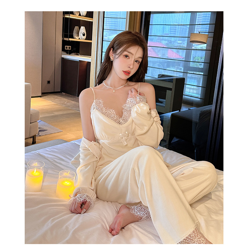 여성용 잠옷 2024 봄, 가을, 여름 신상품 섬 벨벳 긴팔 섹시한 레이스 테두리 편안한 홈웨어 세트