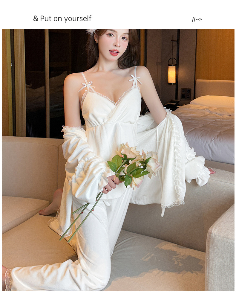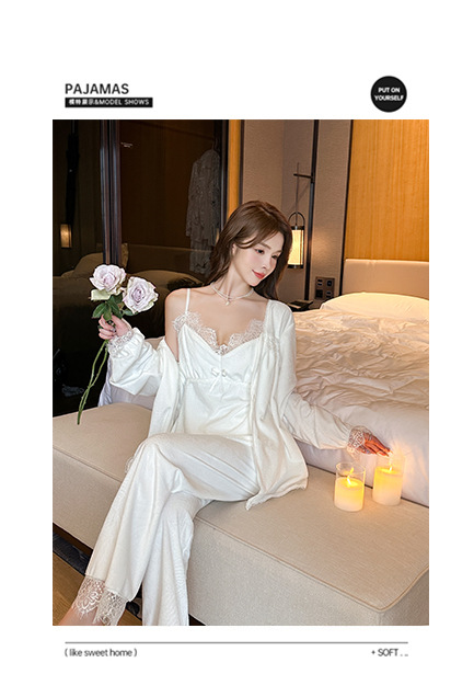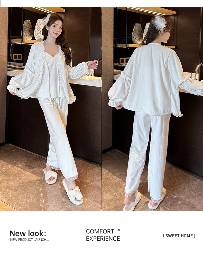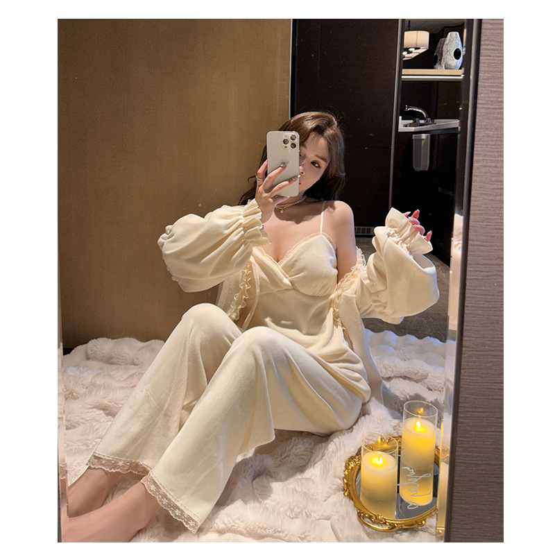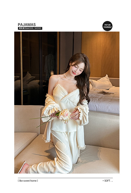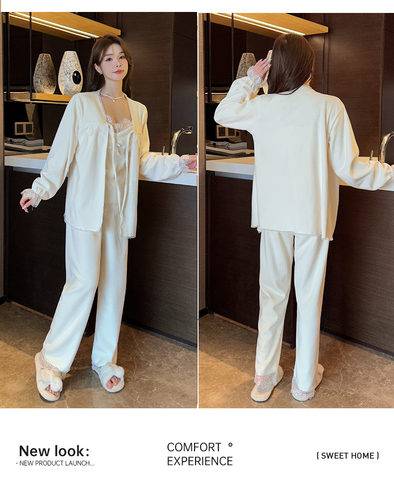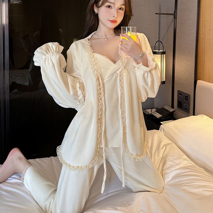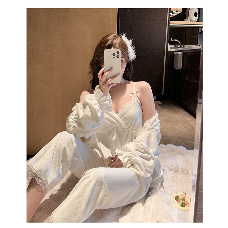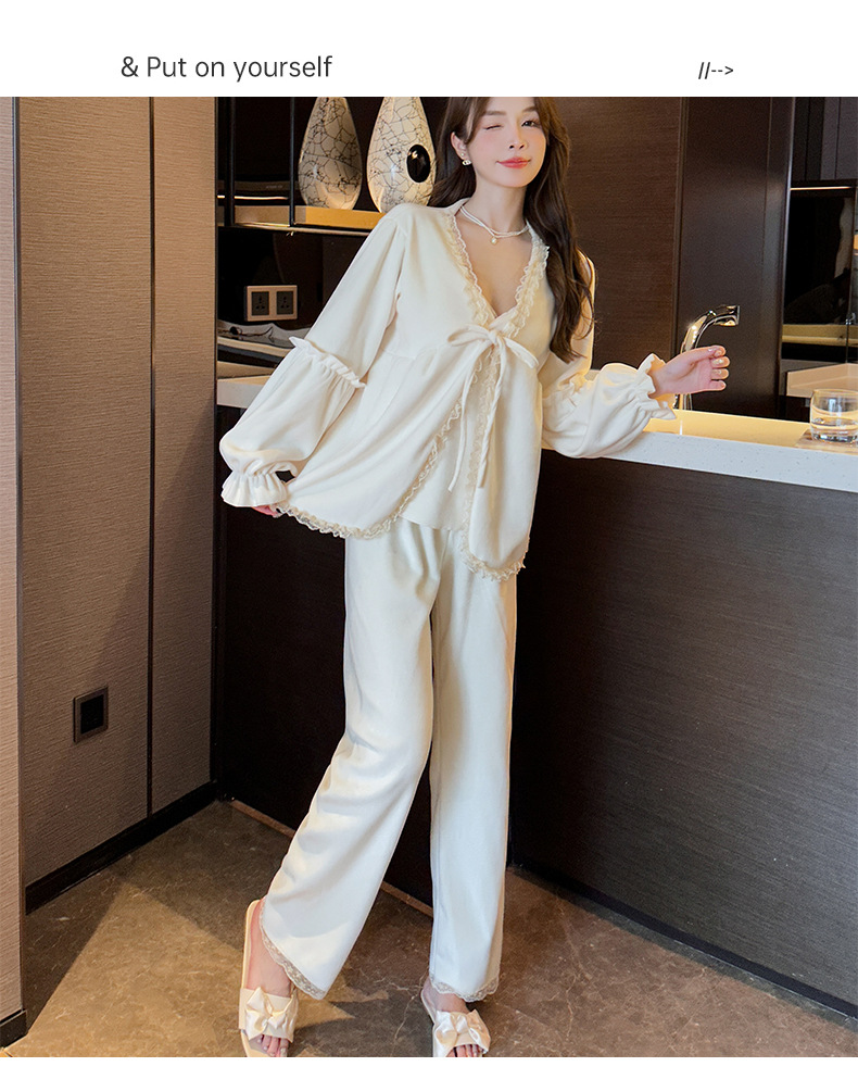 여성용 잠옷 2024 봄, 가을, 여름 신상품 섬 벨벳 긴팔 섹시한 레이스 테두리 편안한 홈웨어 세트