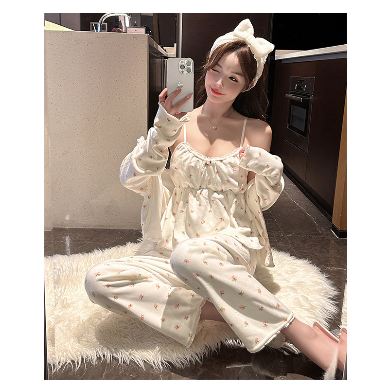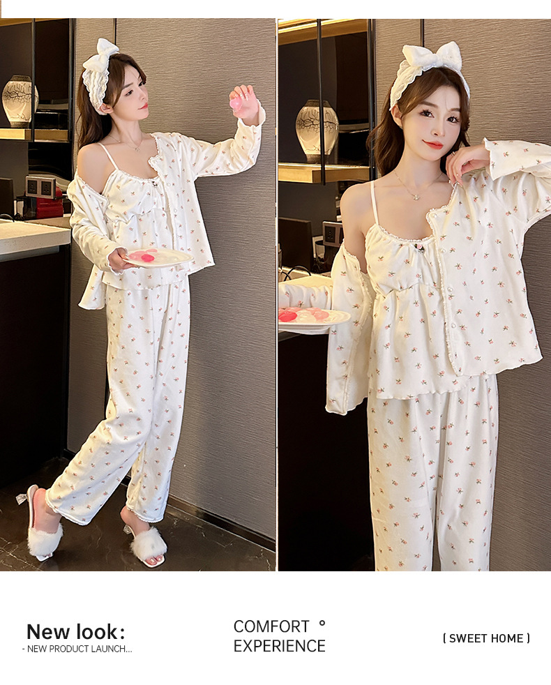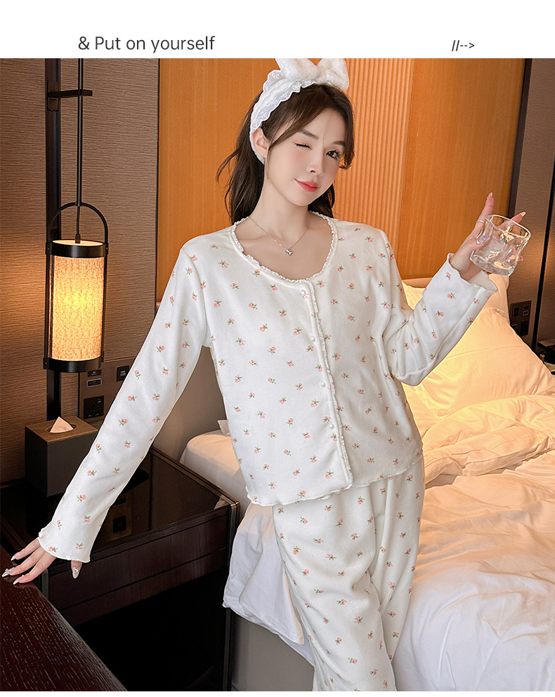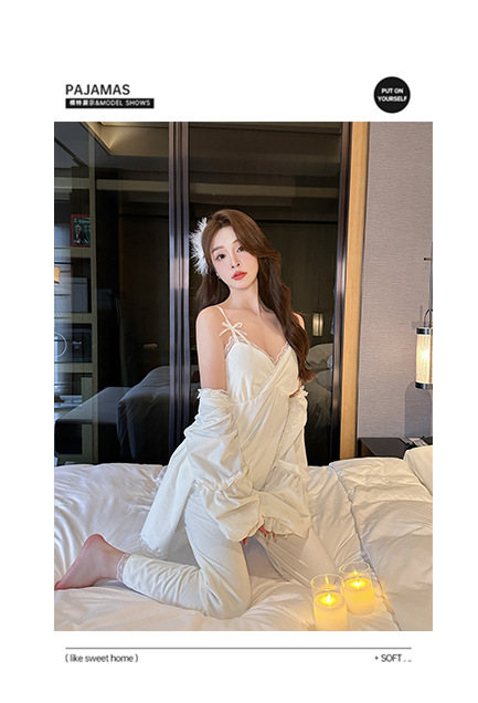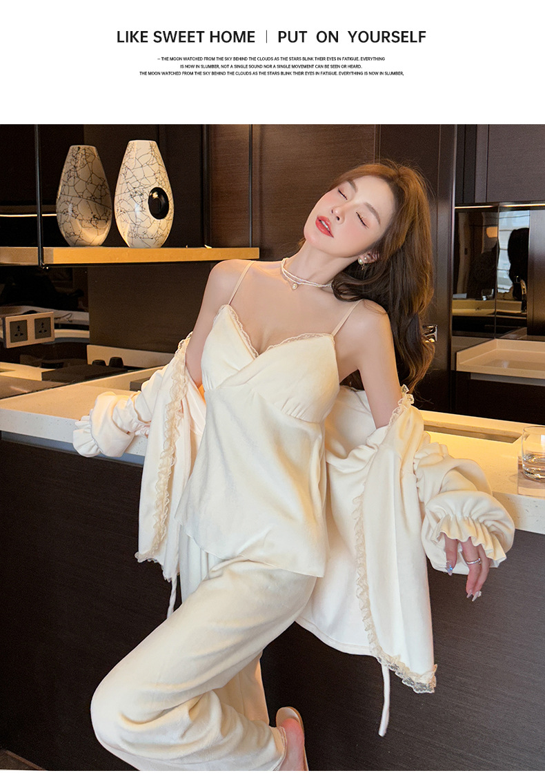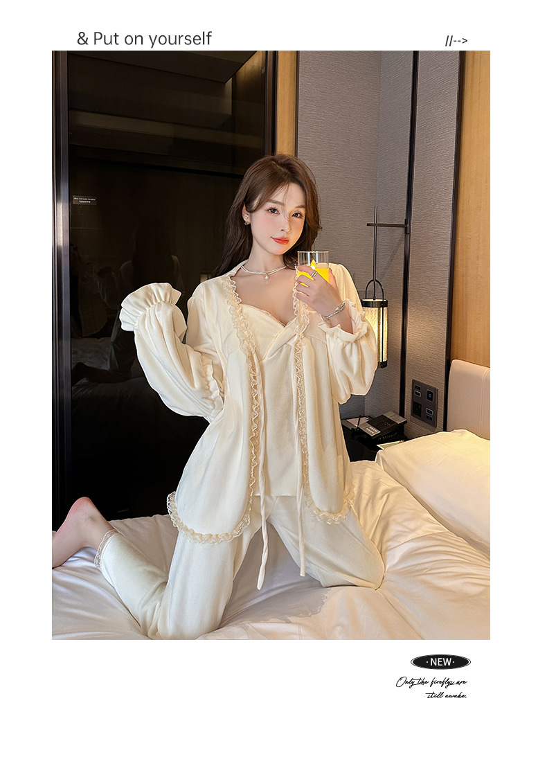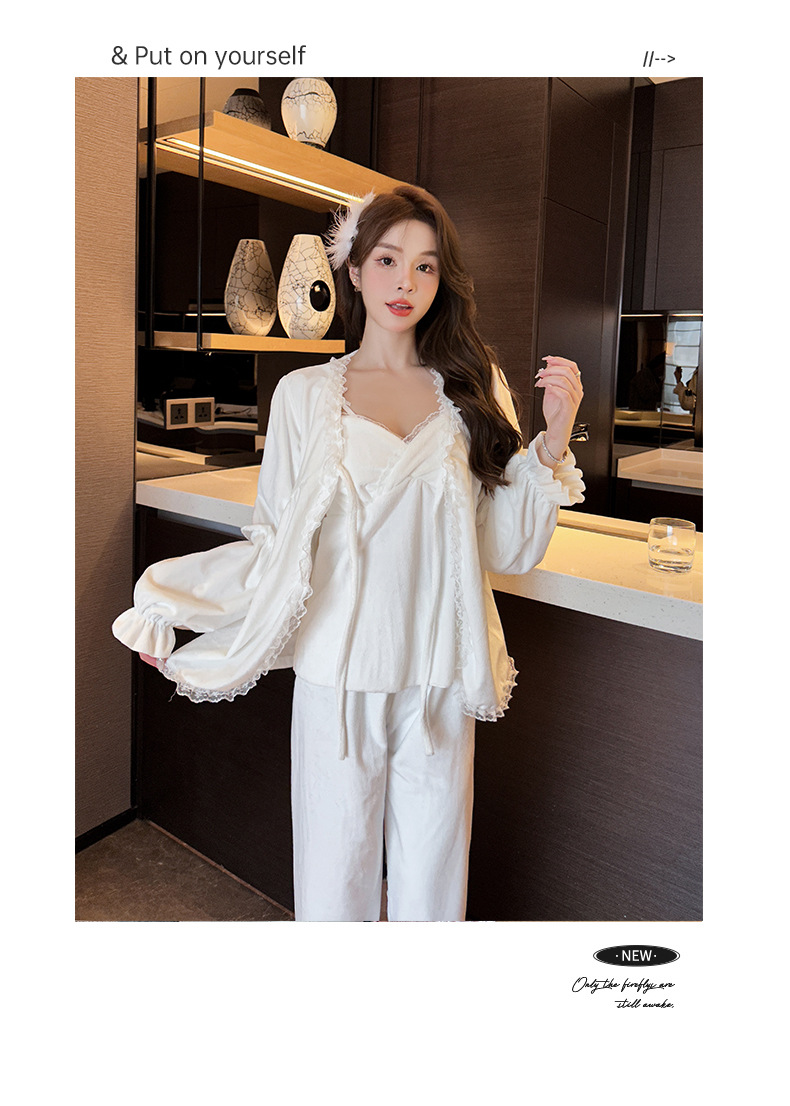 여성용 잠옷 2024 봄, 가을, 여름 신상품 섬 벨벳 긴팔 섹시한 레이스 테두리 편안한 홈웨어 세트