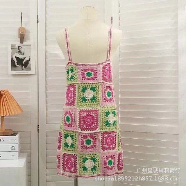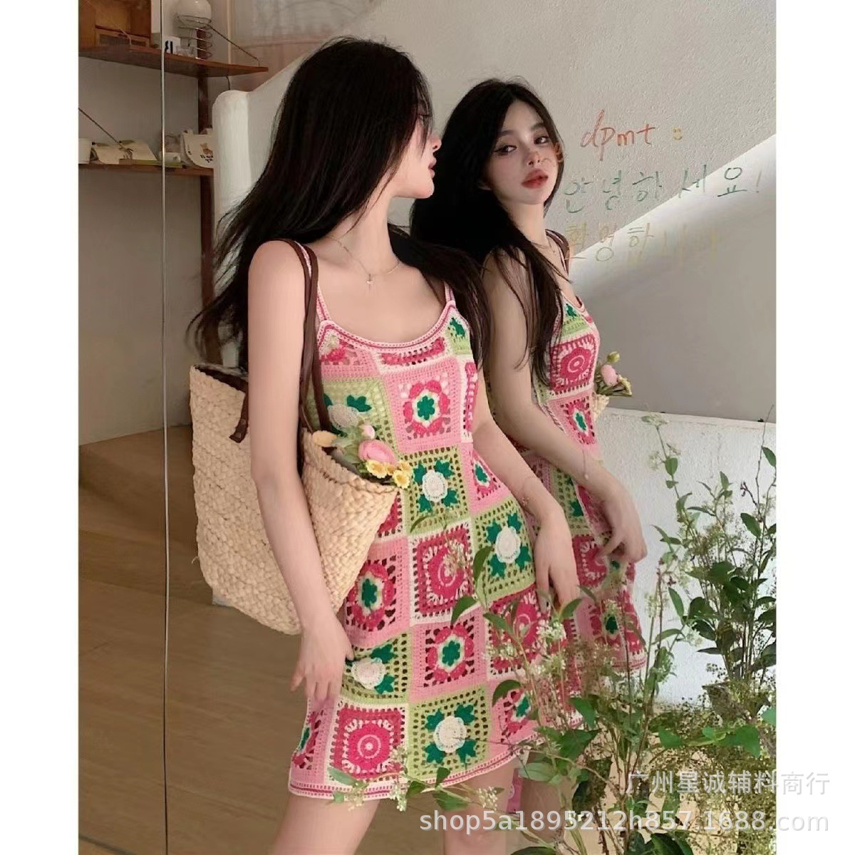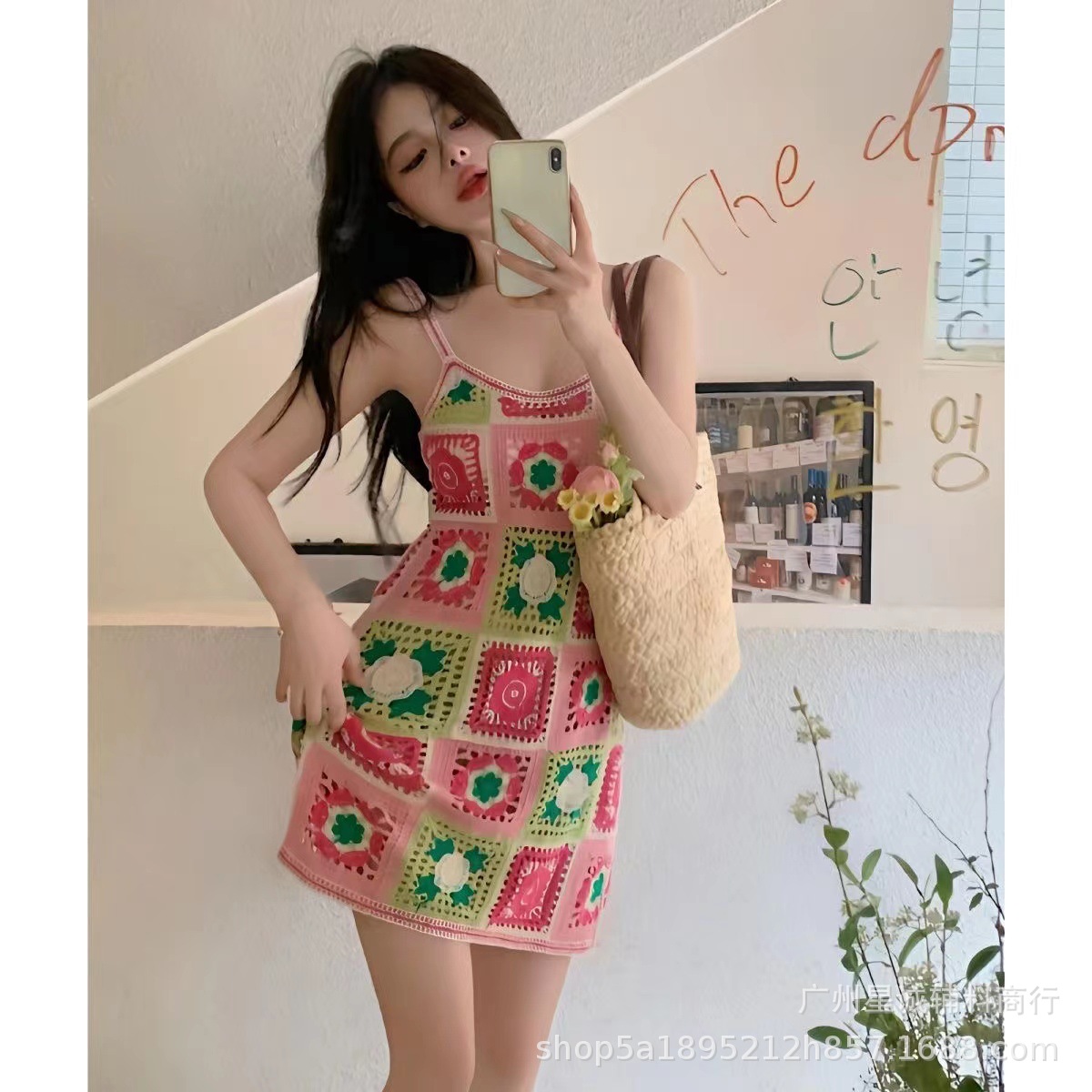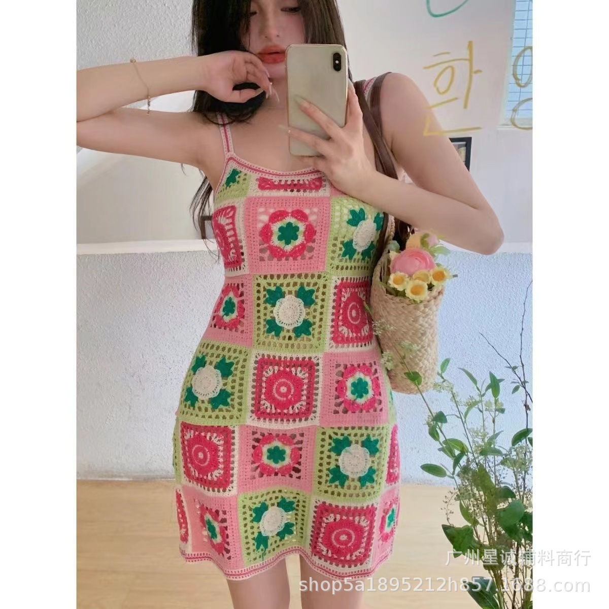 현야 스타일 컬러 매칭 체크 무늬 중공 관점 짧은 스트랩 원피스 여성의 새로운 빈티지 크로 셰 뜨개질 아름다운 다시 모든 매치 원피스