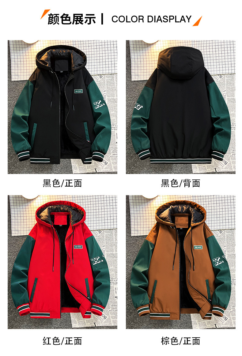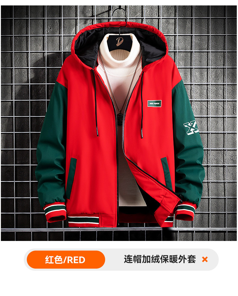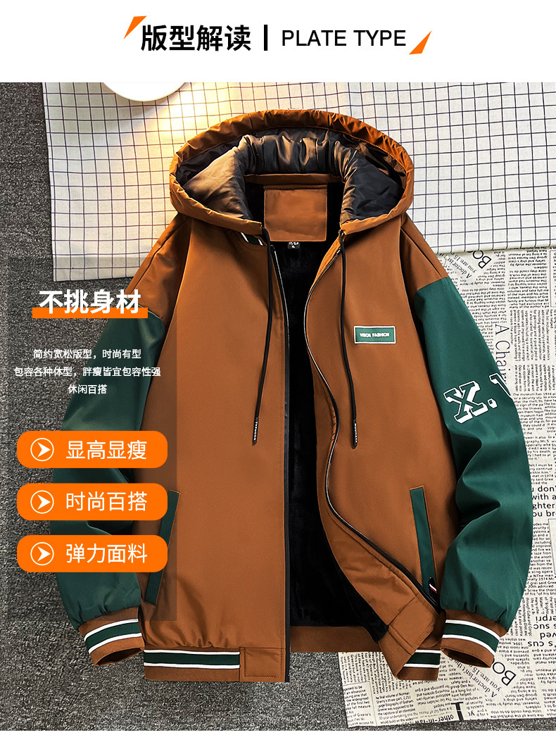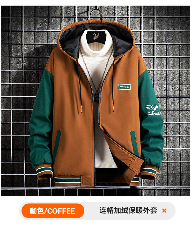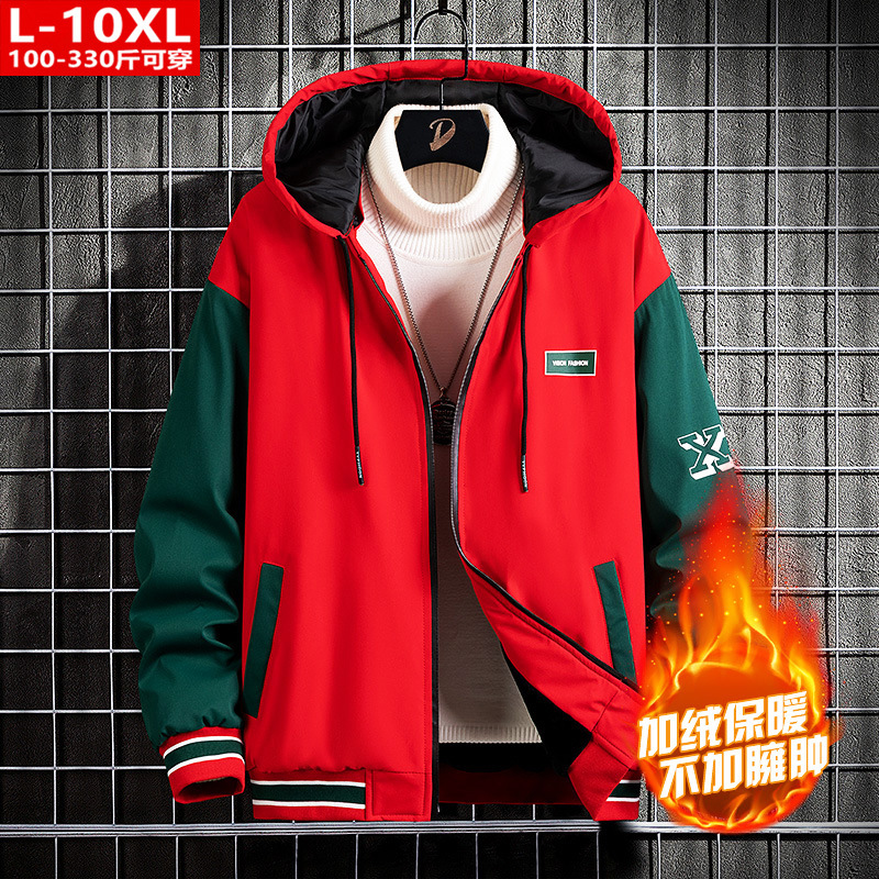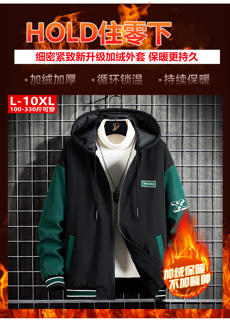 가을과 겨울 트렌디 한 남자의 잘 생긴 패션 컬러 블록 인쇄 후드 재킷 통통 큰 사이즈 느슨한 캐주얼 기모 두꺼운 재킷스토어 가기
