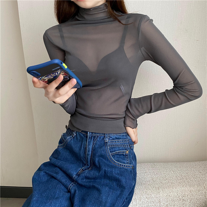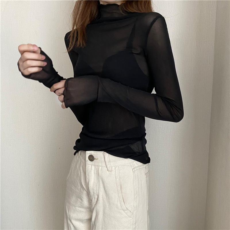 여성용 슬림핏 하이 칼라 긴팔 레이스베이스 셔츠 여성용 얇은 메쉬 탑 가을과 겨울 블랙 나무 귀 테두리 셔츠
