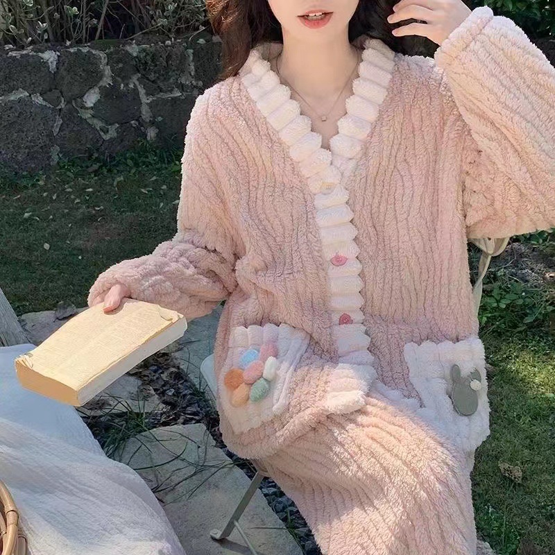 가을과 겨울 레인보우 잠옷 카디건 잠옷 세트 가정복 여자의 산호 양털 두꺼운 따뜻한 달 옷 투피스 세트스토어 가기