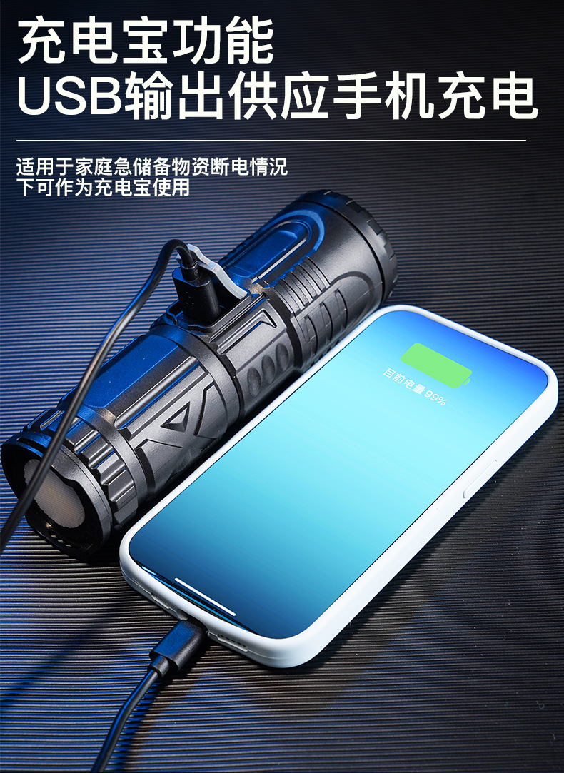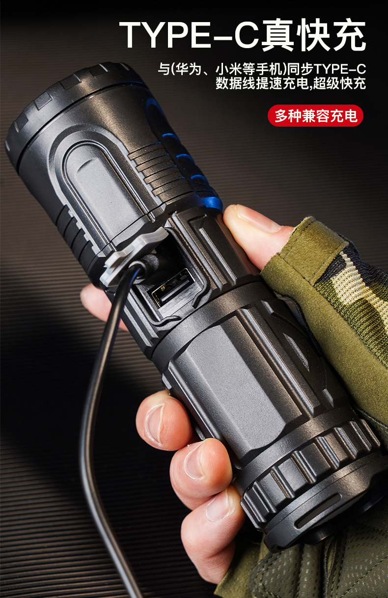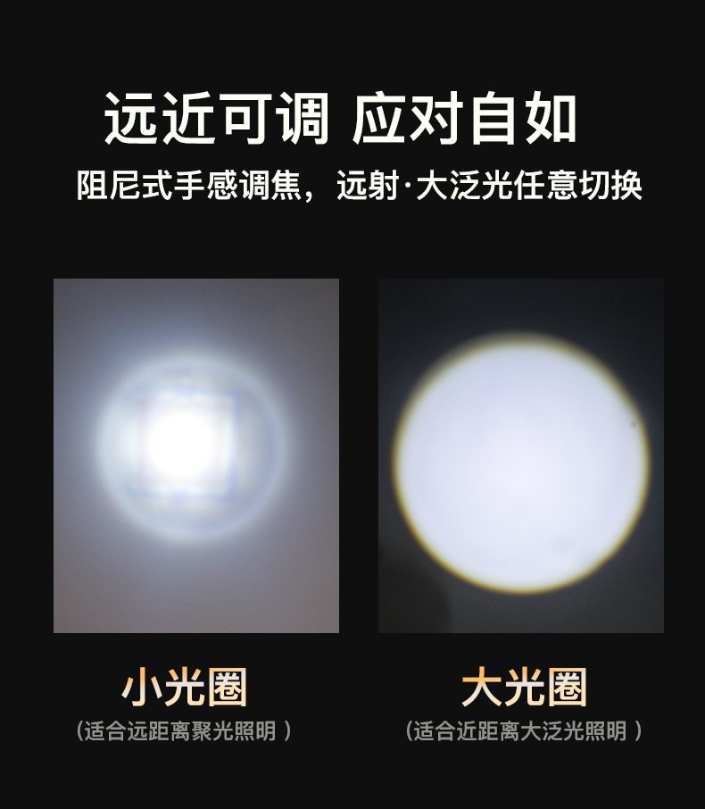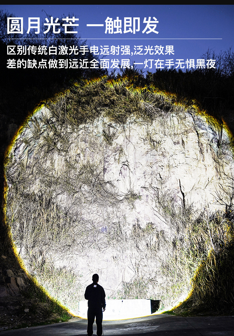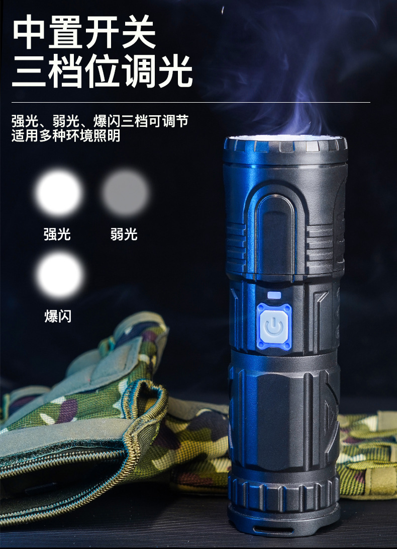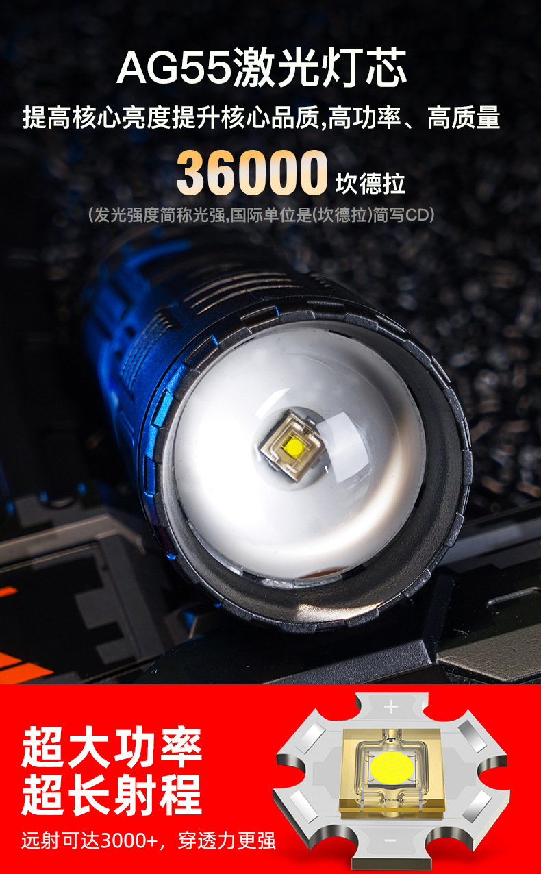 主灯白激光,可伸缩无极变焦,强-弱-闪,三挡功能