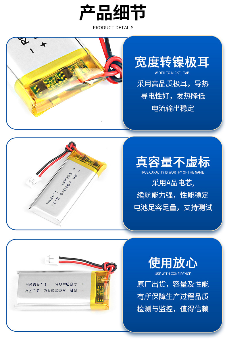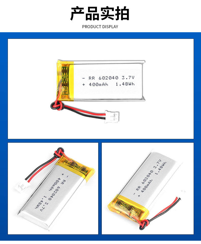 602040 폴리머 리튬 배터리 400mAh 용량 전자 헤드폰 손난로 눈 마사지기 충전식 배터리스토어 가기