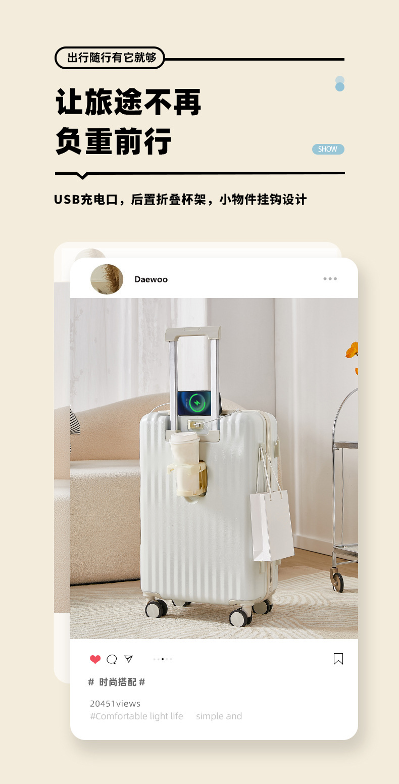 여성용 여행가방 20inch 경량 충전식 두꺼운 트롤리 케이스 대용량 여행가방 비밀번호 케이스 유니버설 무소음 바퀴스토어 가기