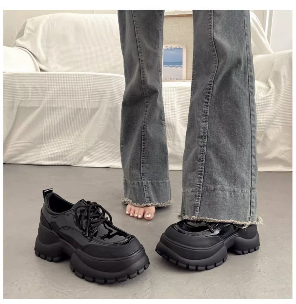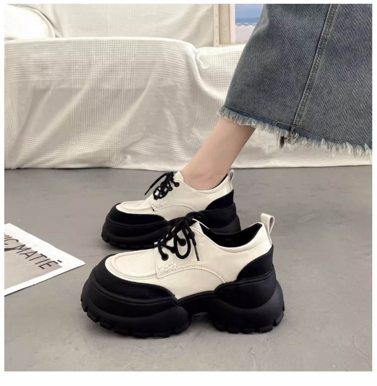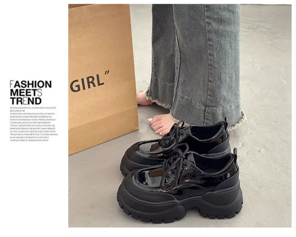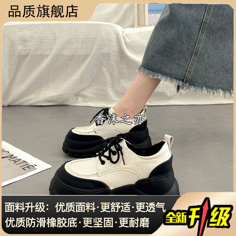 여성용 두꺼운 굽 싱글 슈즈 블랙 2024 봄 새로운 패션 다목적 두꺼운 밑창 작은 캐주얼 패션 여성용 작은 가죽 신발스토어 가기
