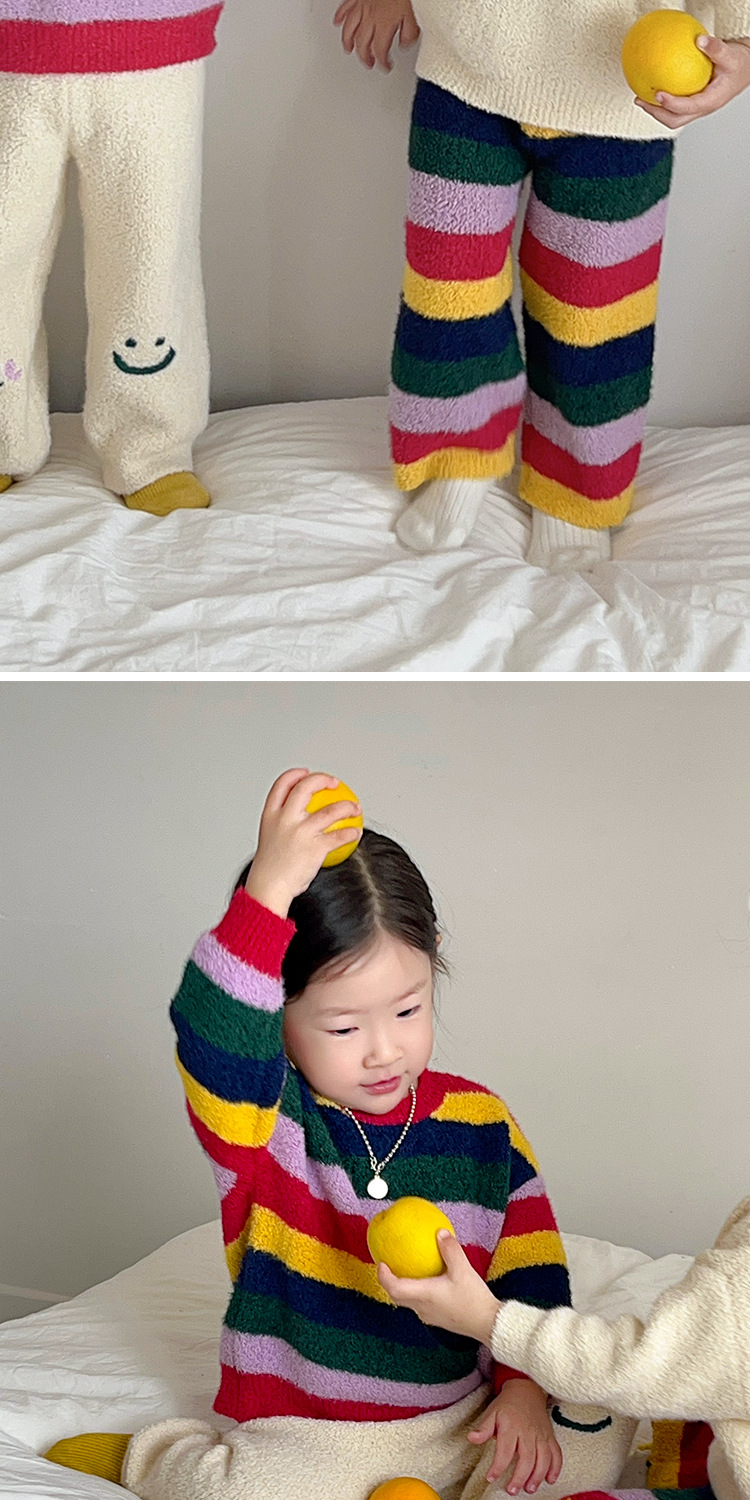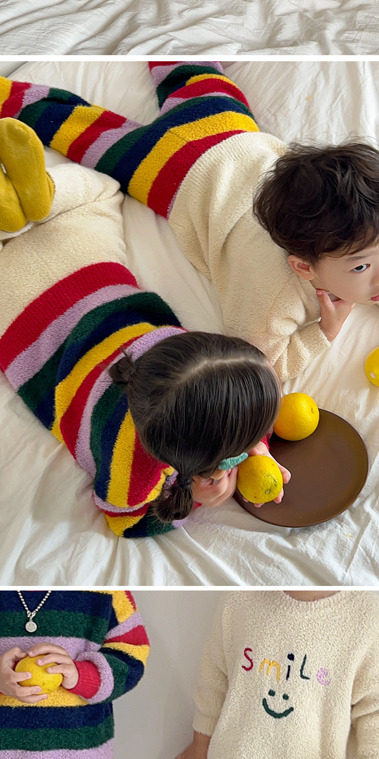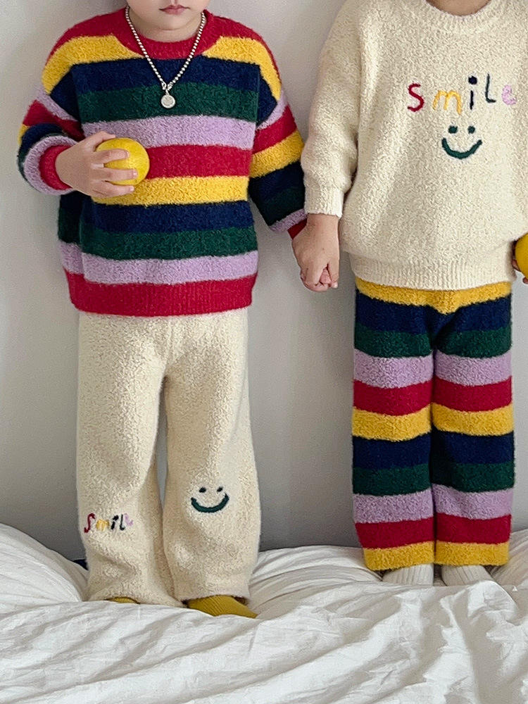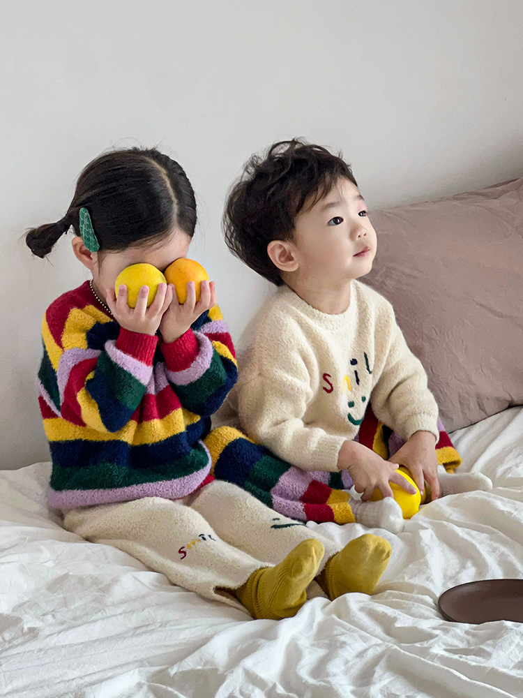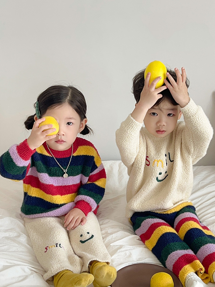 어린이 반 벨벳 잠옷 세트 소년 레인보우 스트립 가정 옷 따뜻한 두꺼운 산호 벨벳 여아 겨울 가정 옷