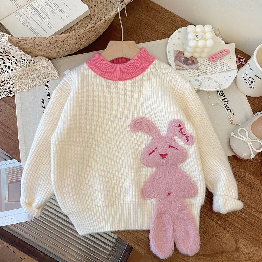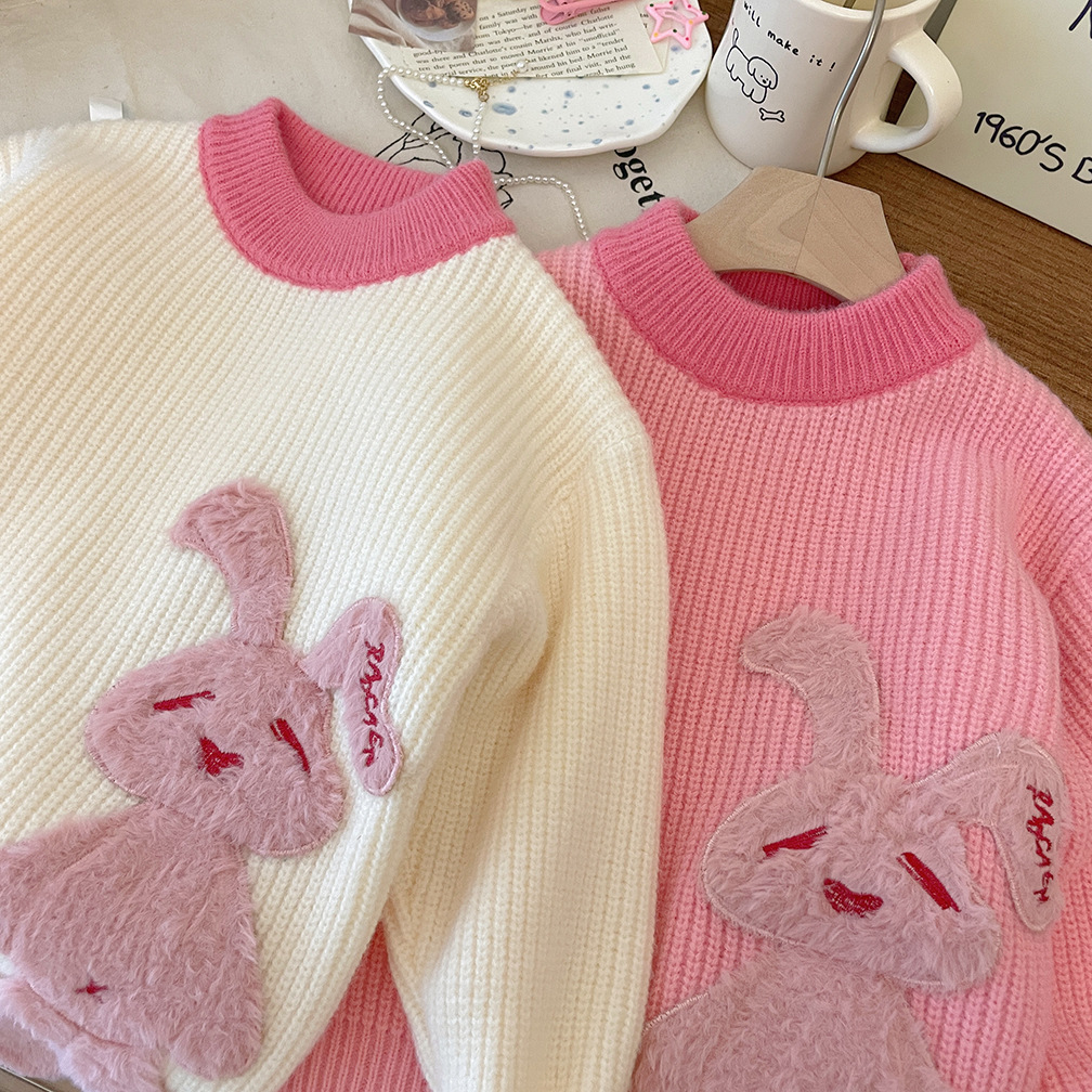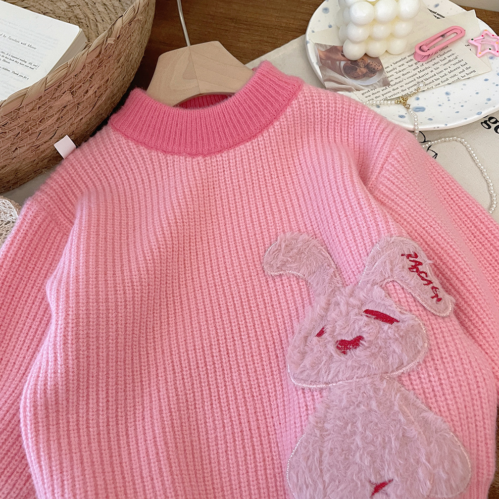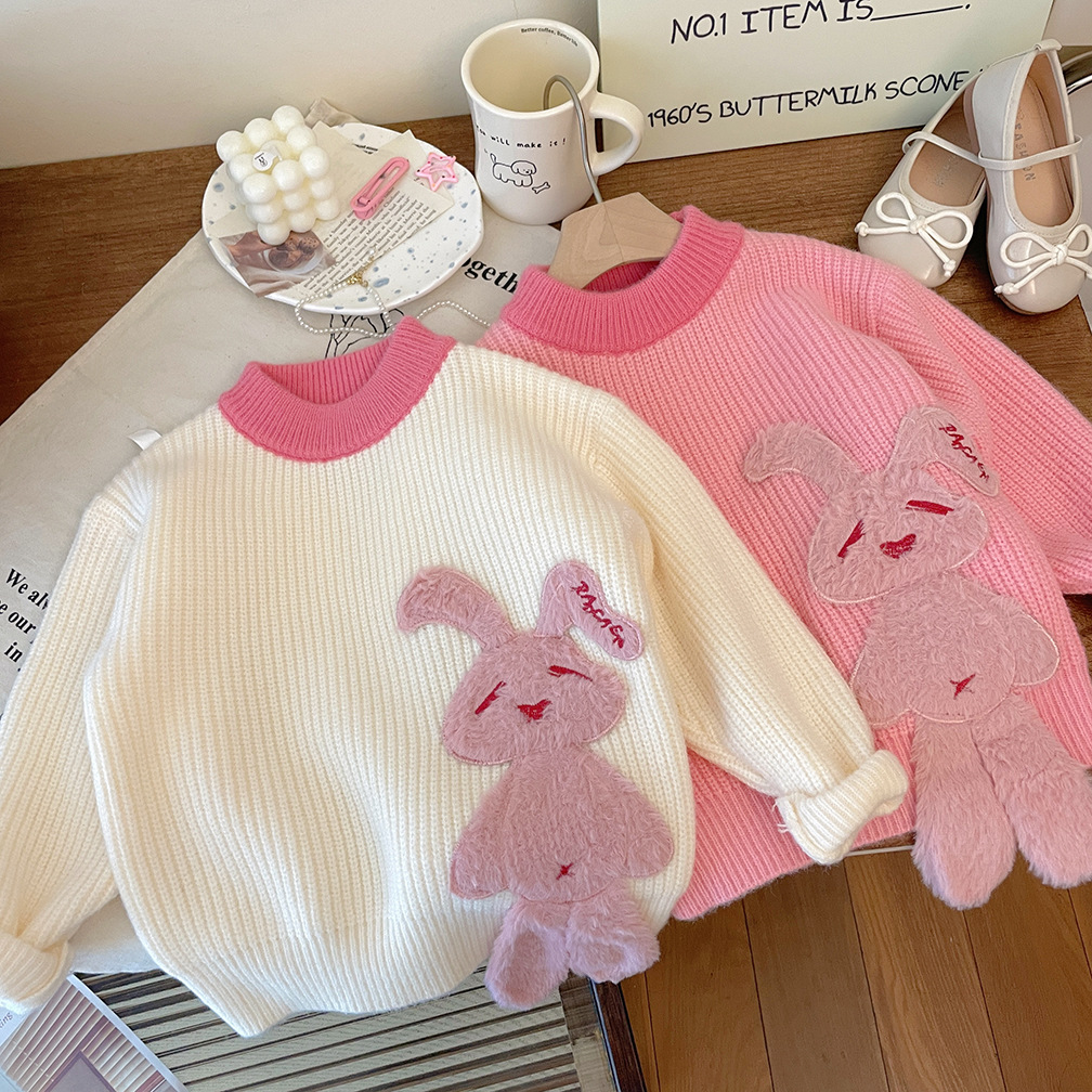 한국 스타일 아동복 2025 겨울 신상 여아 입체 만화 토끼 귀엽고 달콤한 풀오버 라운드 넥 니트 스웨터