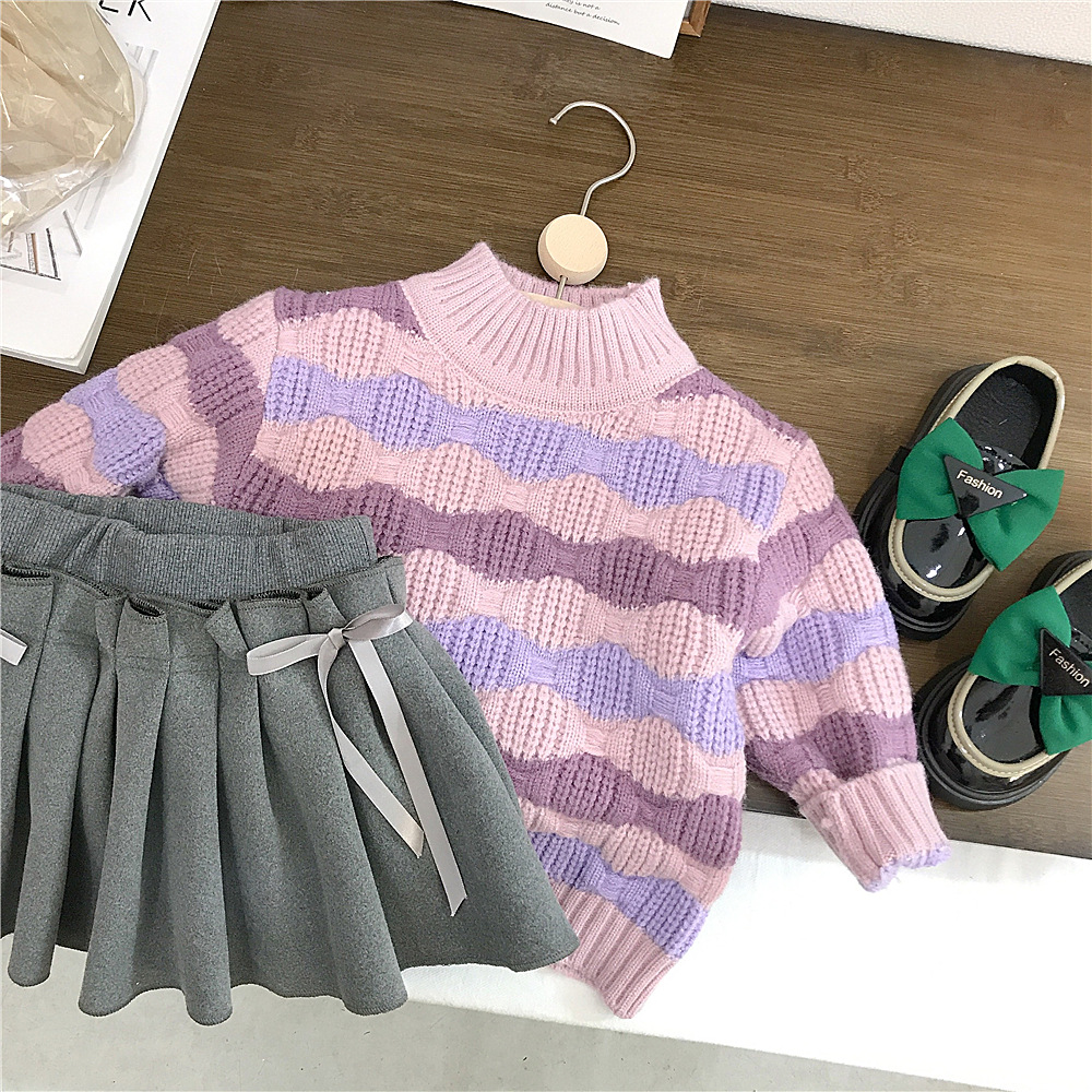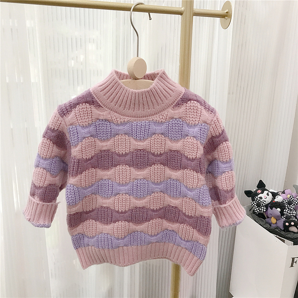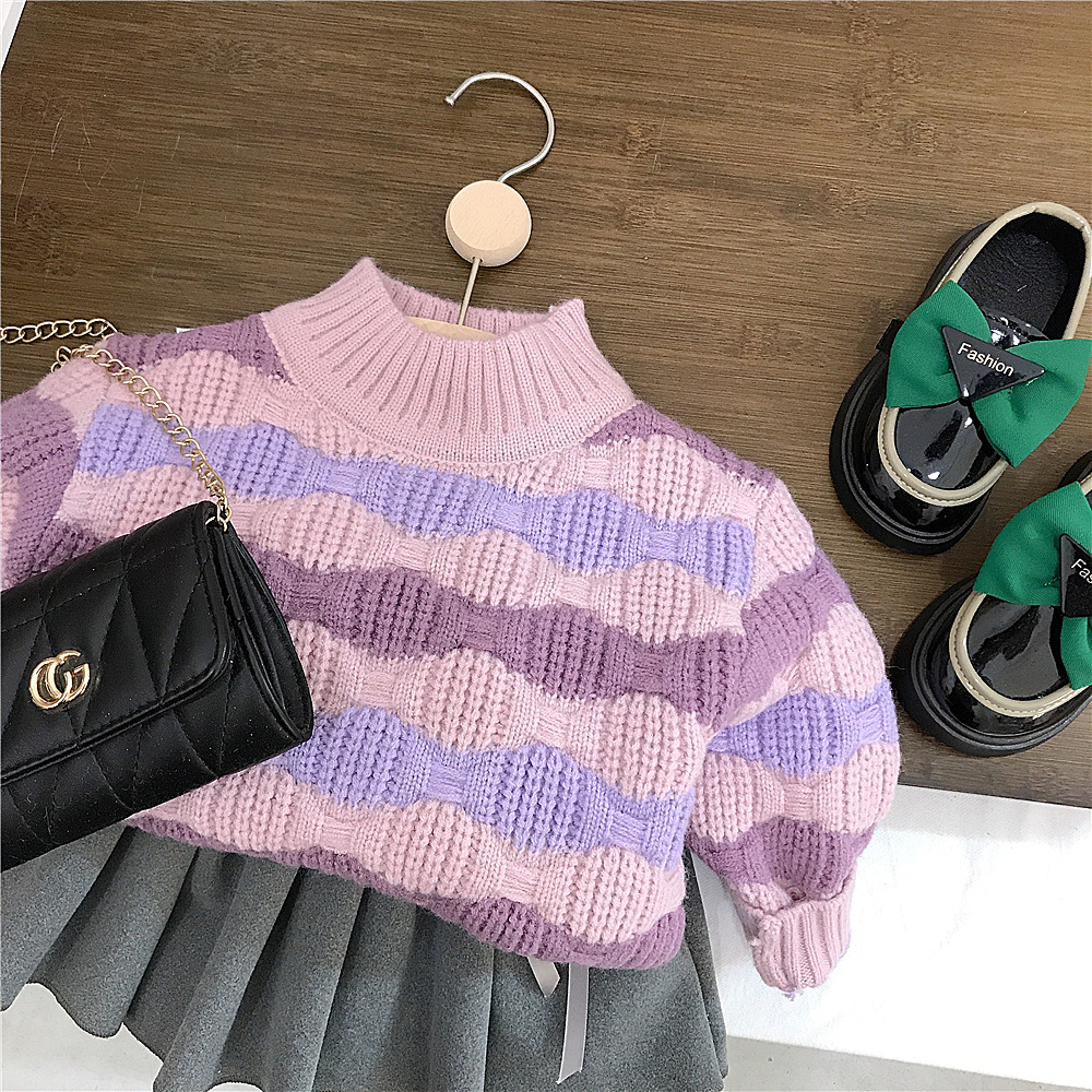 여아 스웨터 가을과 겨울 새로운 어린이 겨울 따뜻한 웨이브 스트라이프 아기 소녀 겨울 보라색 니트 스웨터