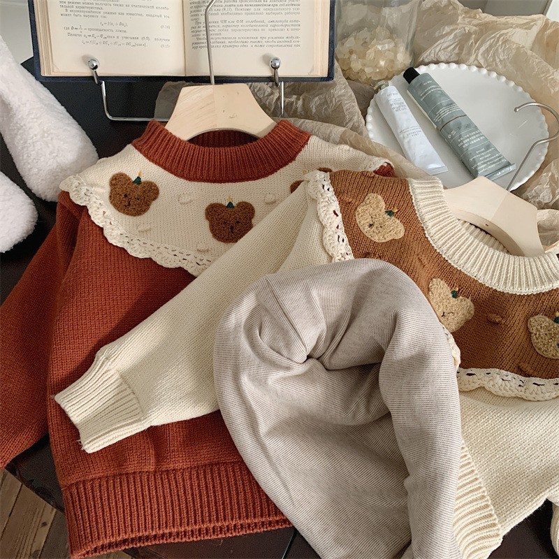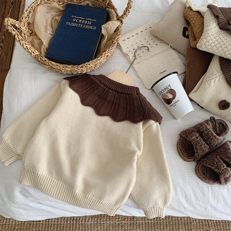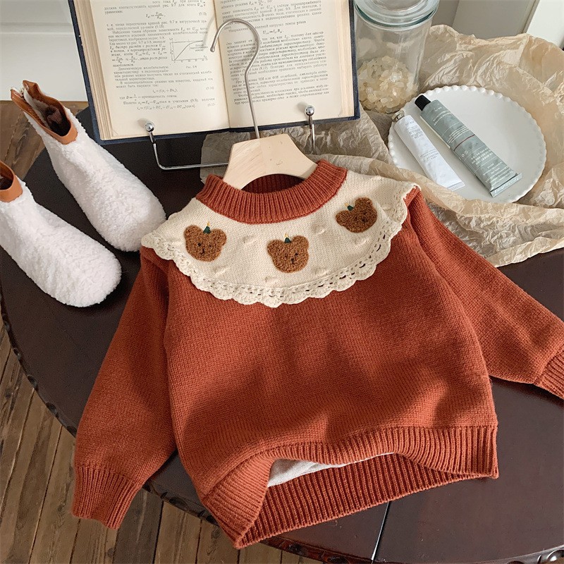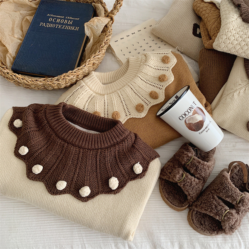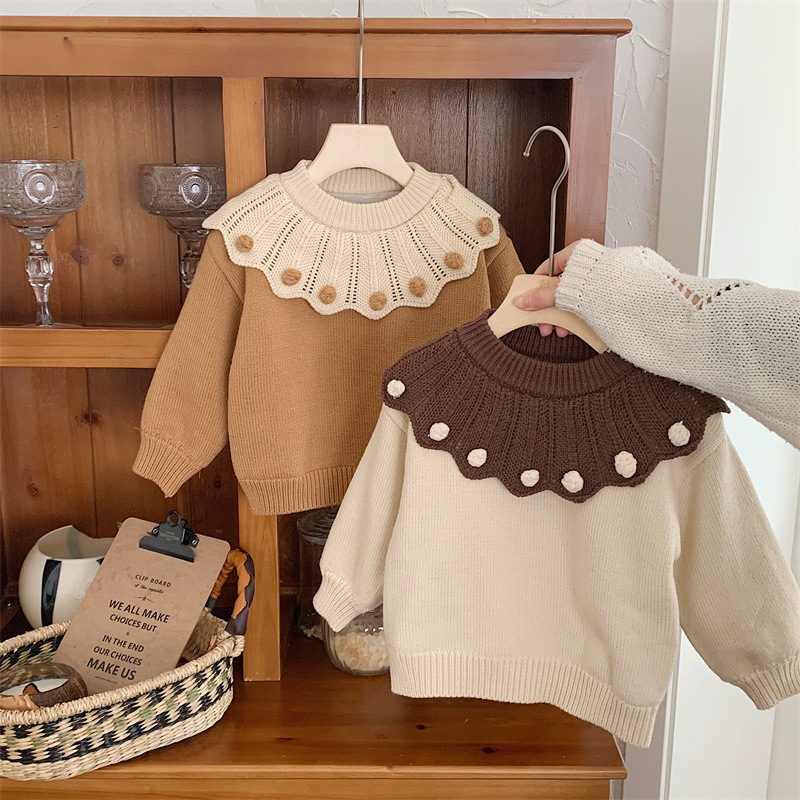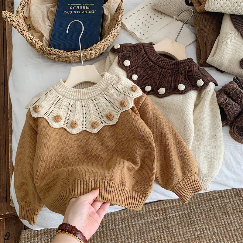 가을 겨울 여아용 볼라운드 레이스 라펠 스웨터, 유아 및 어린이용 세련된 풀오버, 기모 및 두꺼운 상의, 한국 스타일 아동복스토어 가기