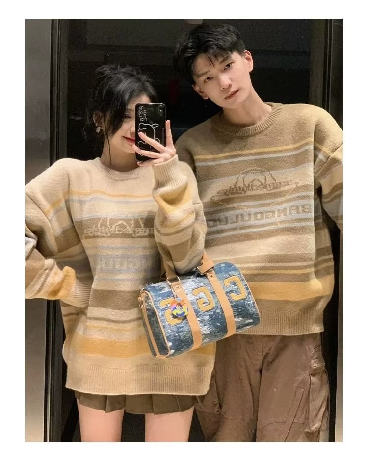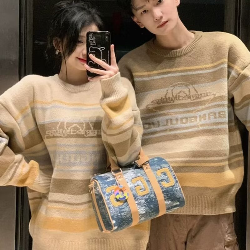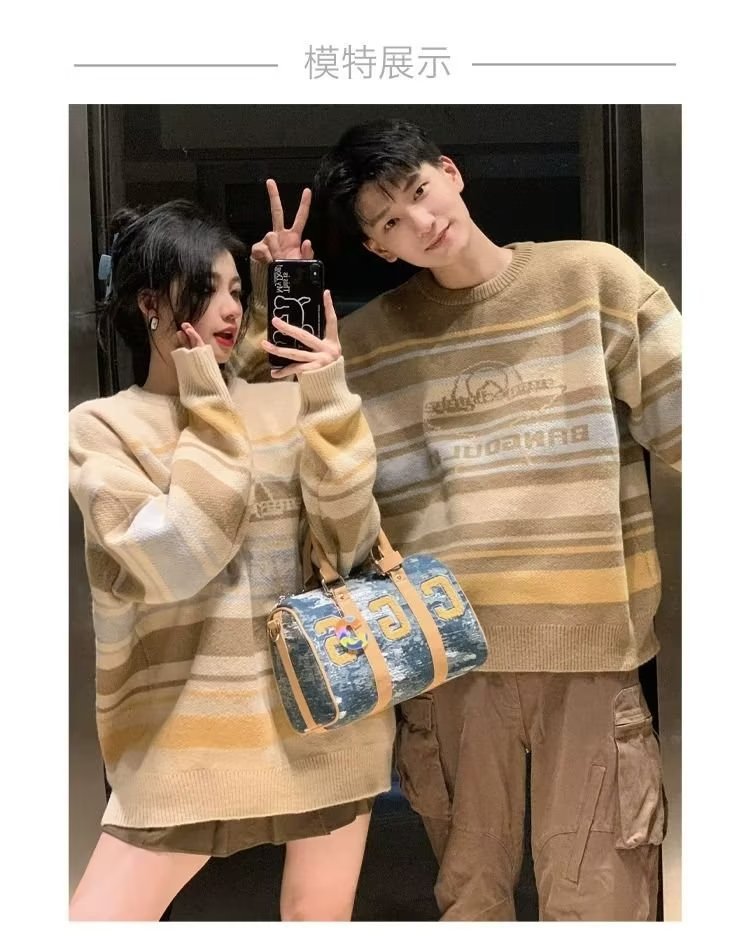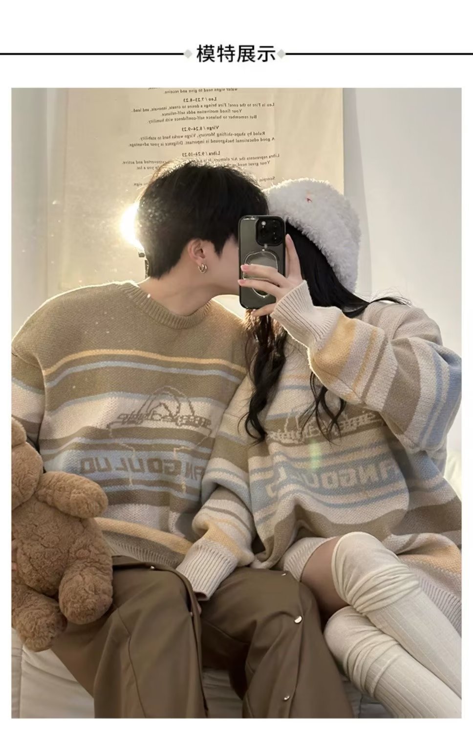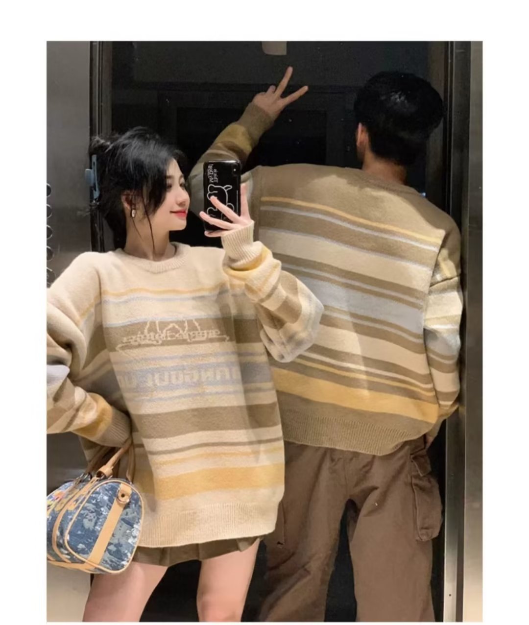 레트로 스트라이프 스웨터 남자의 가을과 겨울 느슨한 캐주얼 게으른 스타일 미국 라운드 넥 니트 스웨터 커플 패션 브랜드스토어 가기