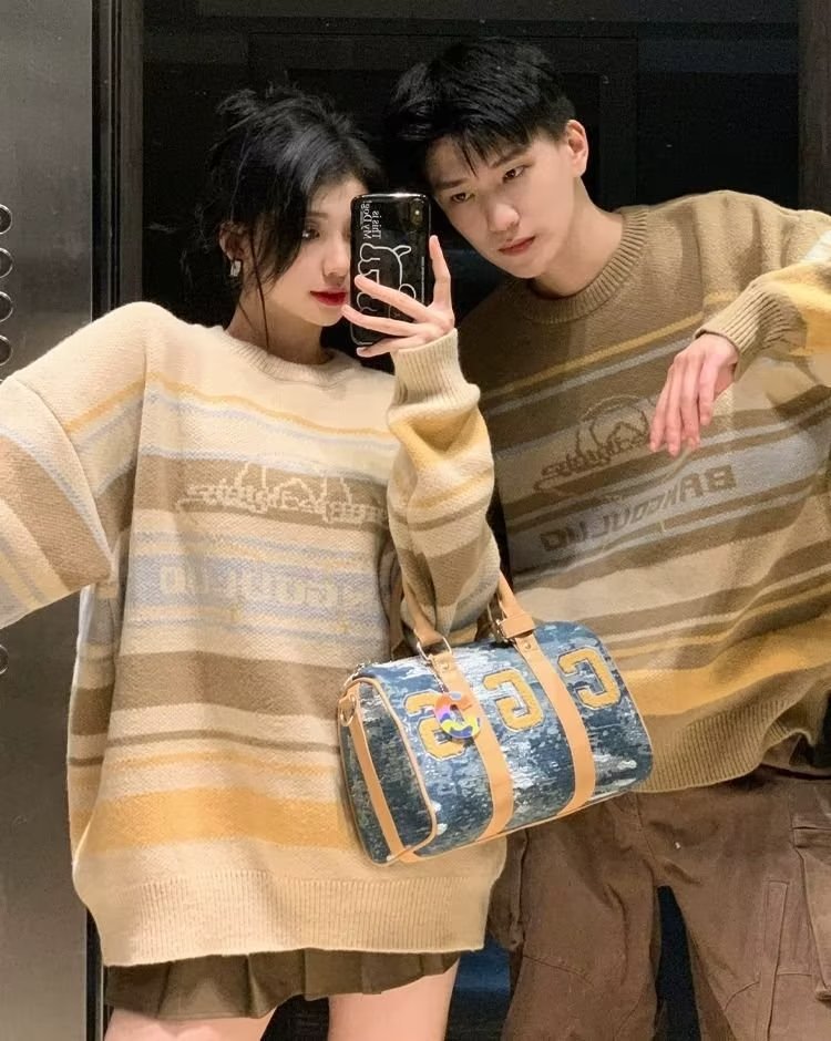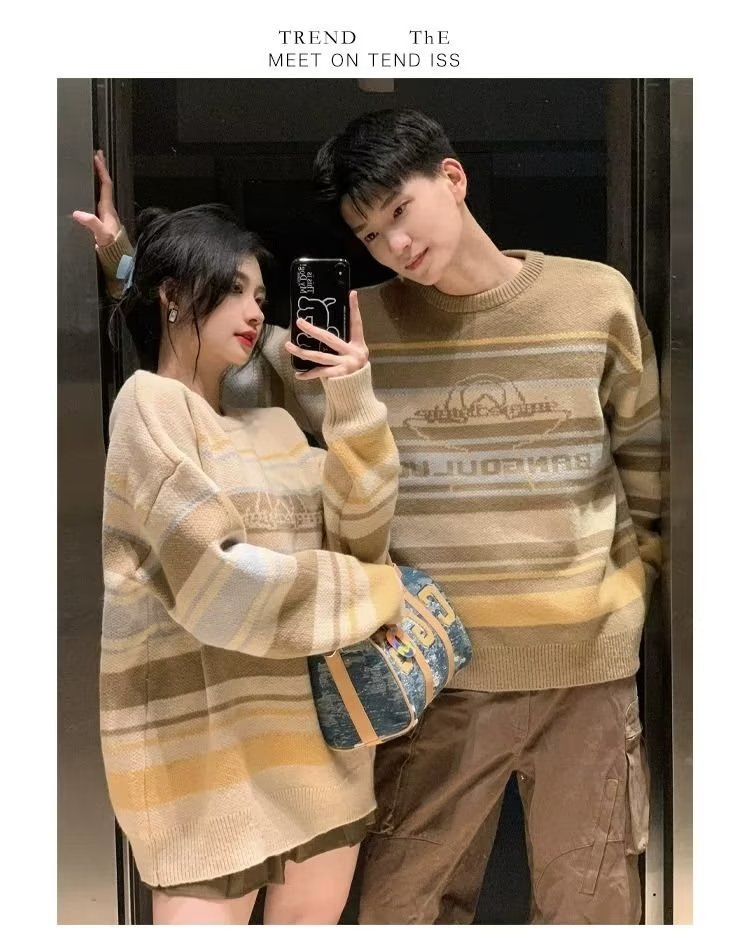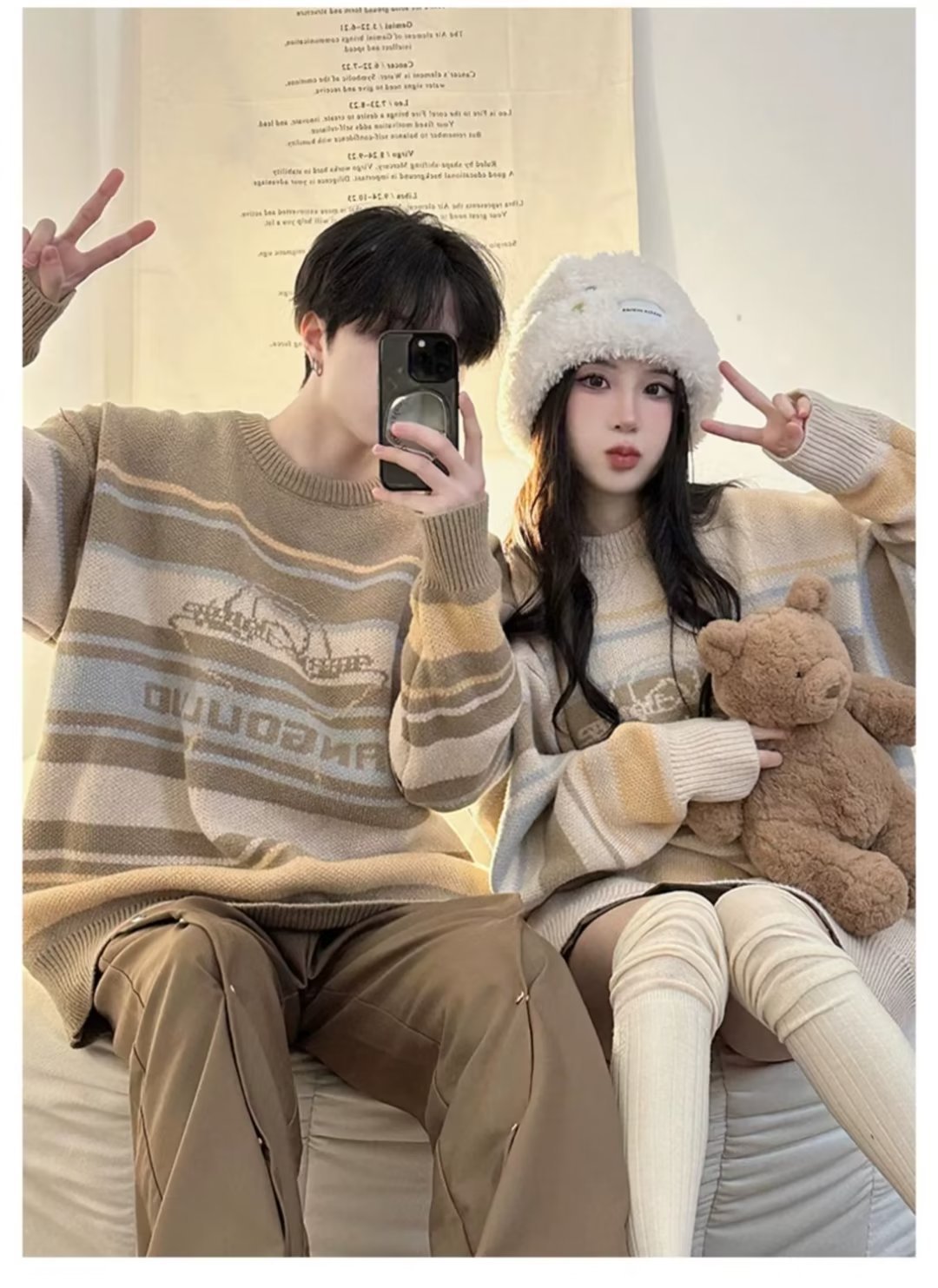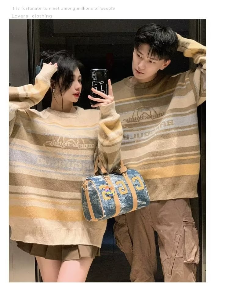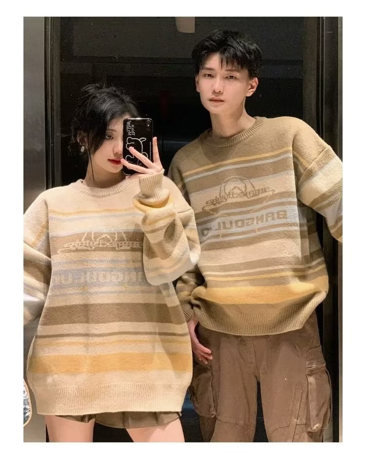 레트로 스트라이프 스웨터 남자의 가을과 겨울 느슨한 캐주얼 게으른 스타일 미국 라운드 넥 니트 스웨터 커플 패션 브랜드스토어 가기