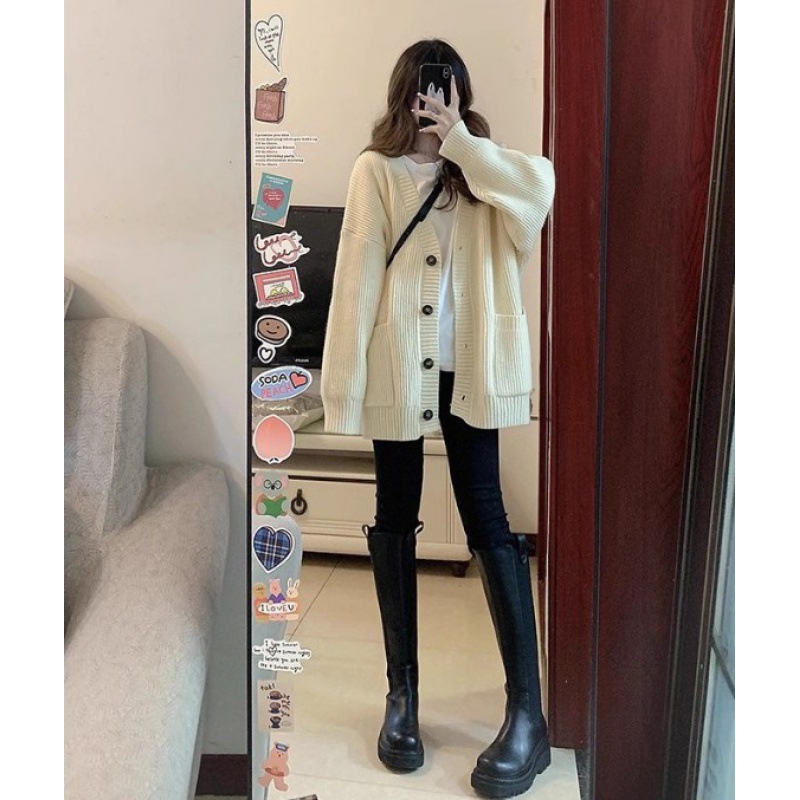 긴 가을과 겨울 대학 스타일 한국 스타일 느슨한 게으른 V-넥 다용도 포켓 단색 니트 카디건 재킷 스웨터 여성용스토어 가기