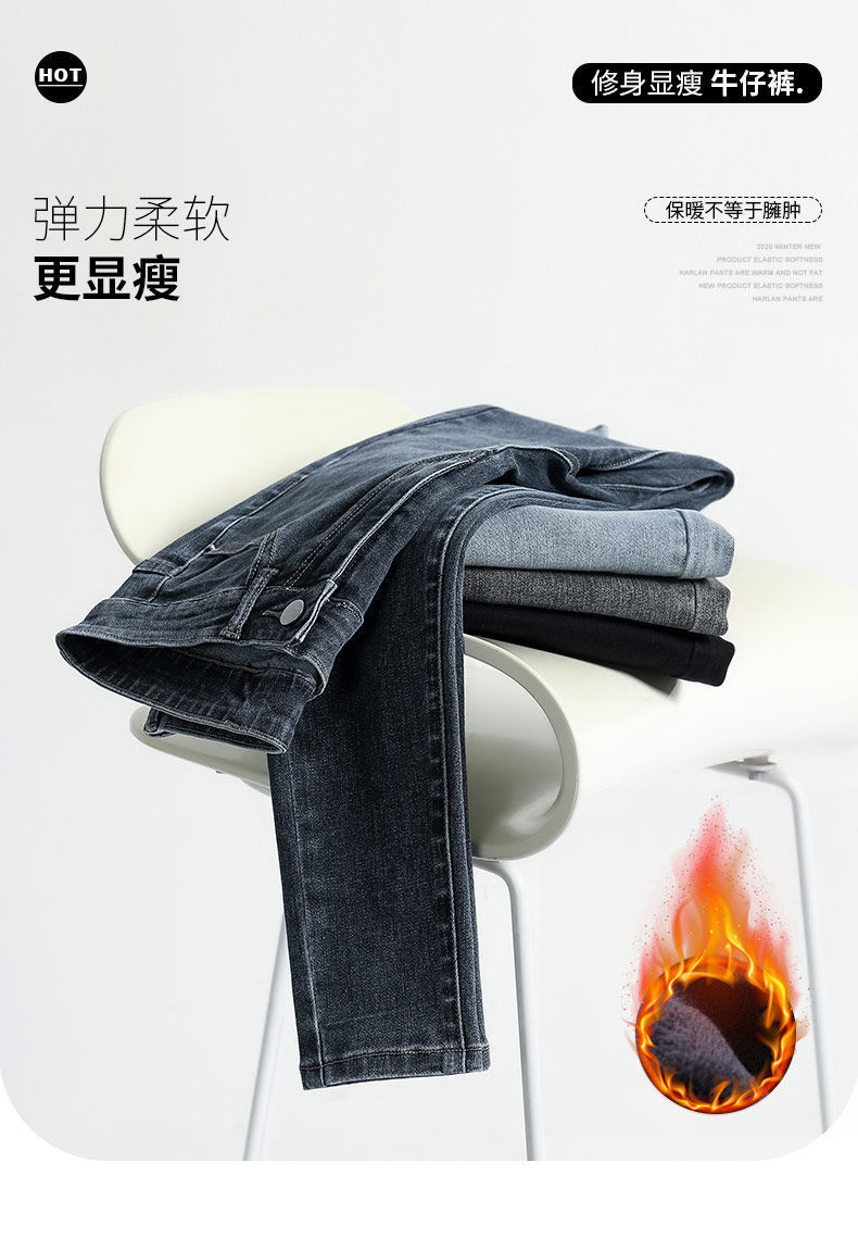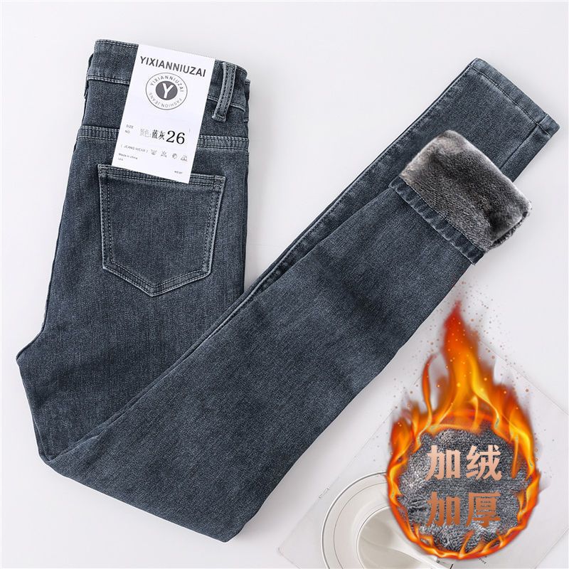 청바지 여자의 2023 가을과 겨울 새로운 하이 웨이스트 슬림 핏 슬리밍 탄성 꽉 기모 두꺼운 연필 바지스토어 가기