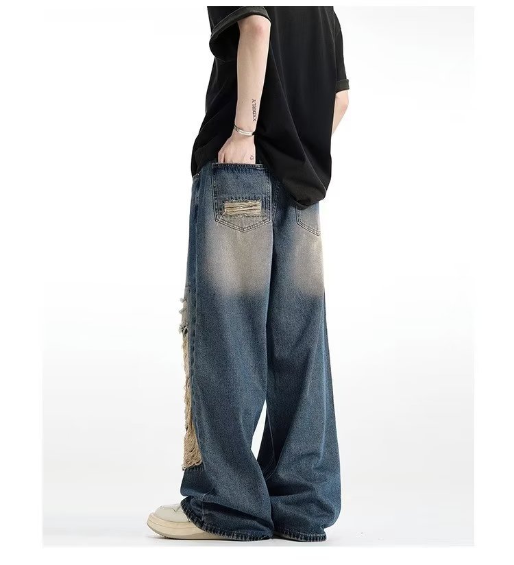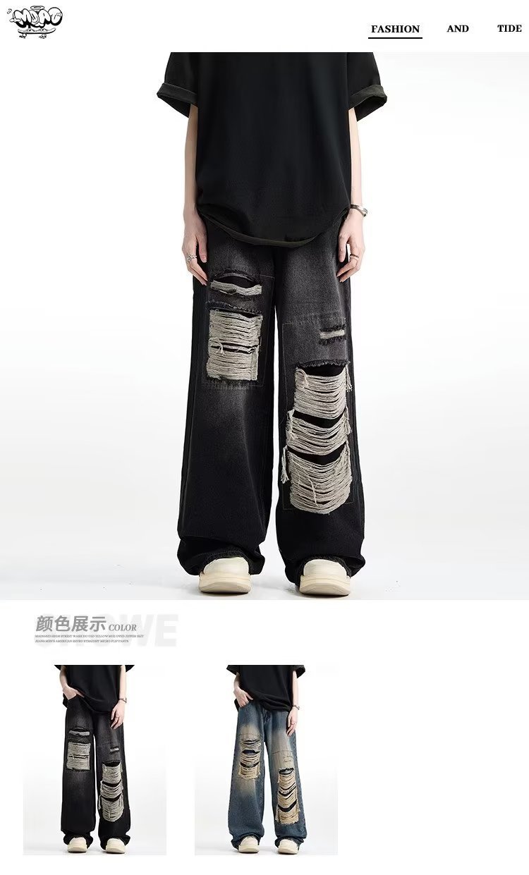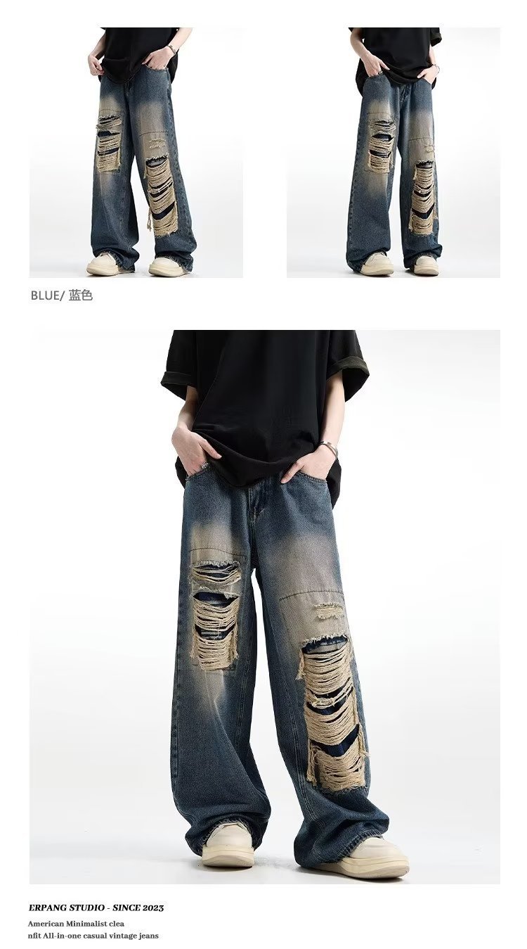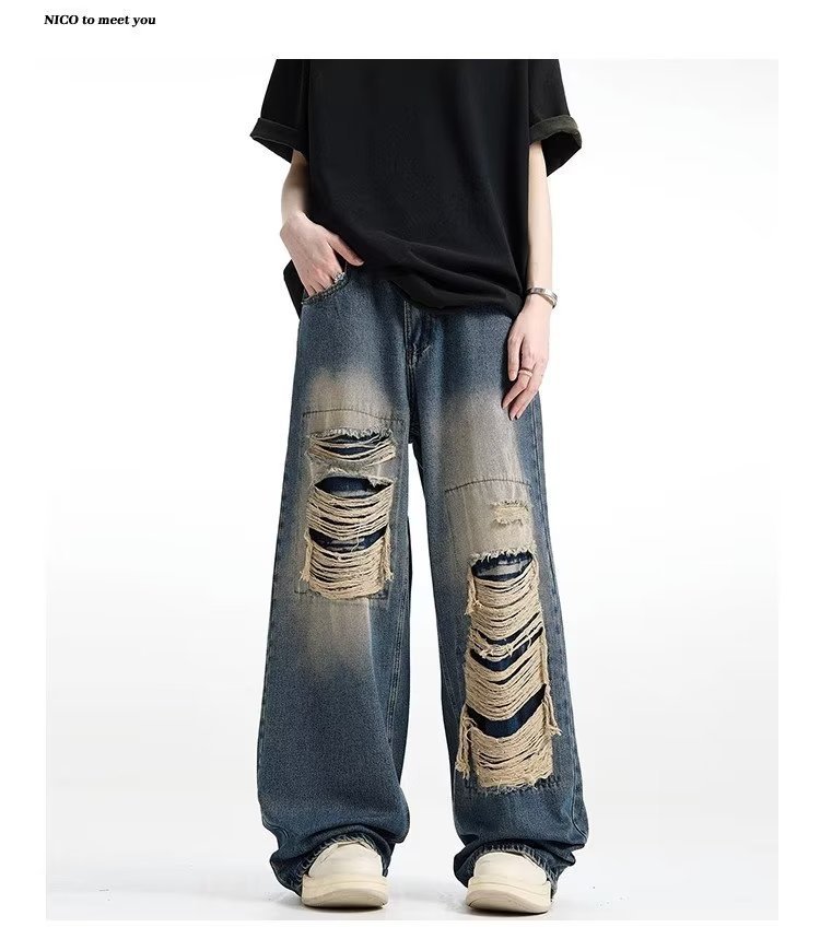 아메리칸 스타일 레트로 찢어진 청바지 남자의 여름 씻어 올드 느슨한 와이드 다리 스트레이트 튜브 트렌디 브랜드 하이 스트리트 팬츠스토어 가기